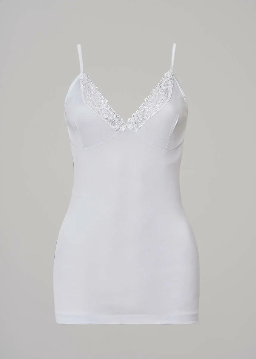 Canotta donna spallina stretta con forma seno, con pizzo macramรจ, in confortevole tessuto a costina di Filo di Scozia – Prodotto Interamente in Italia