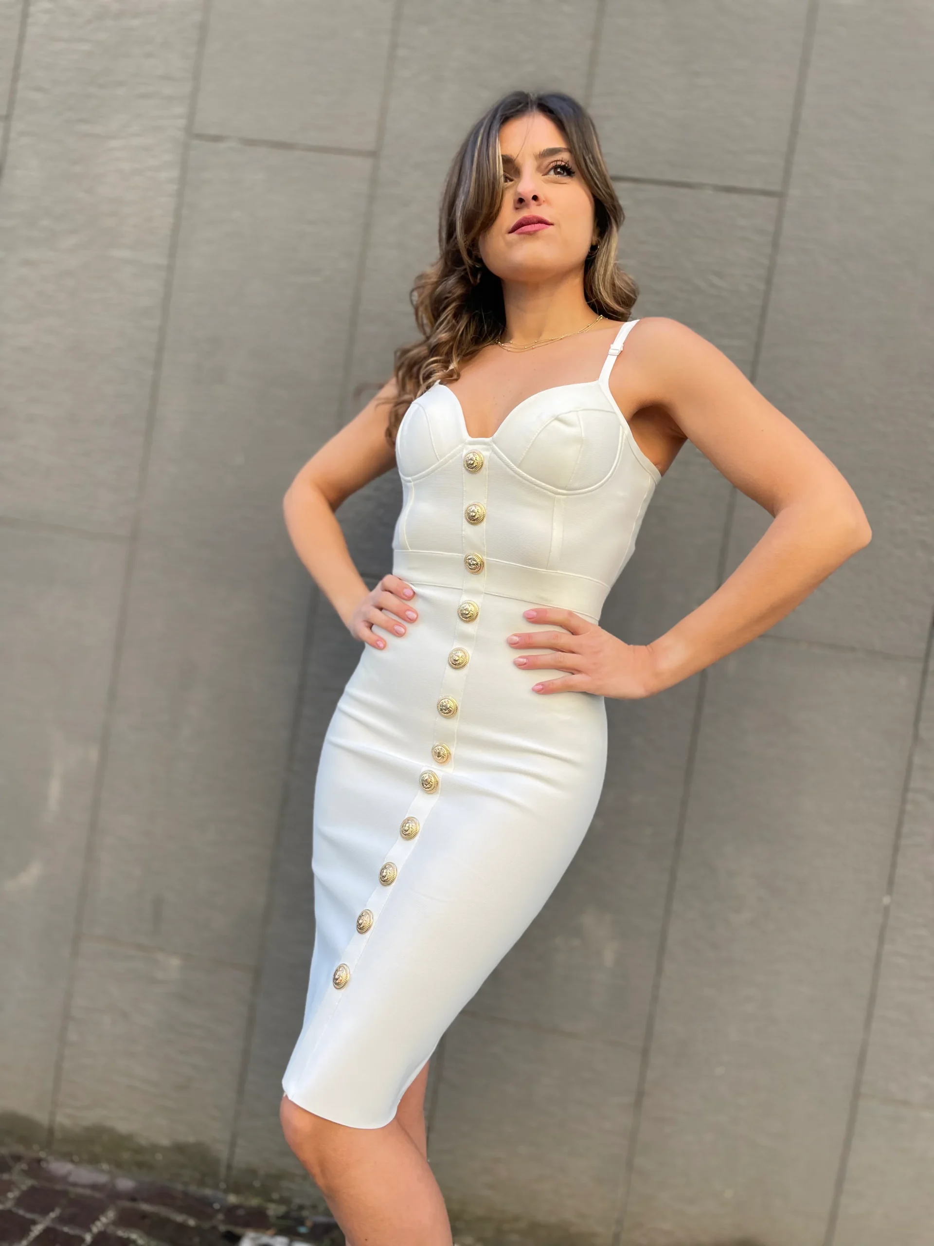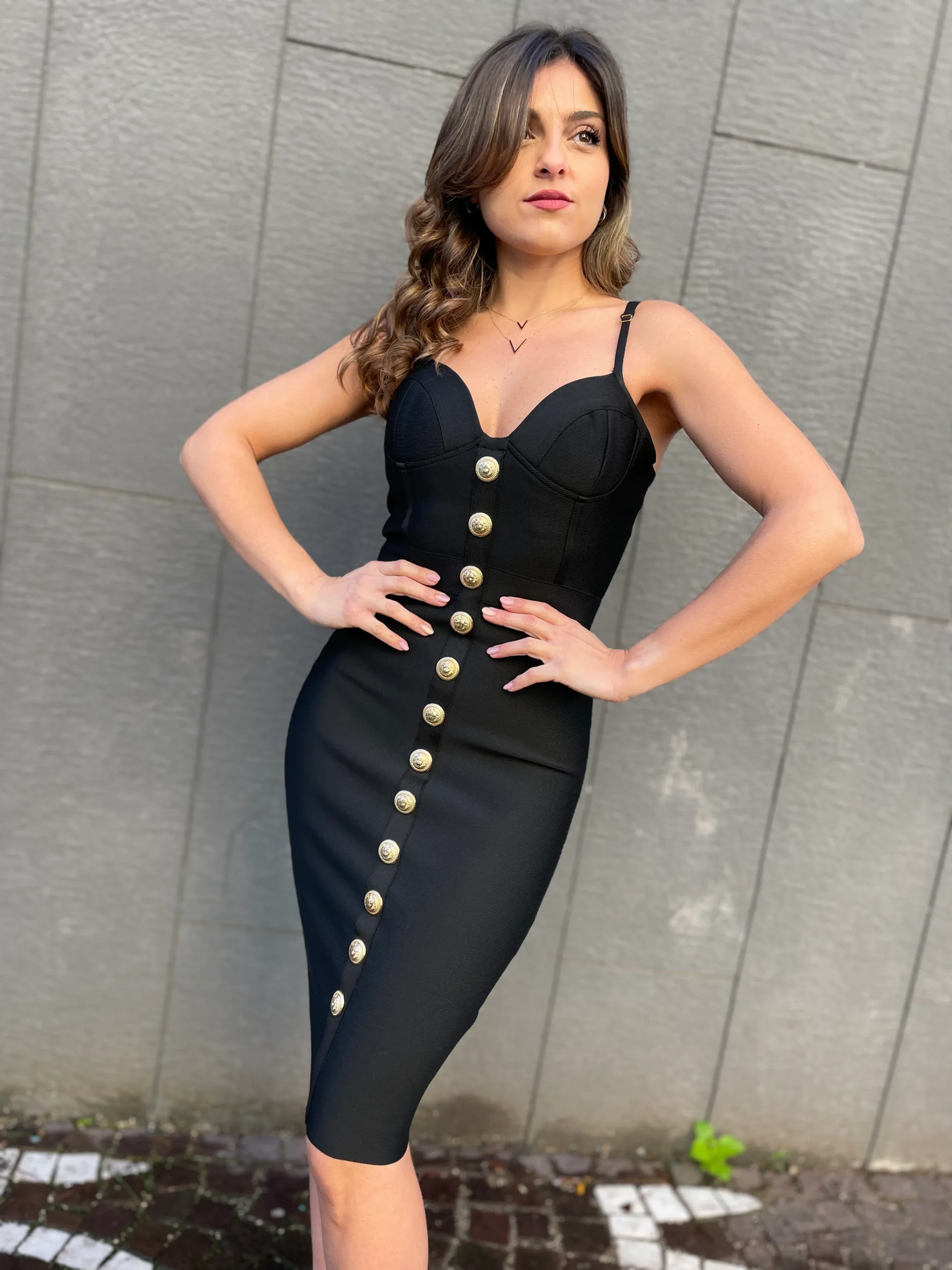 Abito bandage scollo a cuore lunghezza midi bottoncini oro zip sul retro bretelle regolabili