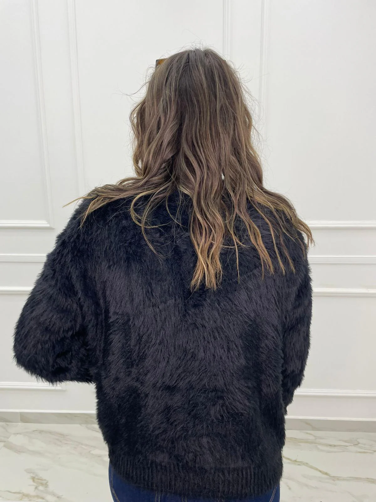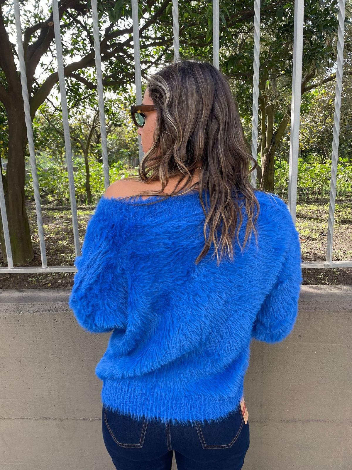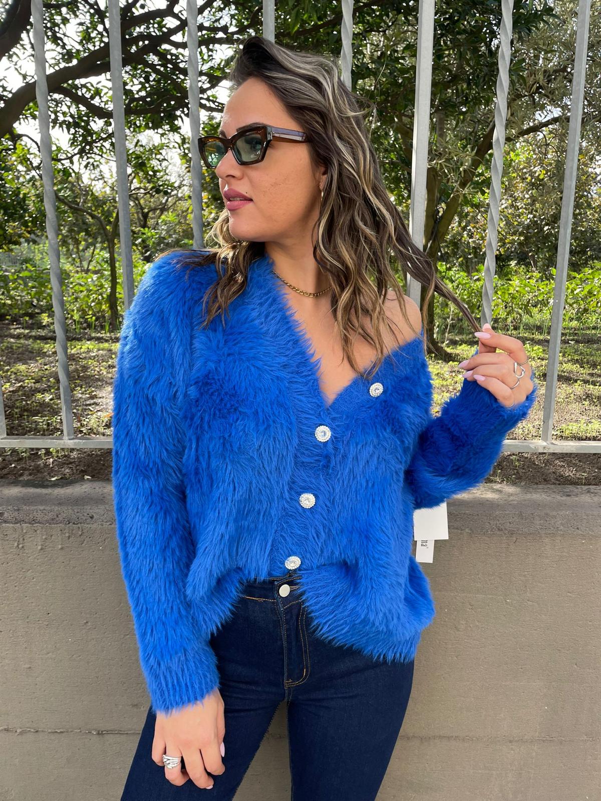 – Cardigan tinta unita – In pelo – Bottoni swarovski – Scollo a V – Elasticizzato – Veste tranquillamente fino ad una taglia “L” – Tessuto: acrilico, poliamide