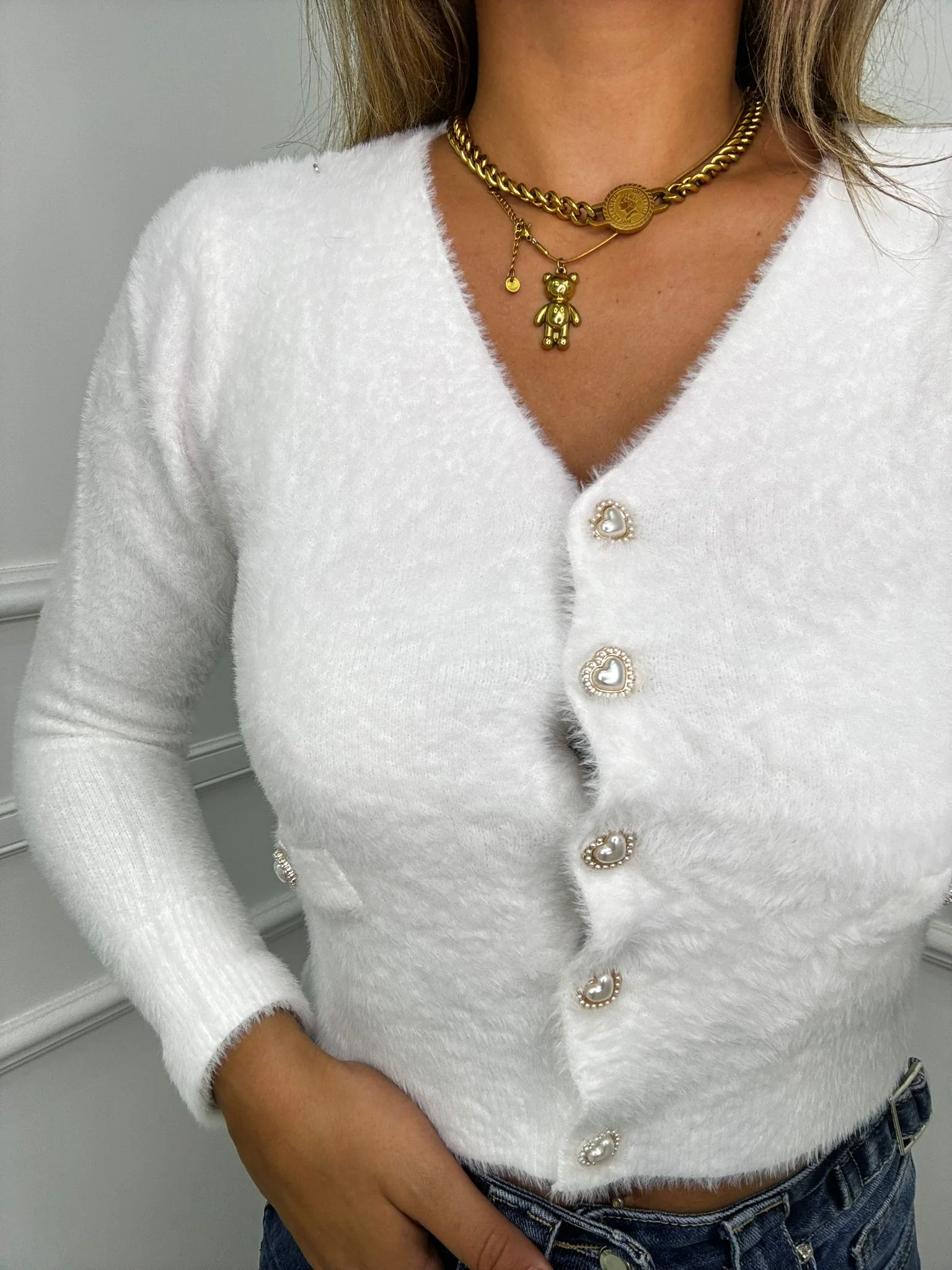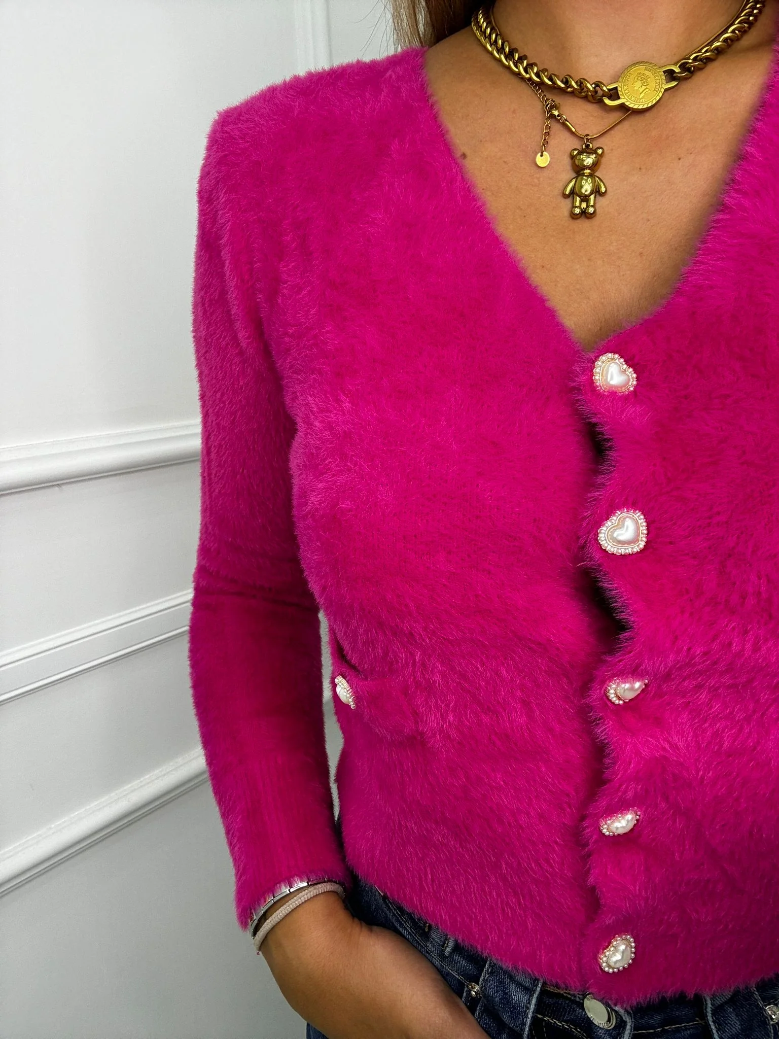 Cardigan in pelo con bottoni swarovski