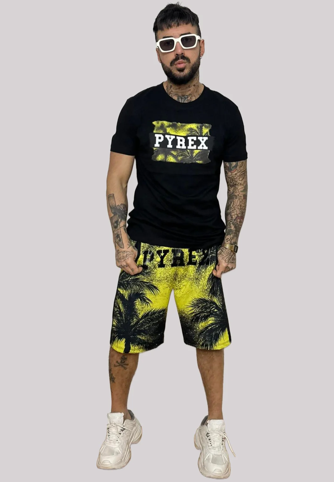 Completino estivo PYREX t-shirt+ bermuda in rete stampa Esotic nero/giallo