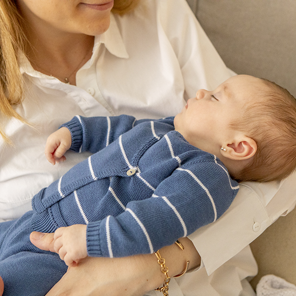 - Il ponticello ha un’apertura sul davanti che si chiude con un bottone per facilitare il cambio dei vestiti del bambino e per poter curare bene il cordone ombelicale.