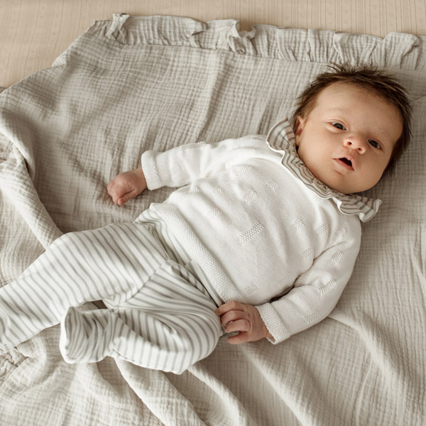 Completo per la prima nascita composto da 2 pezzi. Include una maglia in tricot con lavorazione traforata in rilievo e un delicato colletto a volant a righe, con chiusura posteriore con bottoni per facilitare il cambio. I pantaloni con piedini sono morbidi e confortevoli. Un design senza tempo e funzionale, ideale per la valigia dell’ospedale o come regalo speciale per un neonato.