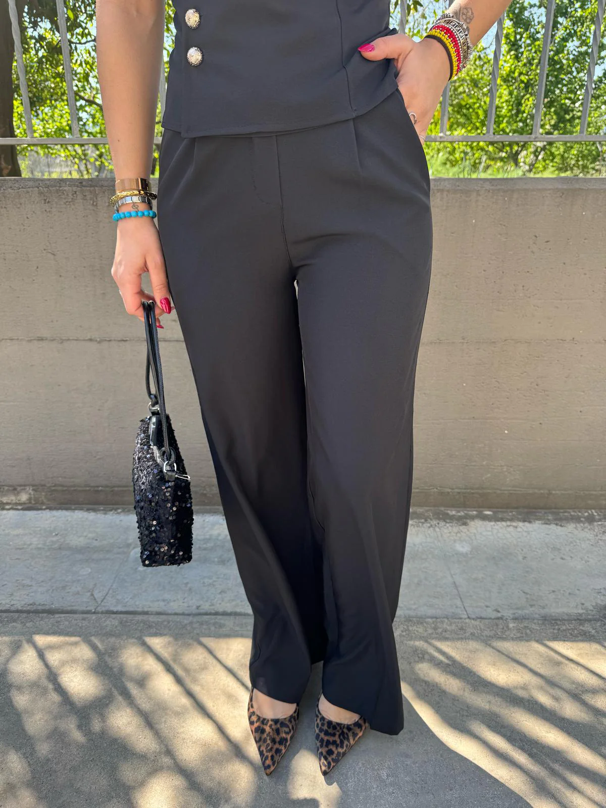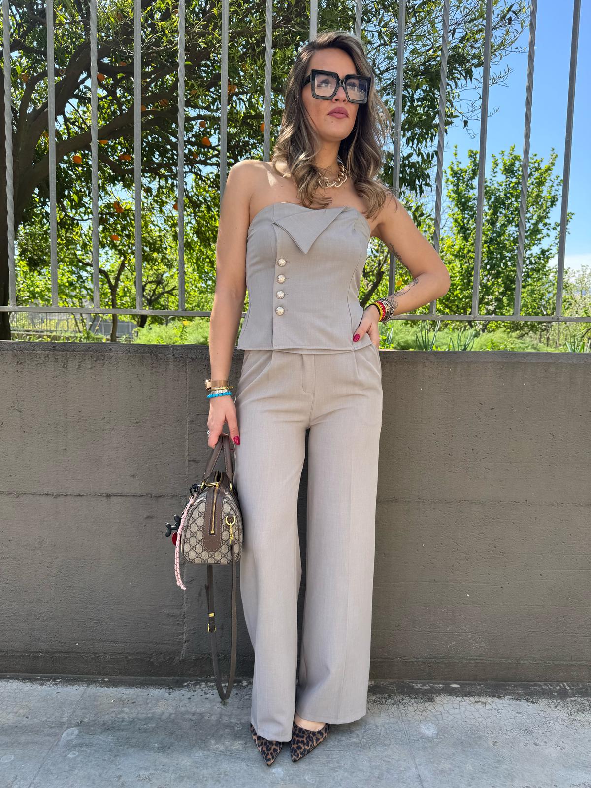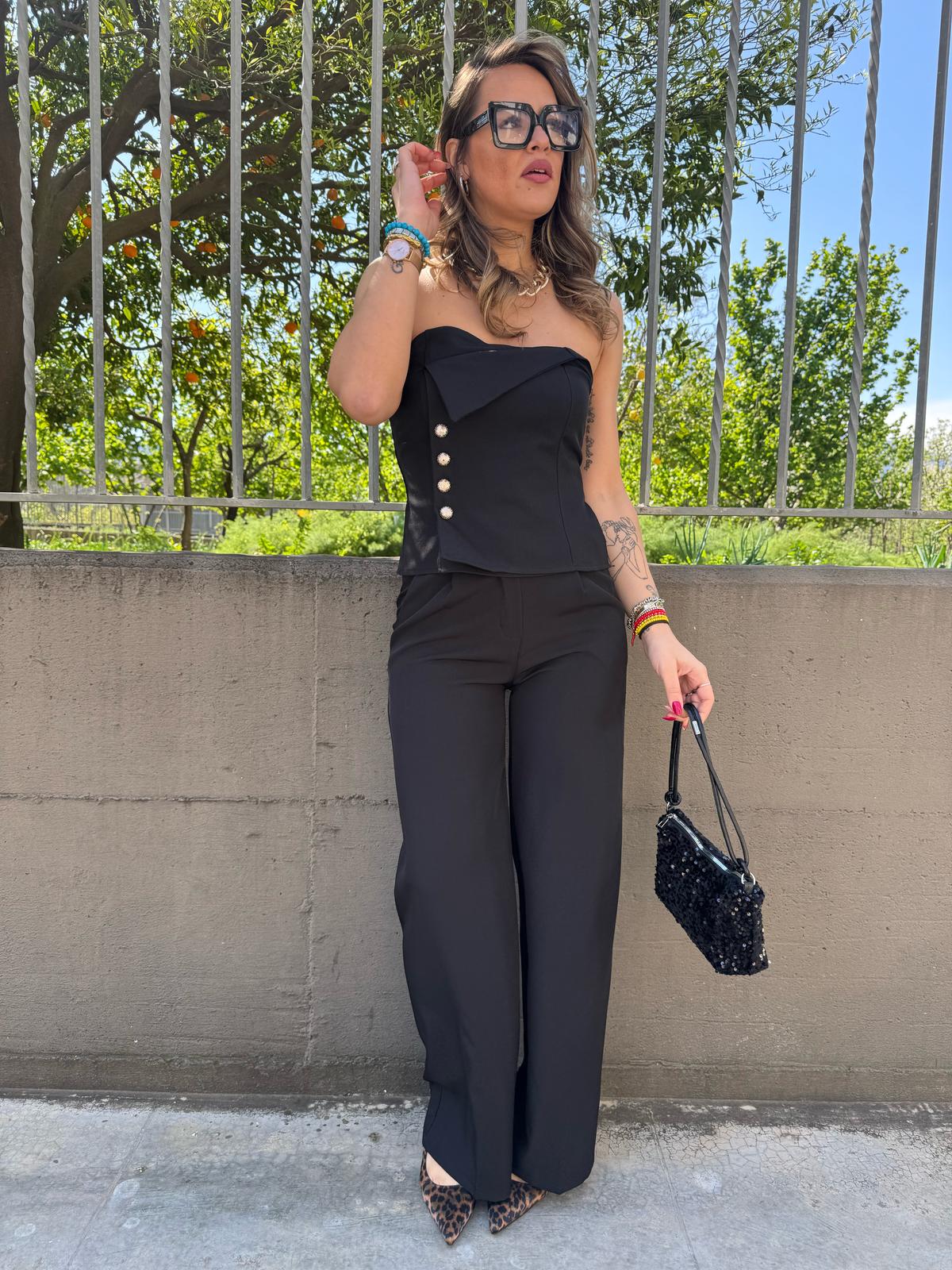 Coordinato 2 pezzi tinta unita Top avvitato con finti bottoni Pantalone palazzo con elastico dietro Veste fino ad una taglia “L” La modella รจ una taglia 44, alta 1,79m