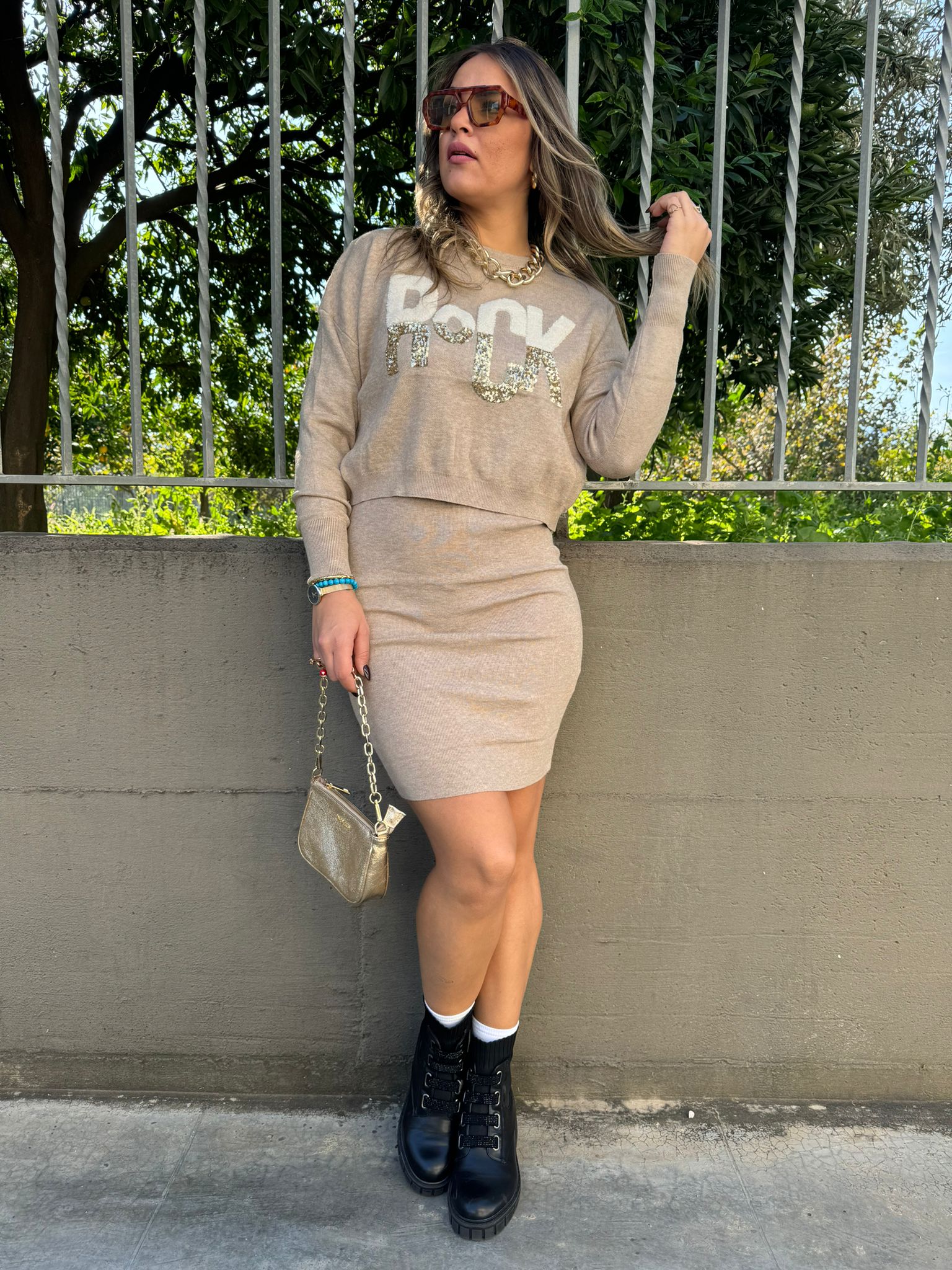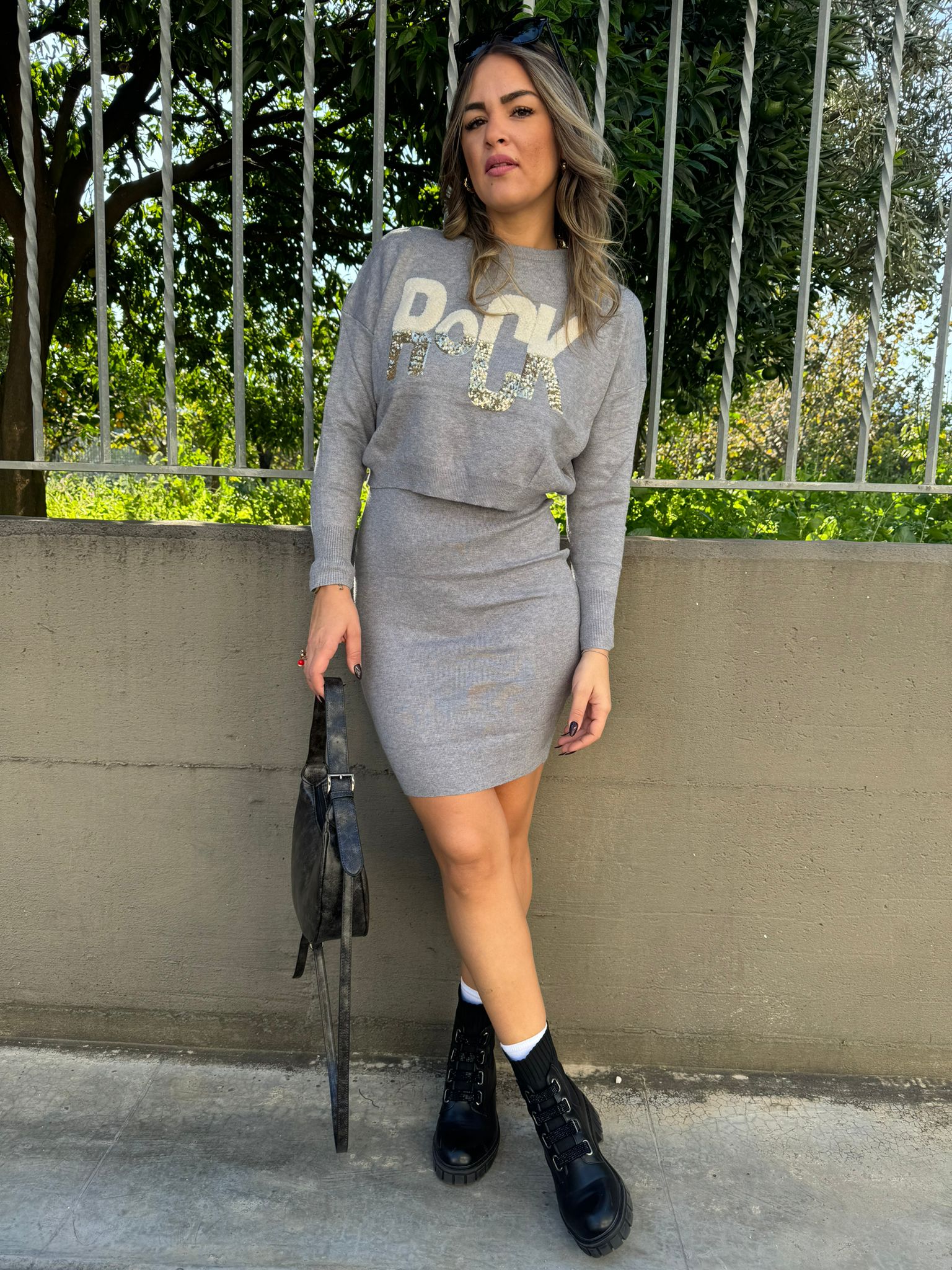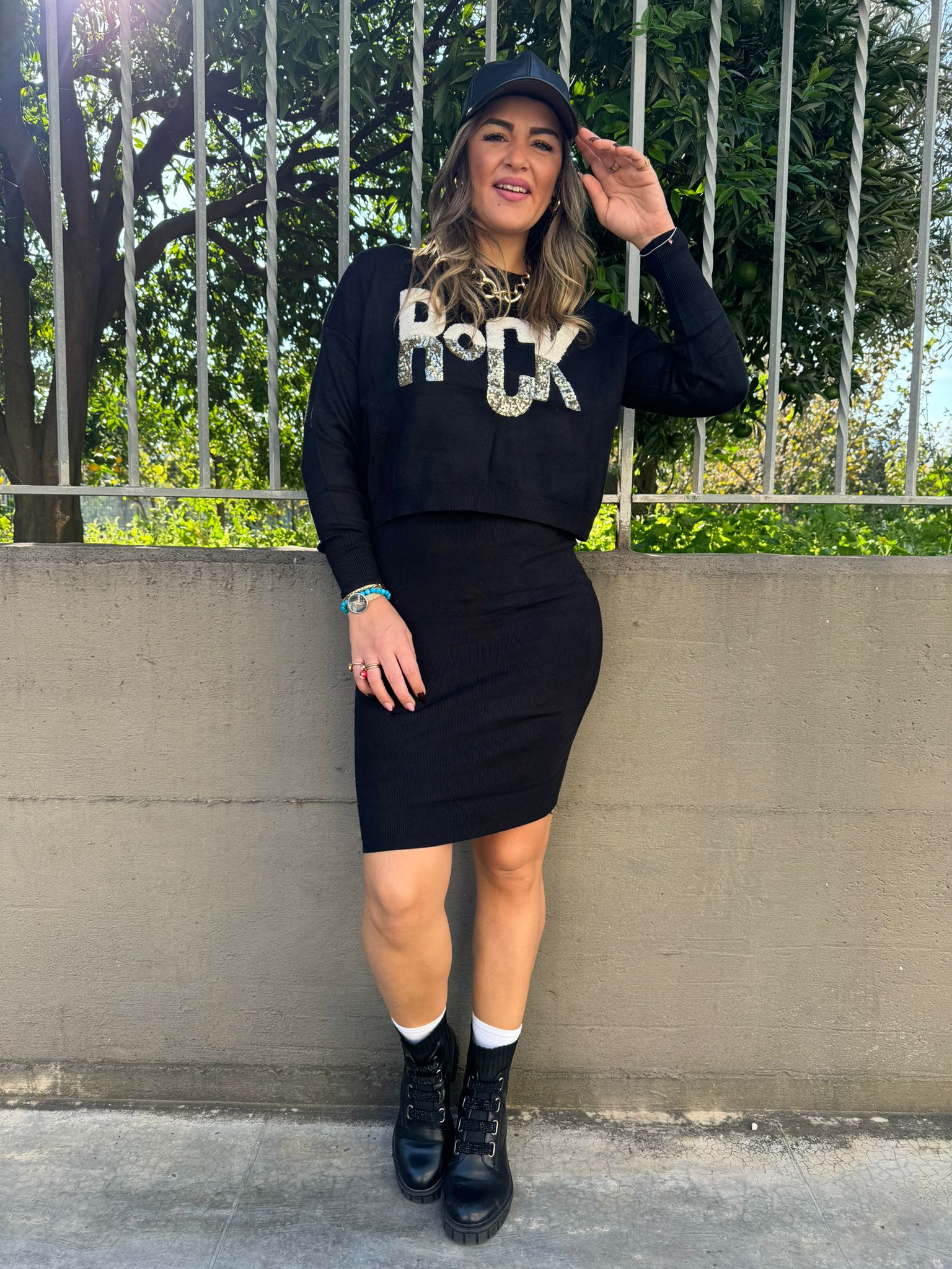 Coordinato 2 pezzi tinta unita Maglia giro collo con scritta in paillettes Vestito tinta unita Elasticizzato Veste tranquillamente fino ad una taglia “L” La modella รจ una taglia 44, alta 1,79m Tessuto: viscosa, poliestere, nylon