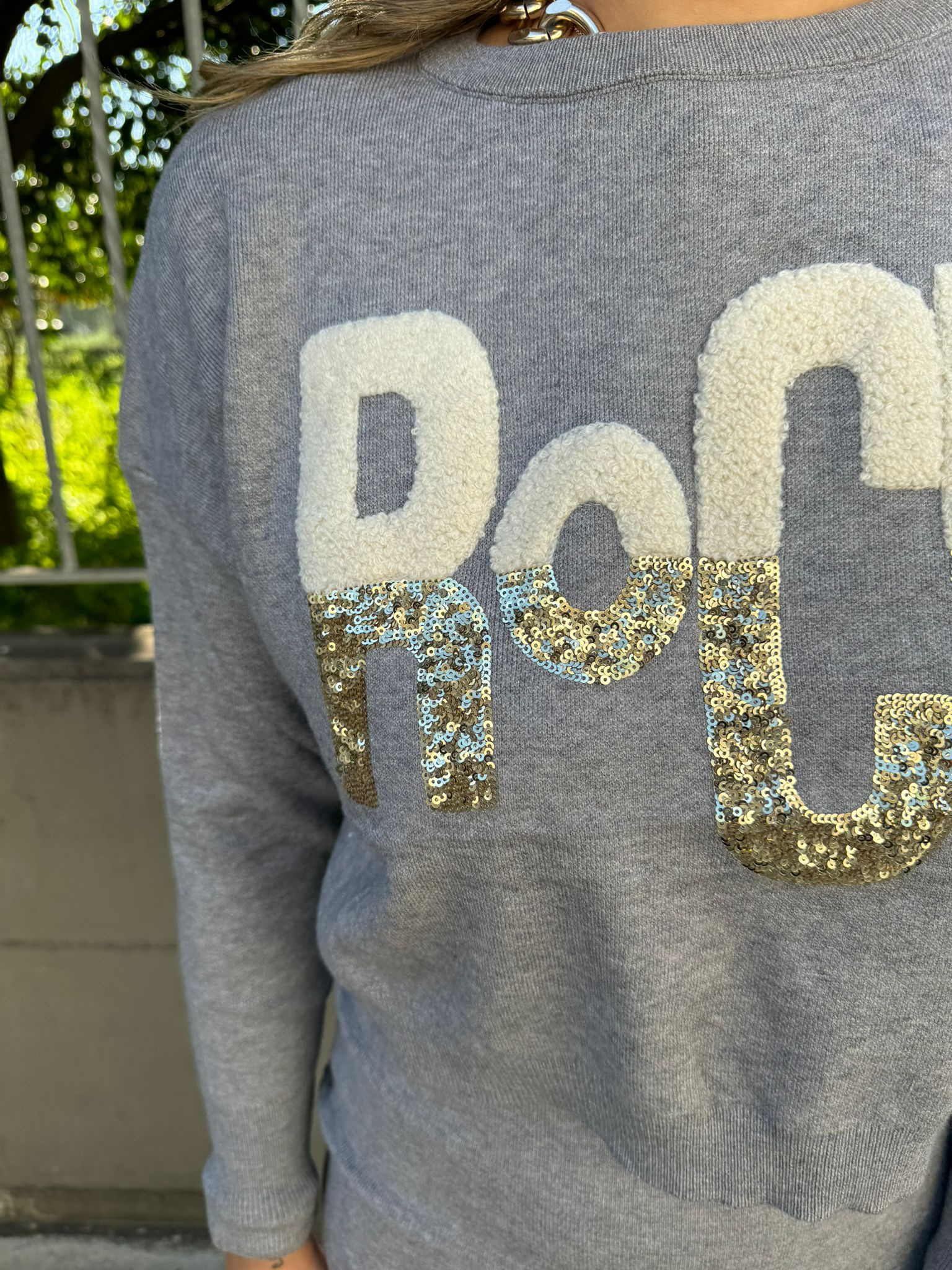 - Maglia giro collo con scritta in paillettes
