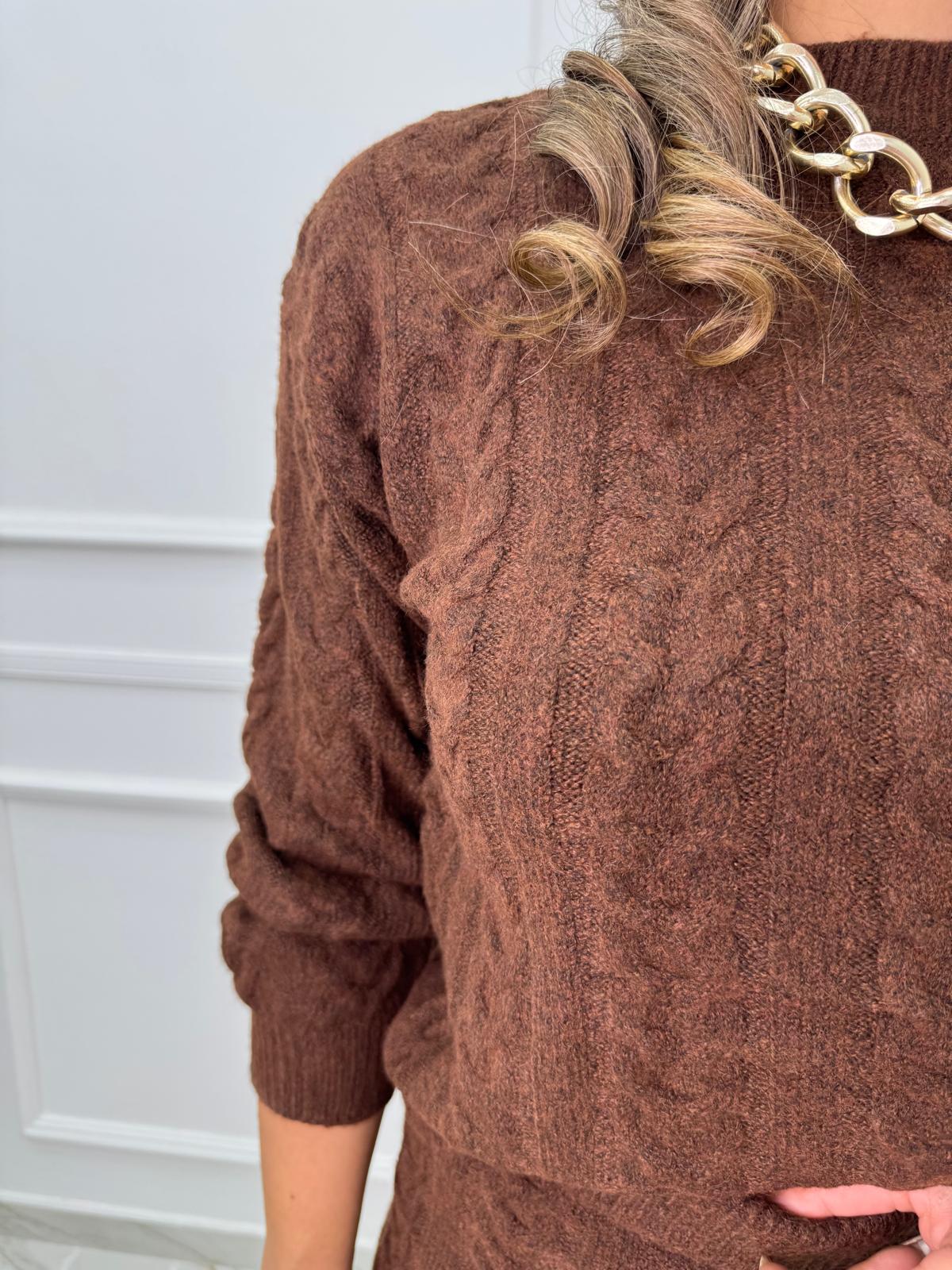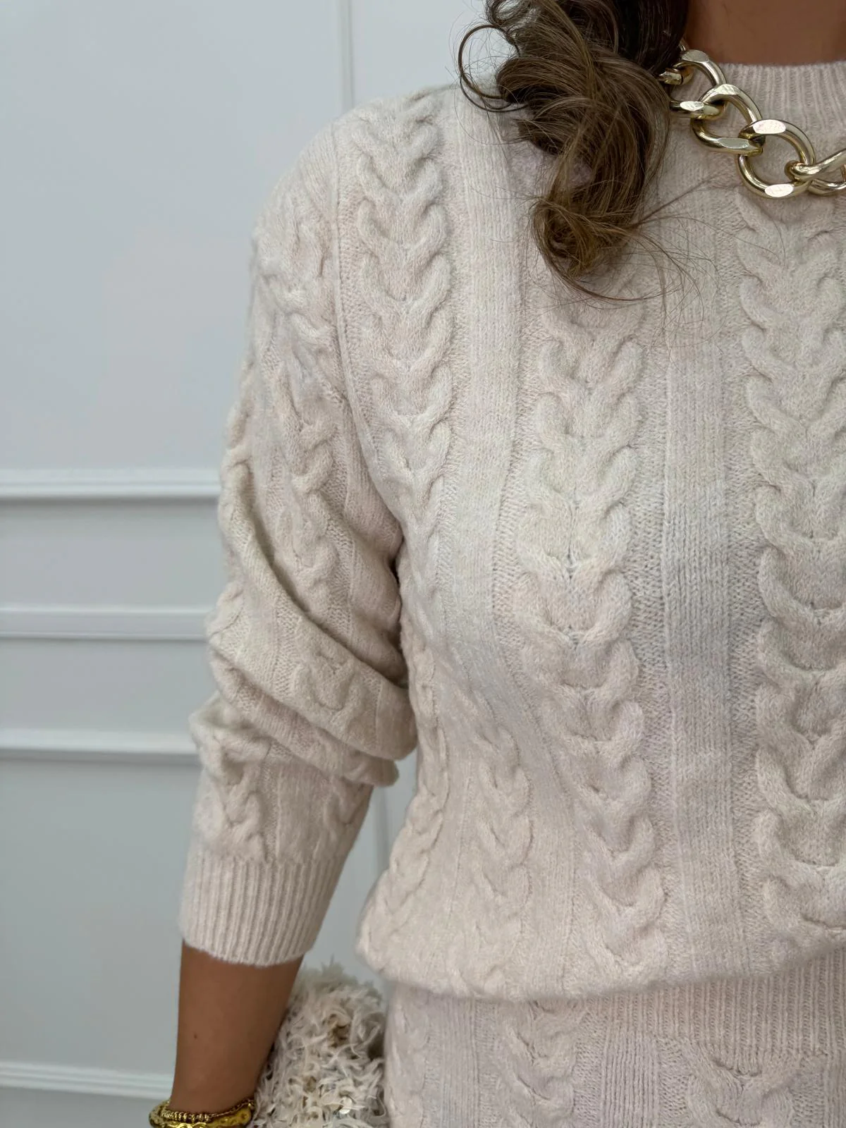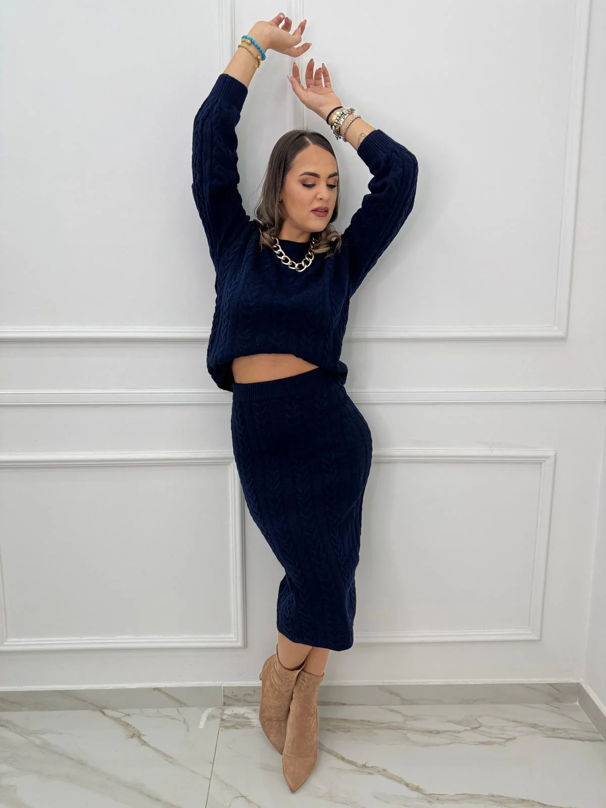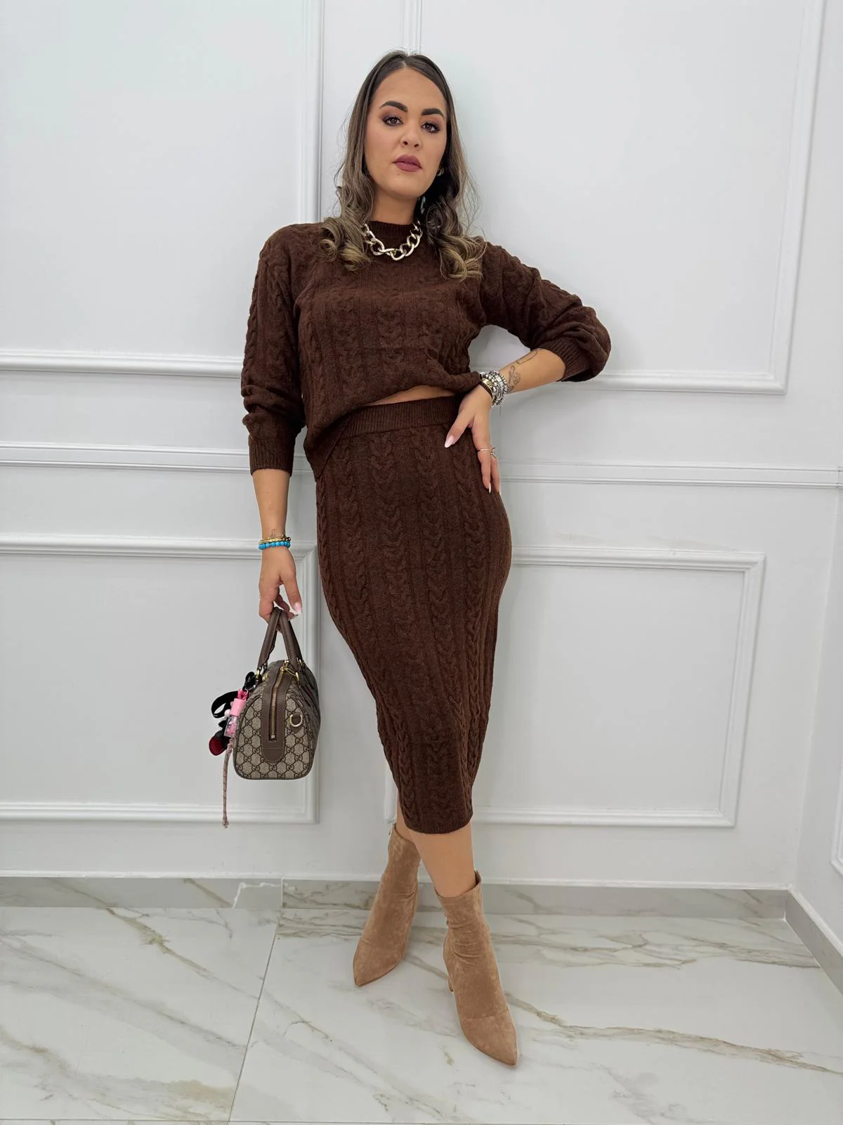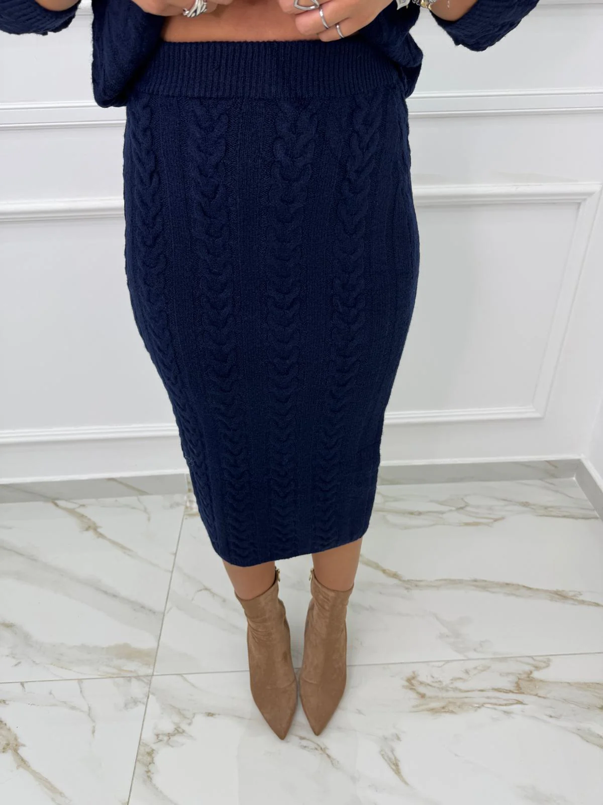Coordinato 2 pezzi tinta unita Trama treccia Maglia giro collo Gonna con elastico in vita Elasticizzato Veste tranquillamente fino ad una taglia “L” La modella รจ una taglia 44, alta 1,79m Tessuto: poliestere, poliamide, viscosa, lana