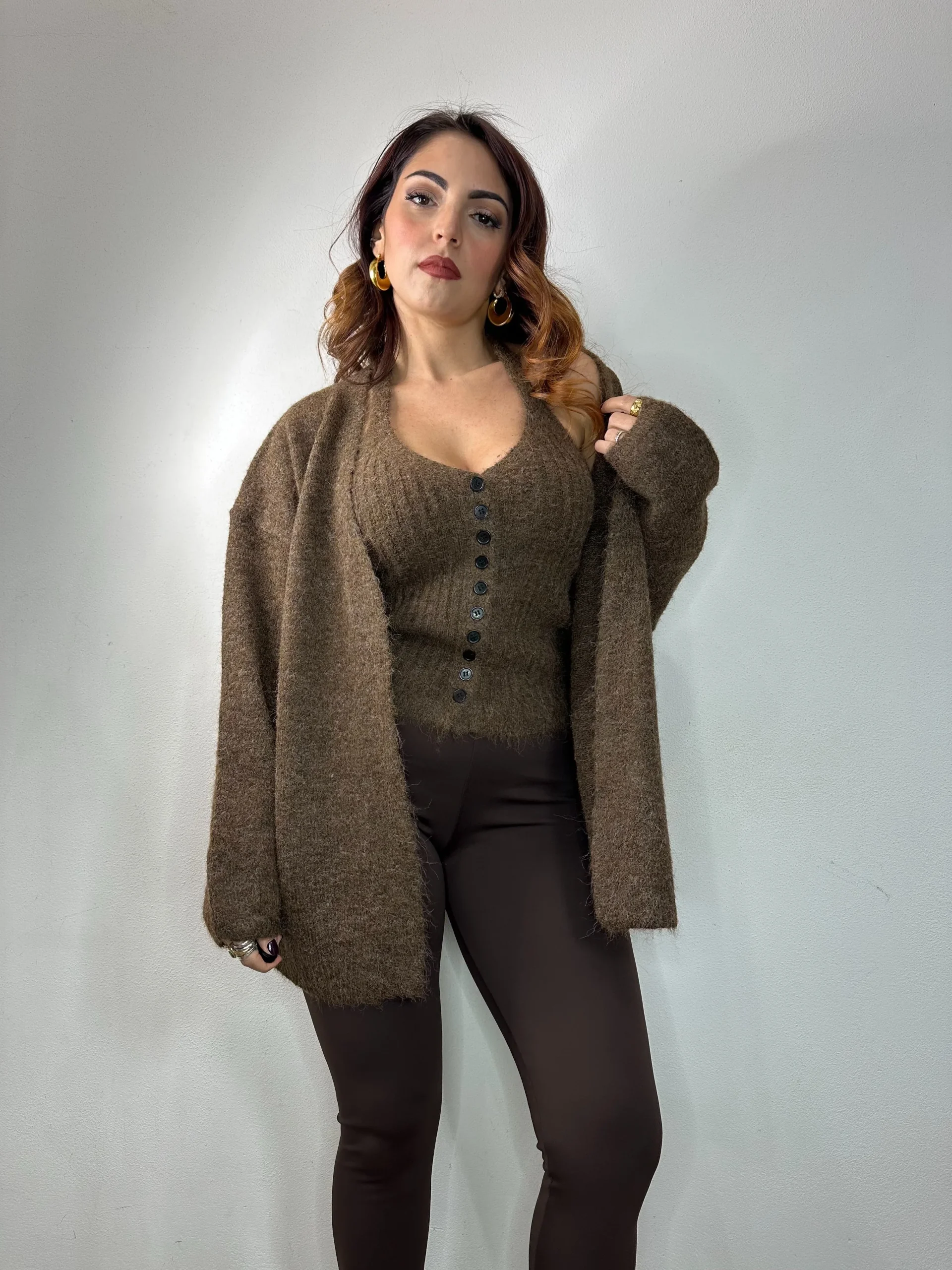 Coordinazione composto da cardigan a manica lunga, larga e calante modello Over.