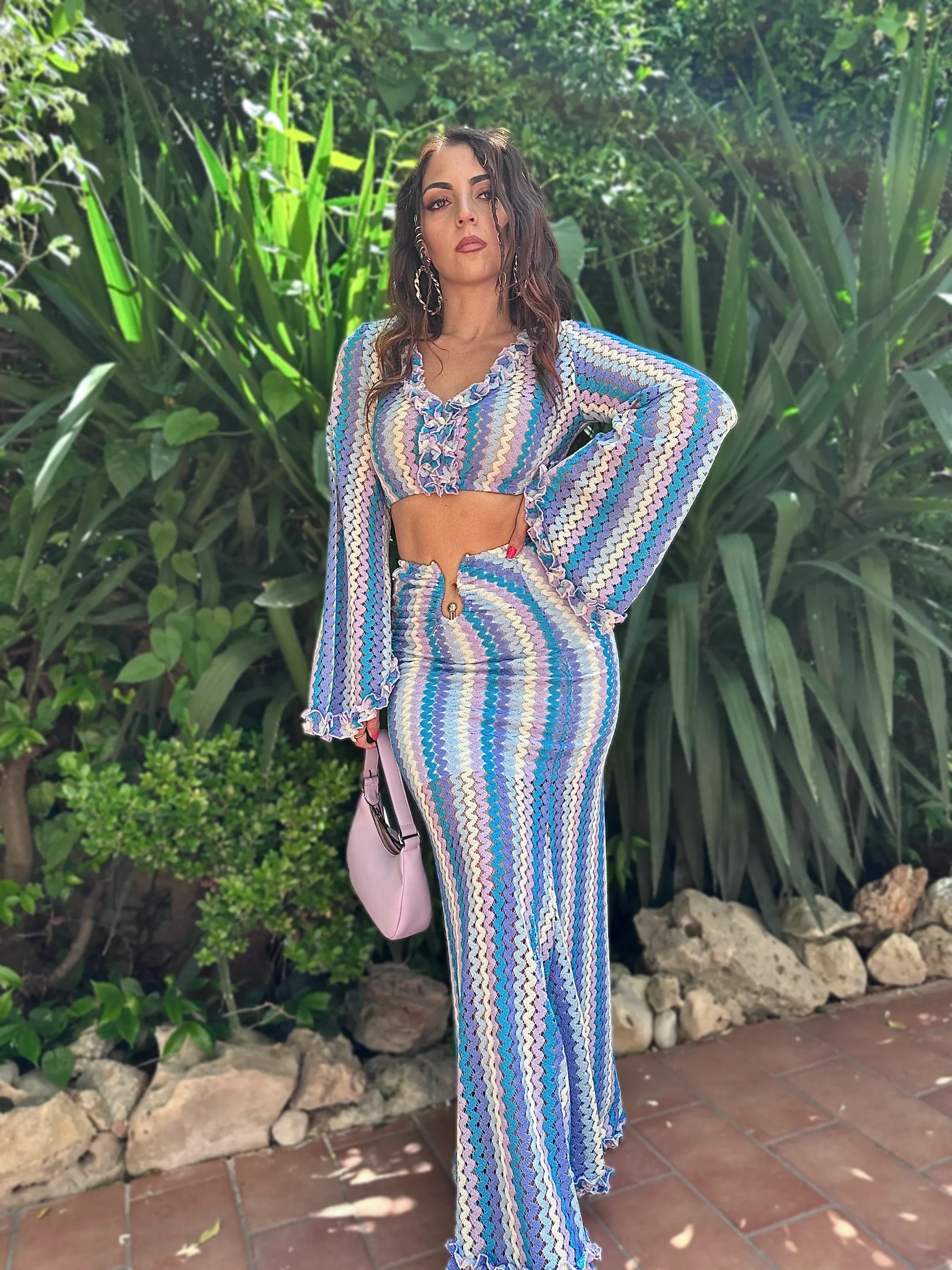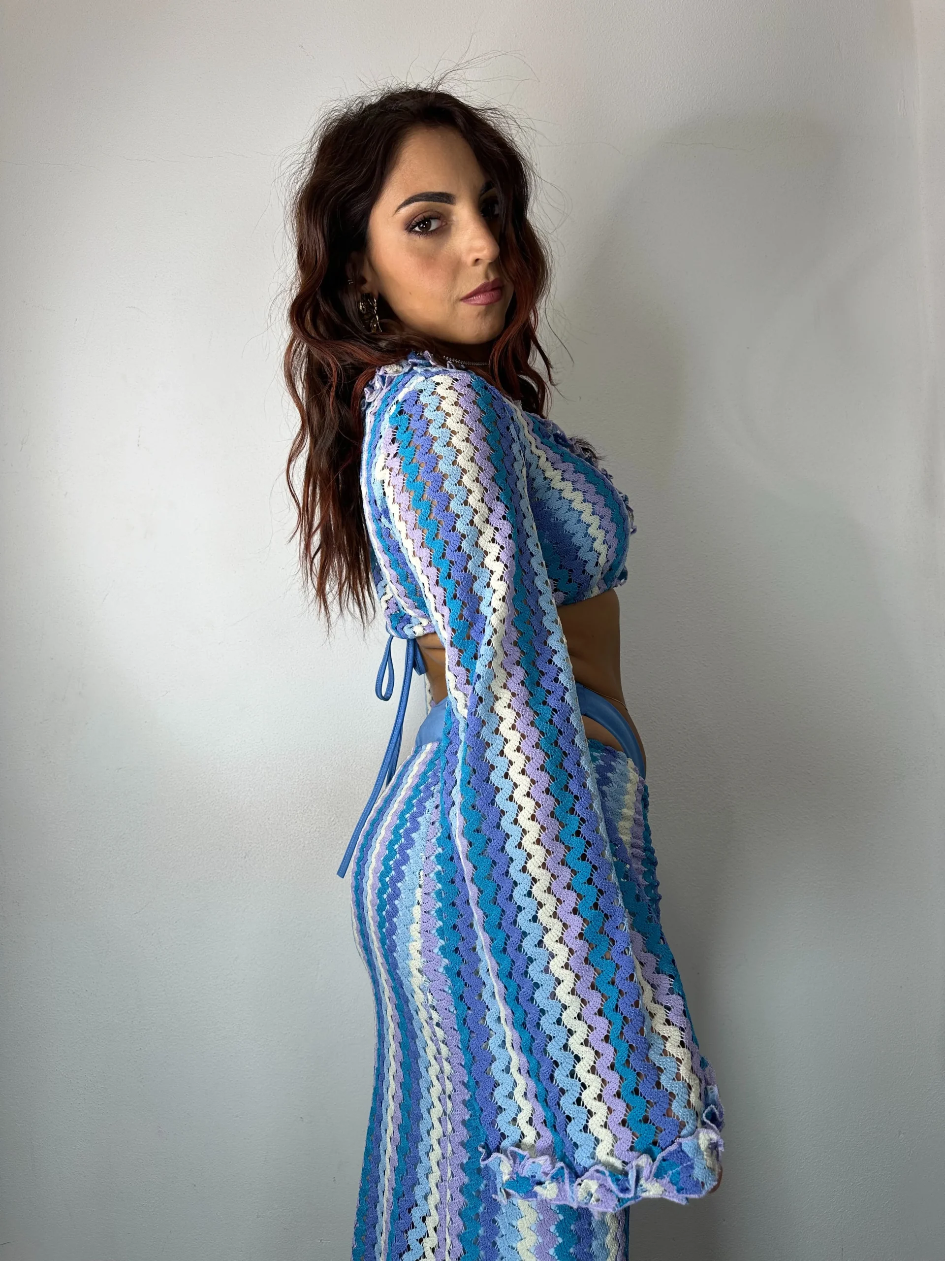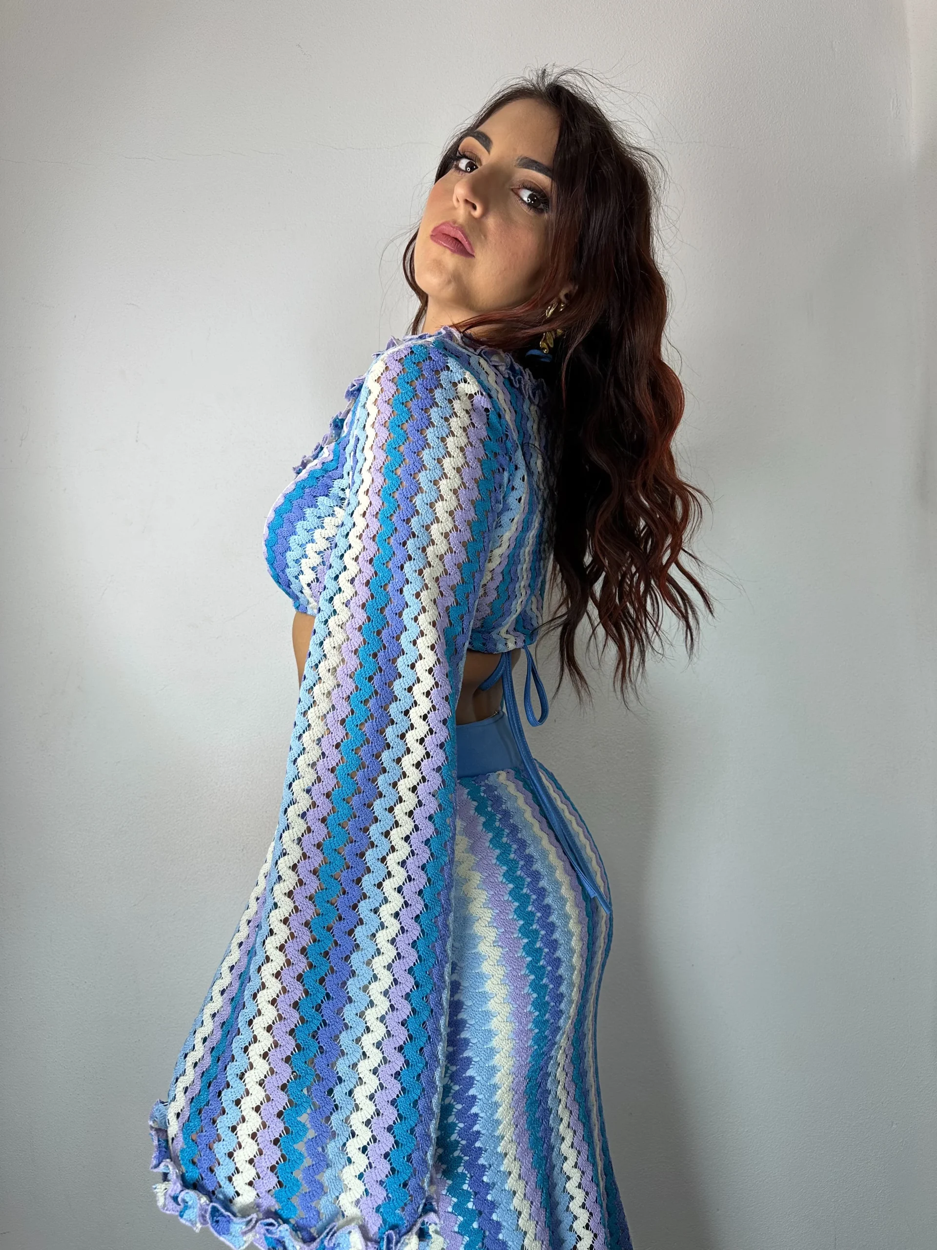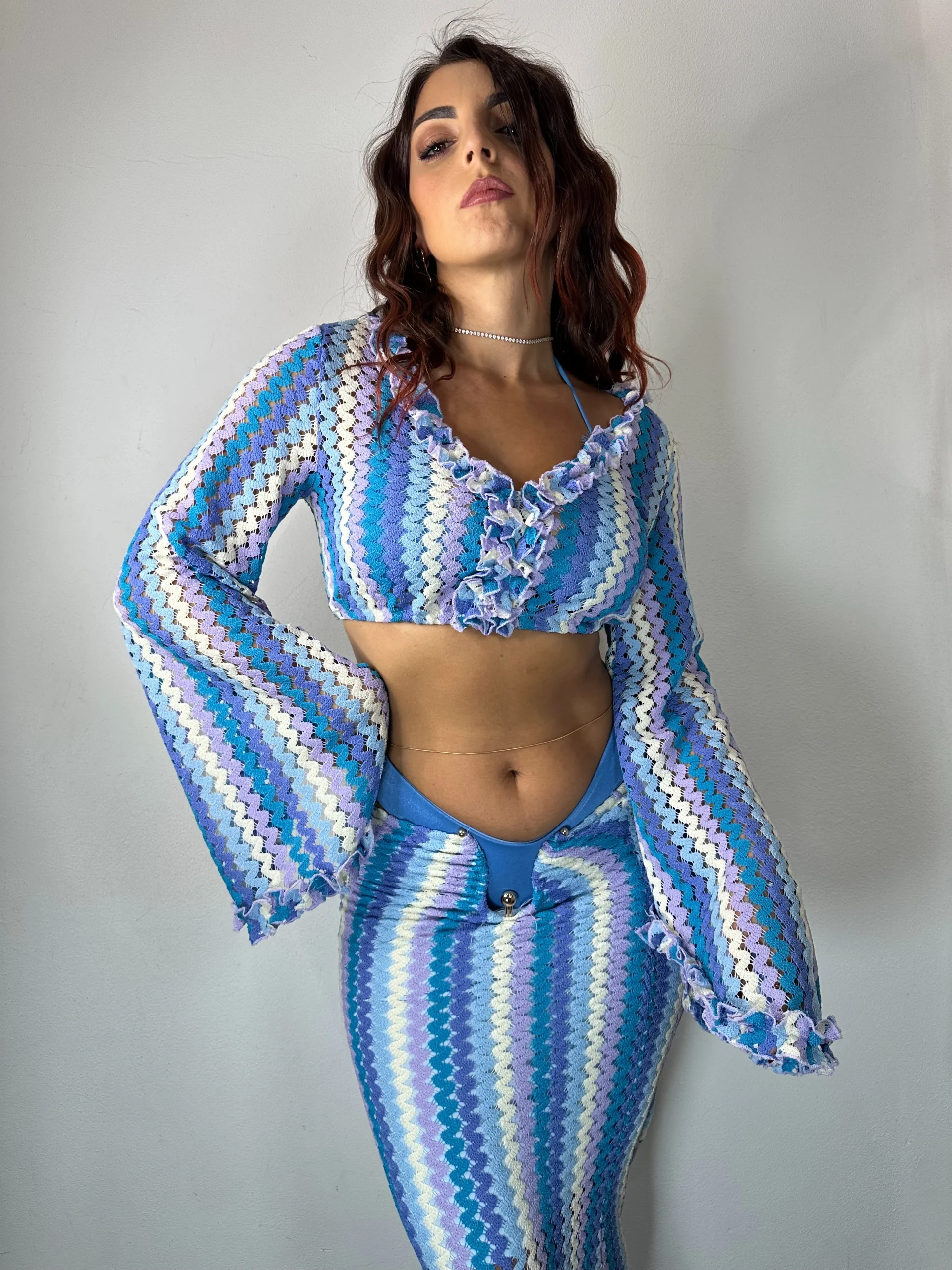 Coordinato a uncinetto composto da maglia crop a manica lunga a campana abbellito di rouches. Ha uno scollo ampio a v contornato anche questo da rouches in tessuto uncinetto.