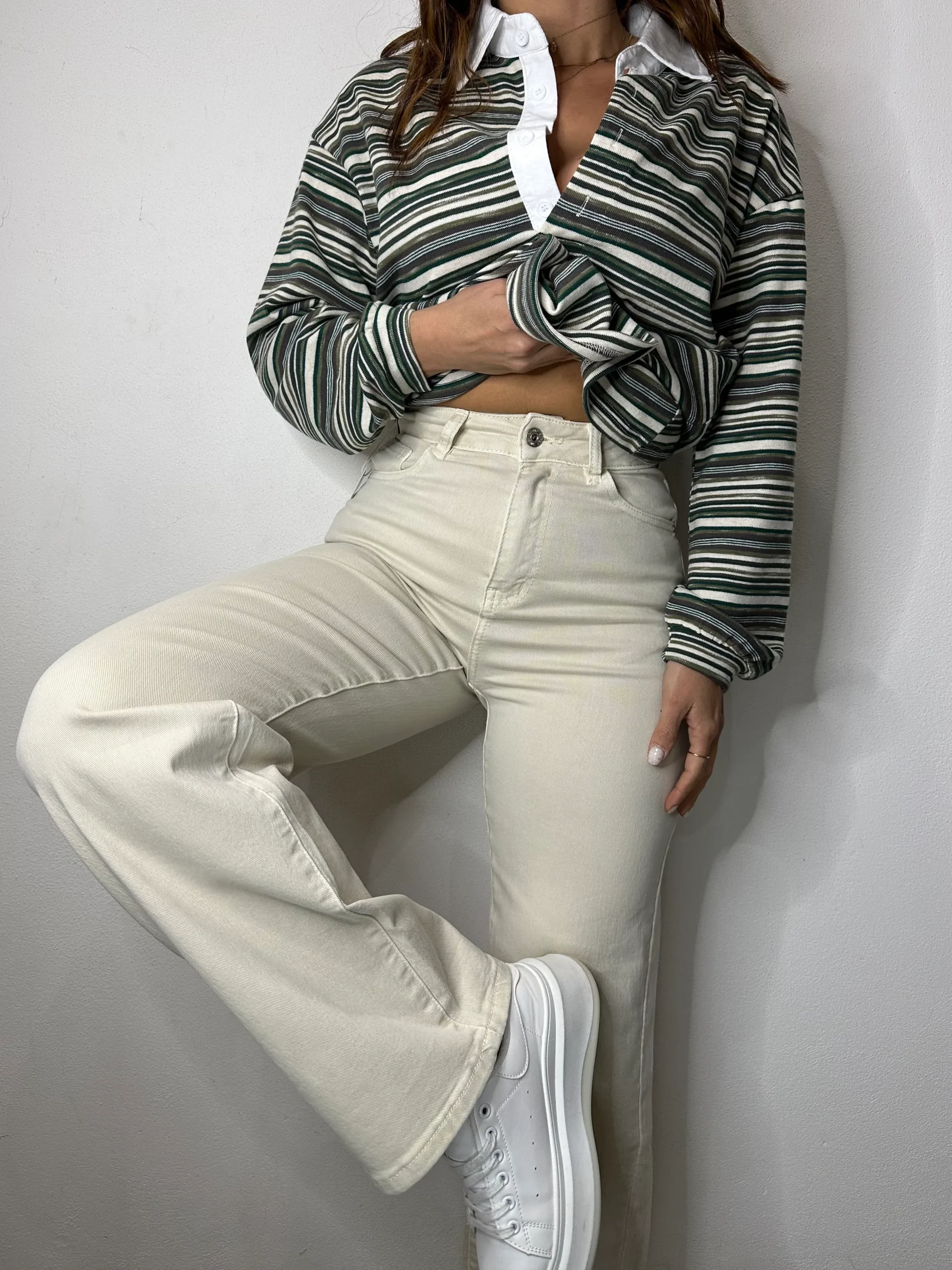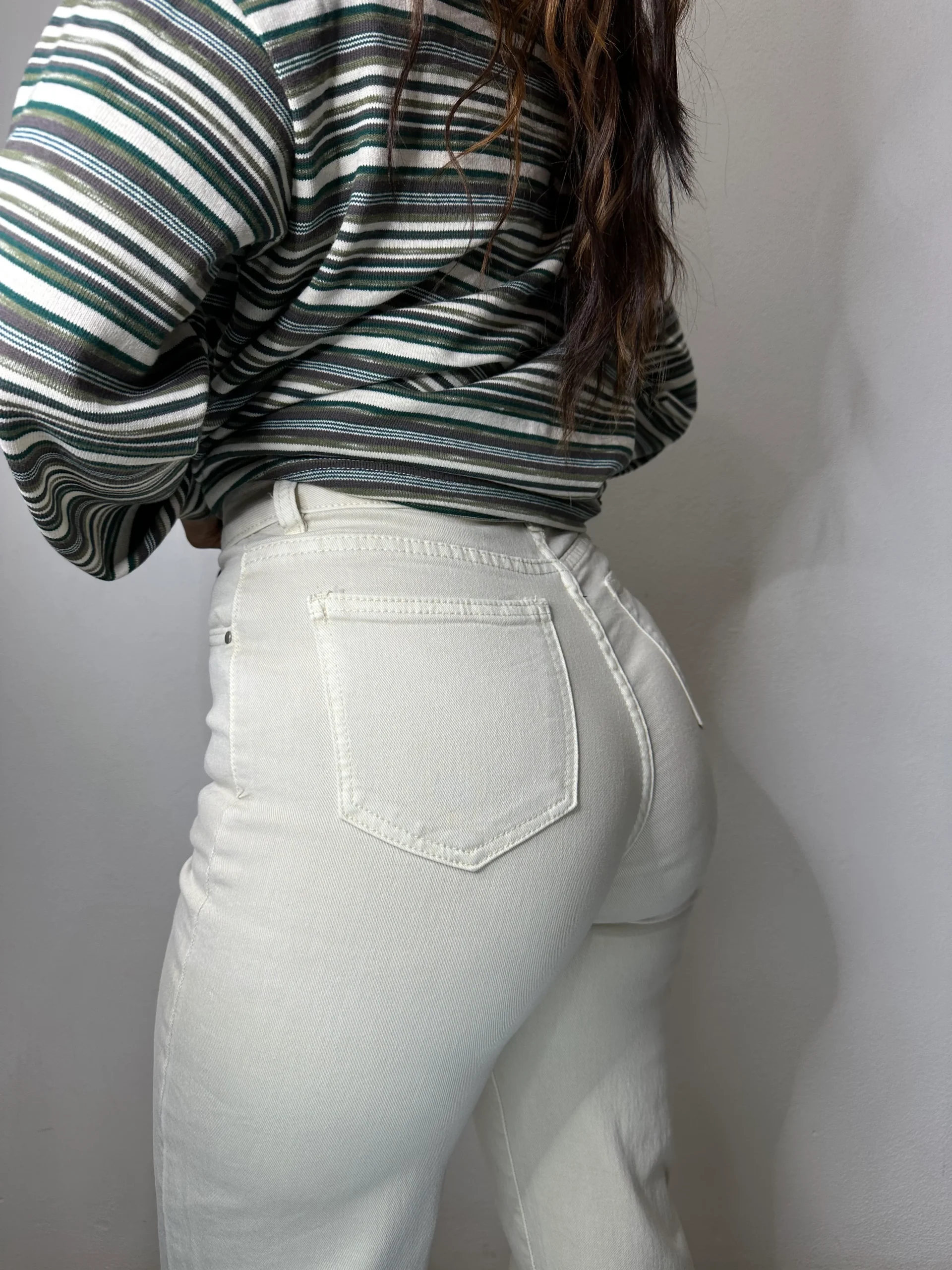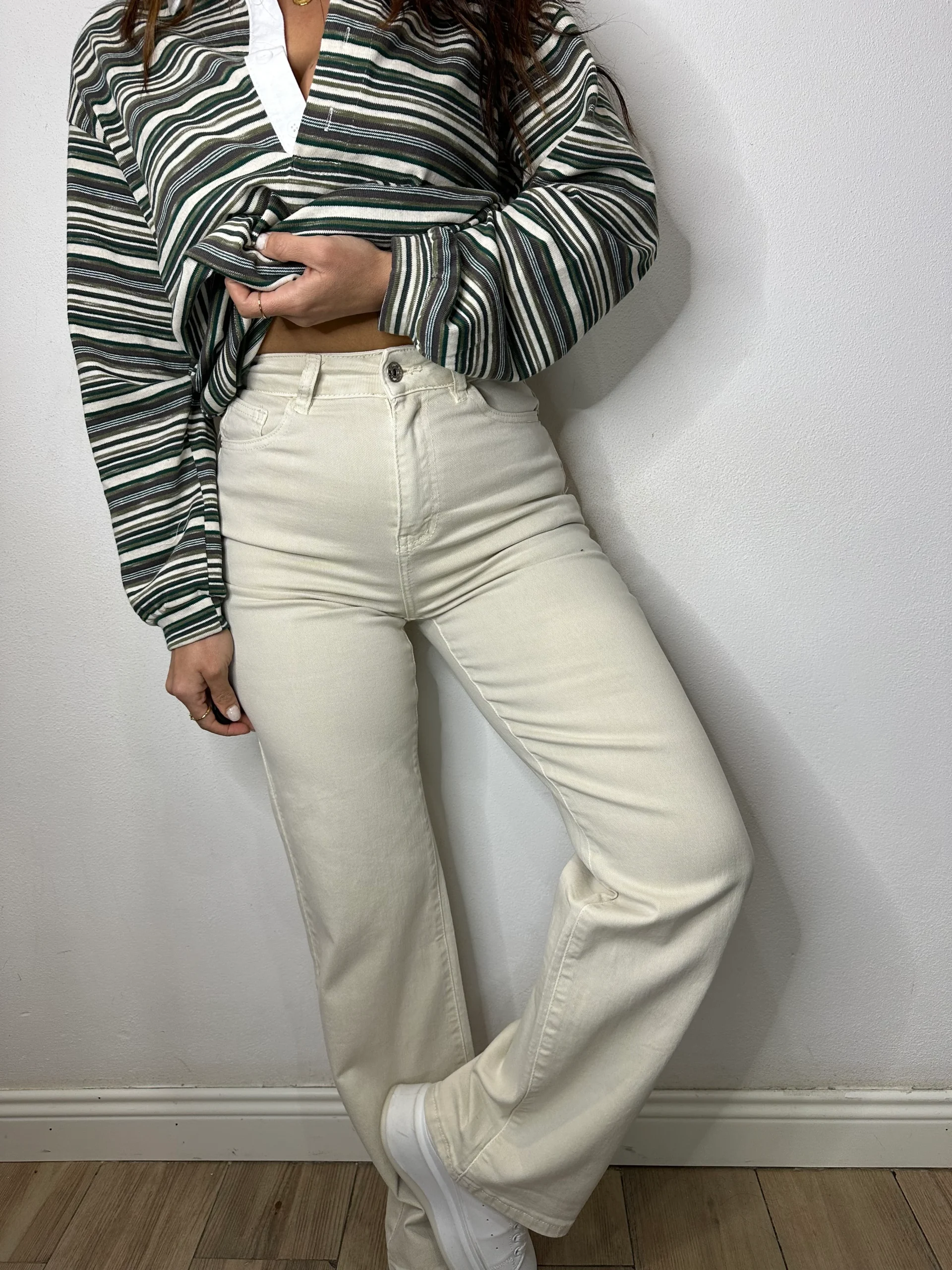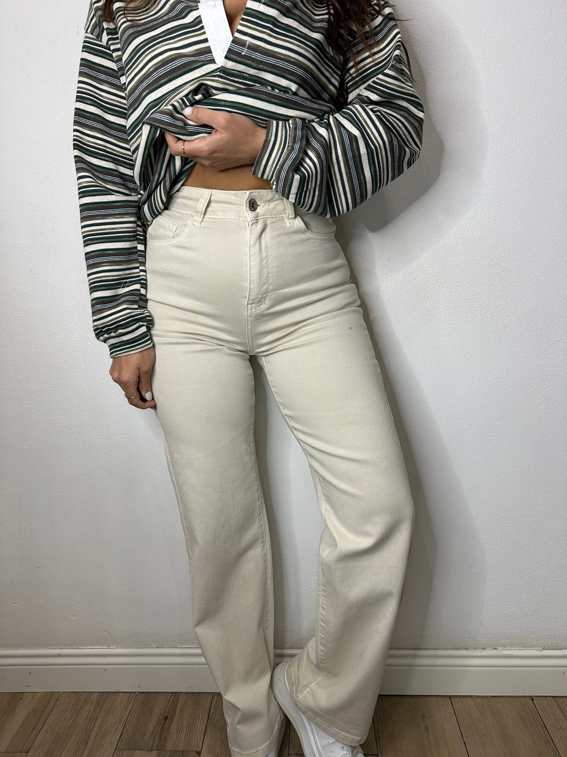 Pantalone di jeans ad alta vita modello palazzo con tasche sul davanti e sul retro cerniera e bottone di chiusura.