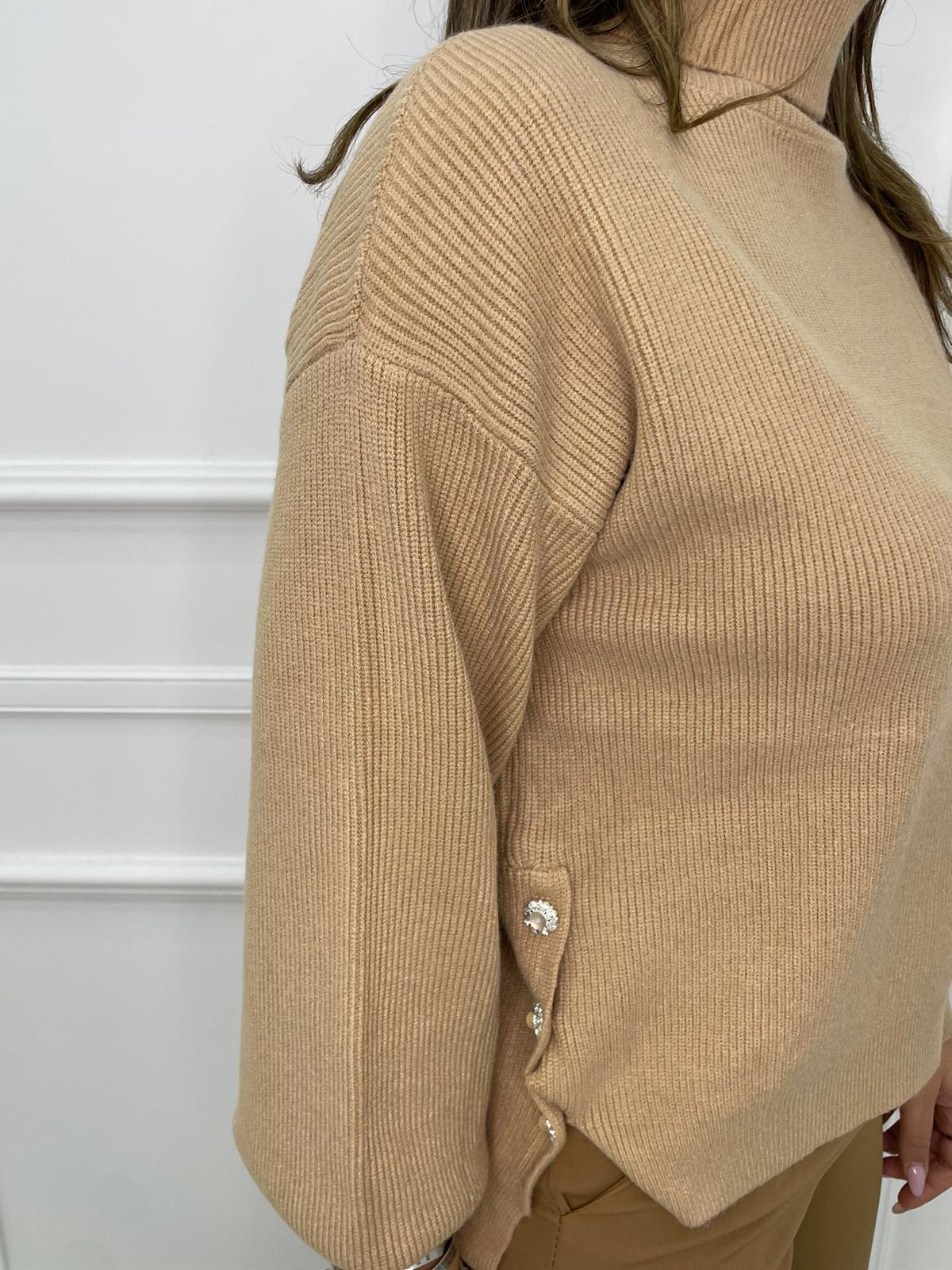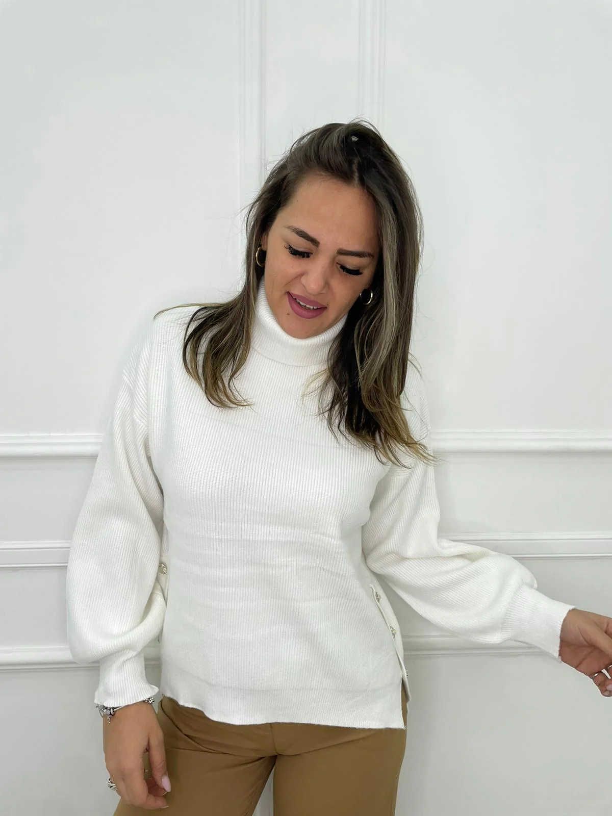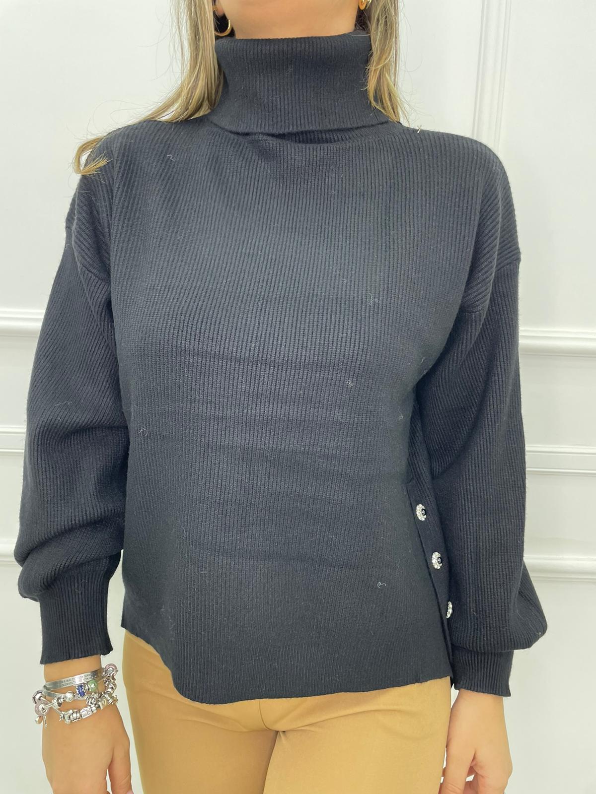 – Maglione tinta unita – Modello over collo alto – Asimmetrico sotto – Maniche a palloncino – Elasticizzato – Veste tranquillamente fino ad una taglia “L” – Tessuto: viscosa, poliestere, poliamide