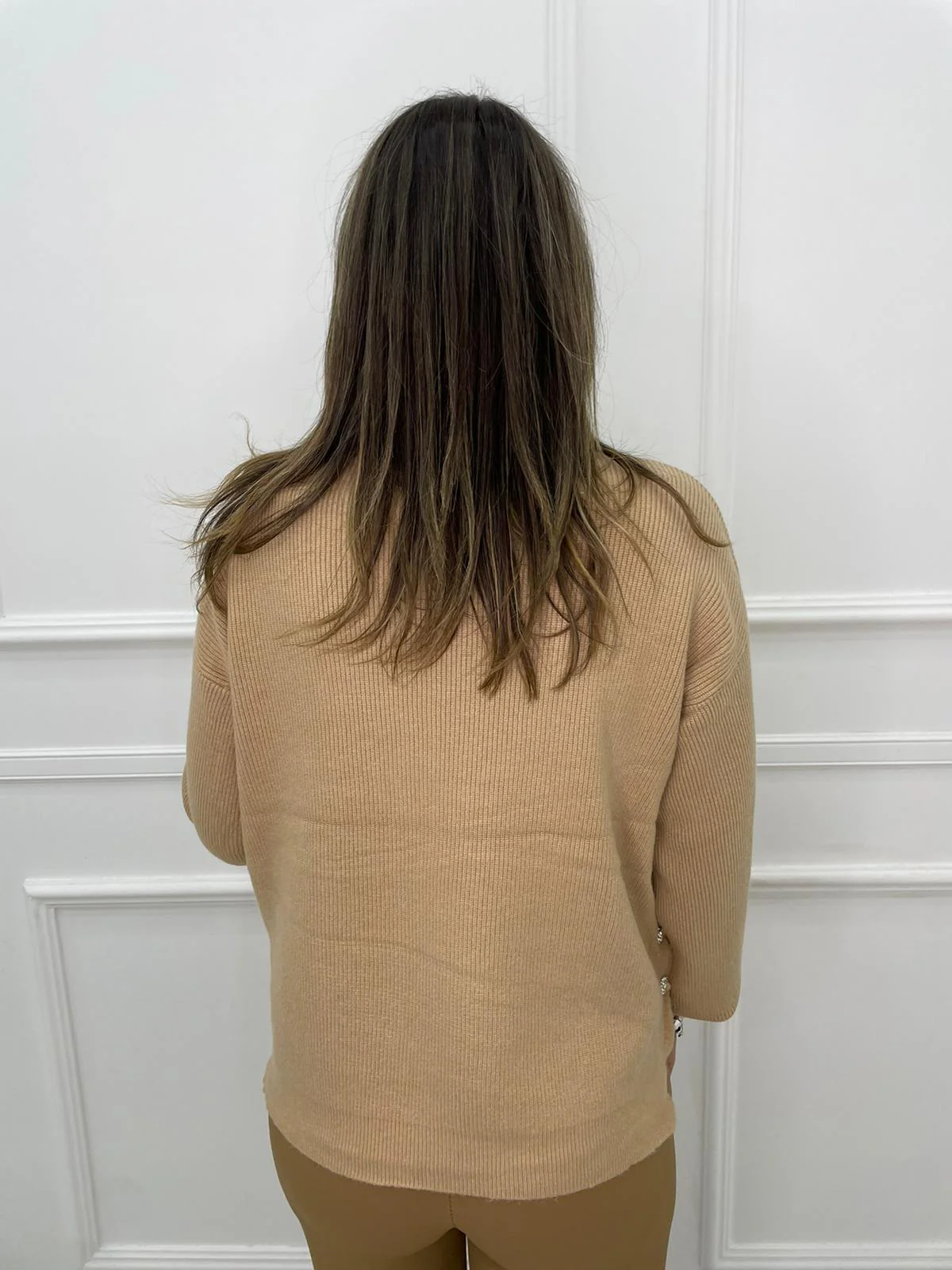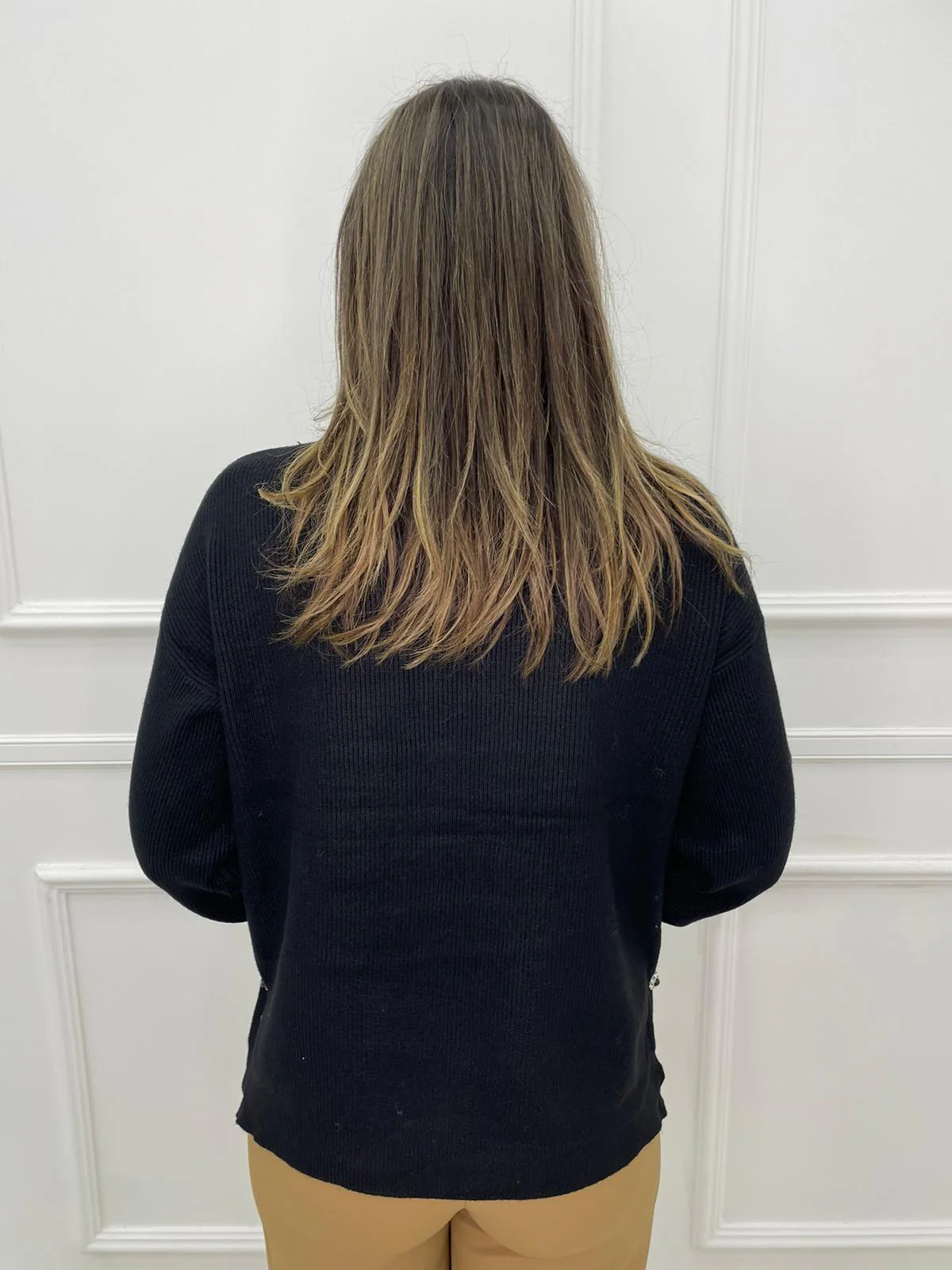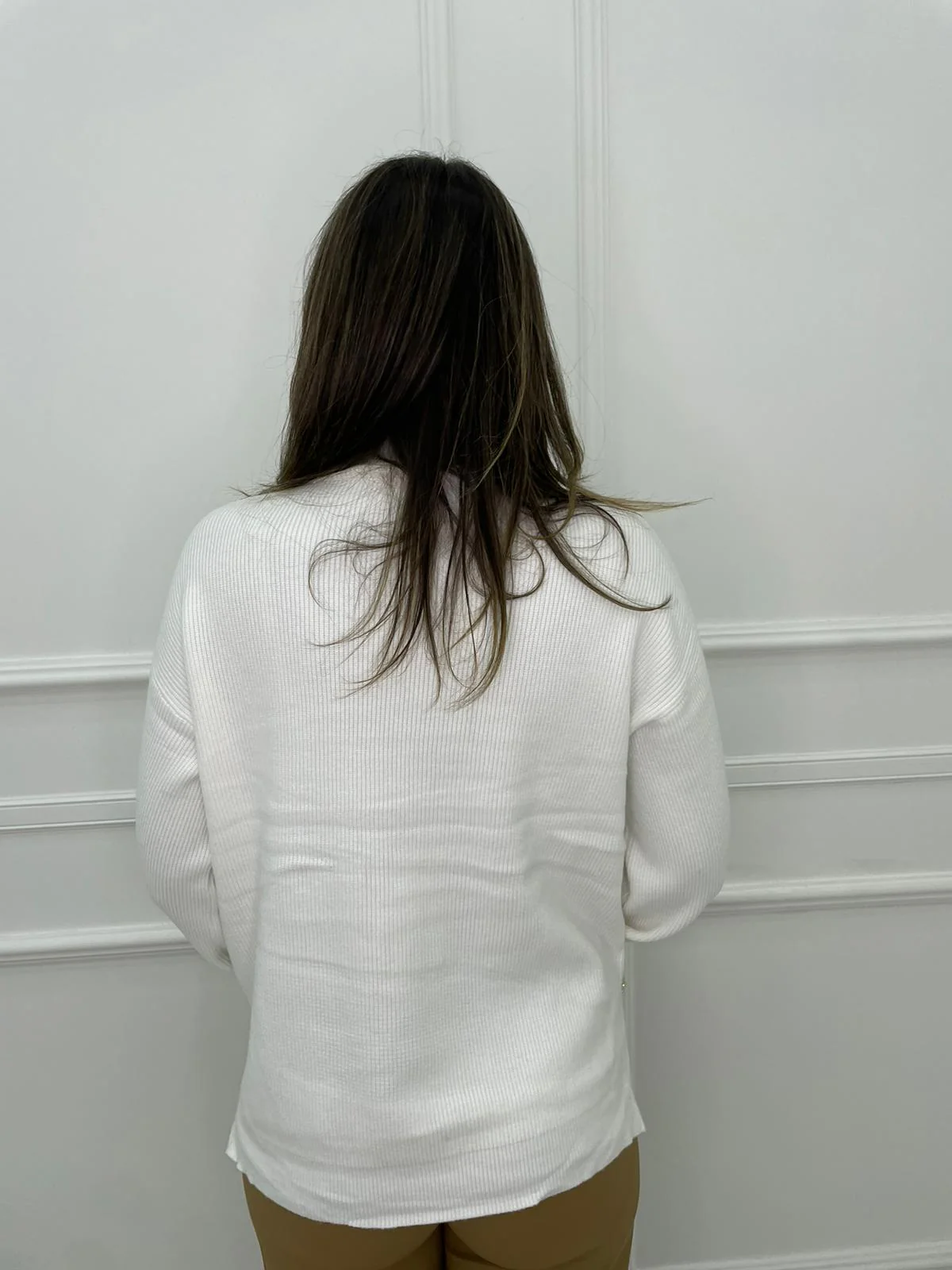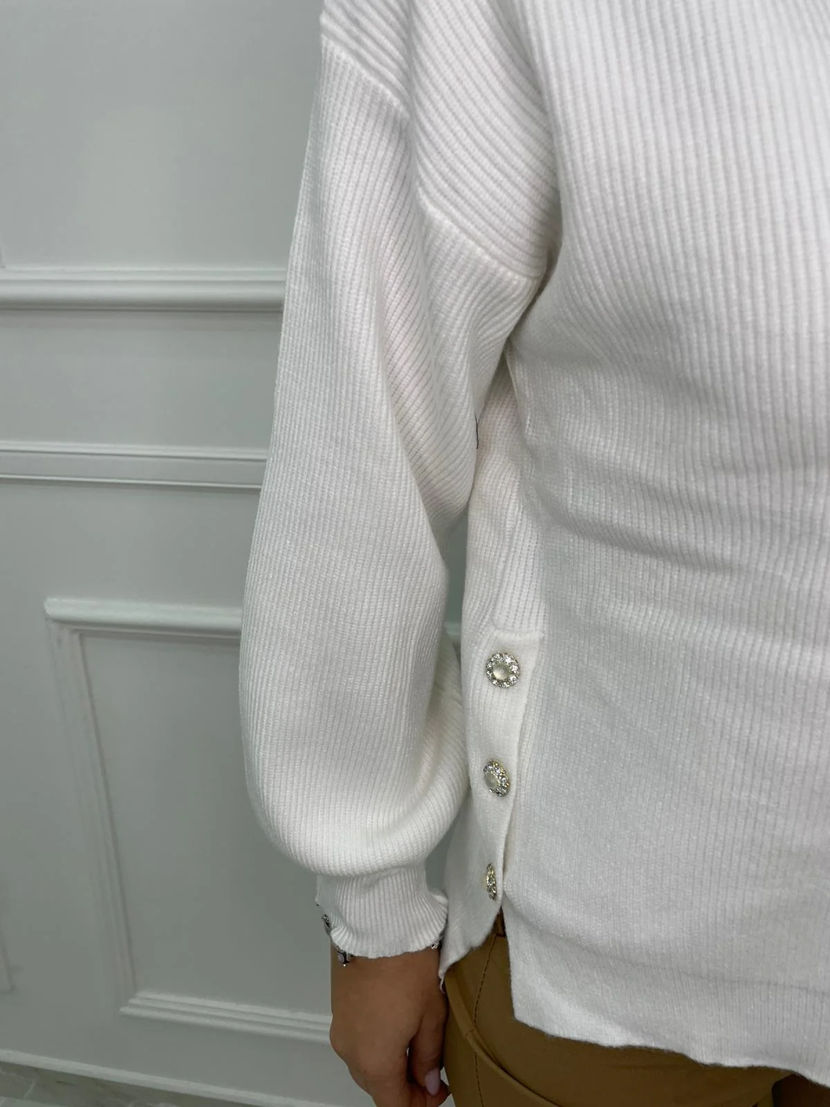 – Maglione tinta unita – Modello over collo alto – Asimmetrico sotto – Maniche a palloncino – Elasticizzato – Veste tranquillamente fino ad una taglia “L” – Tessuto: viscosa, poliestere, poliamide