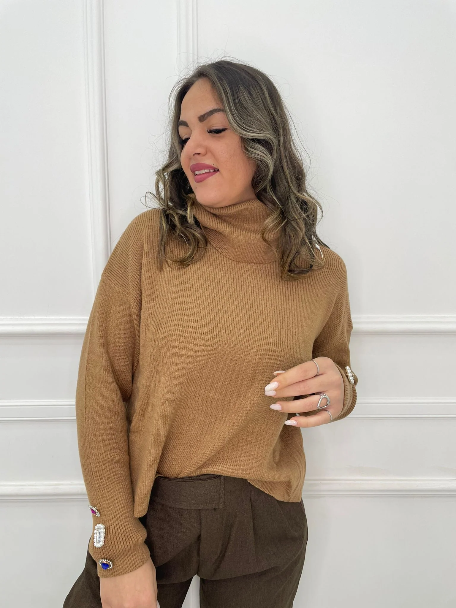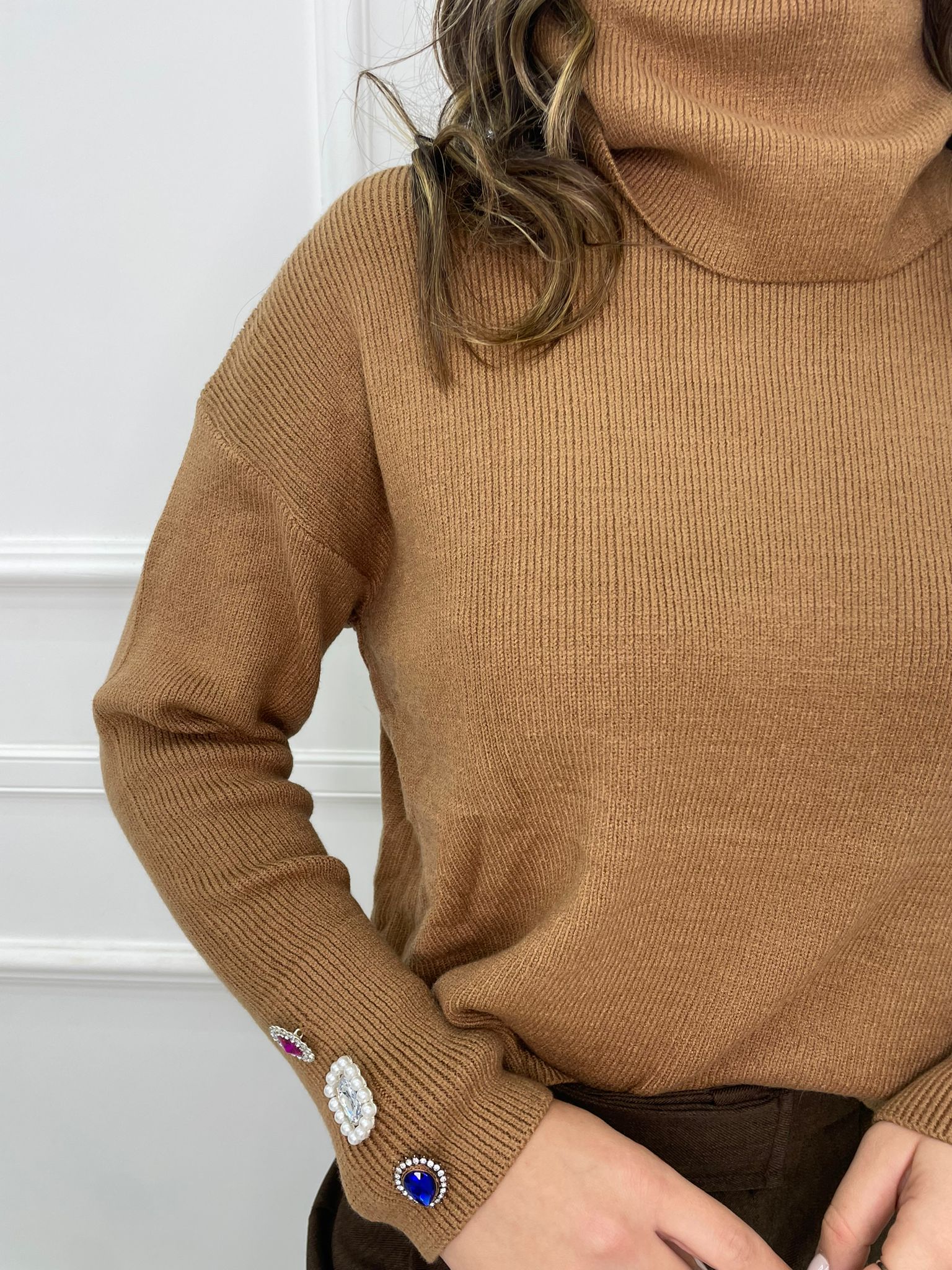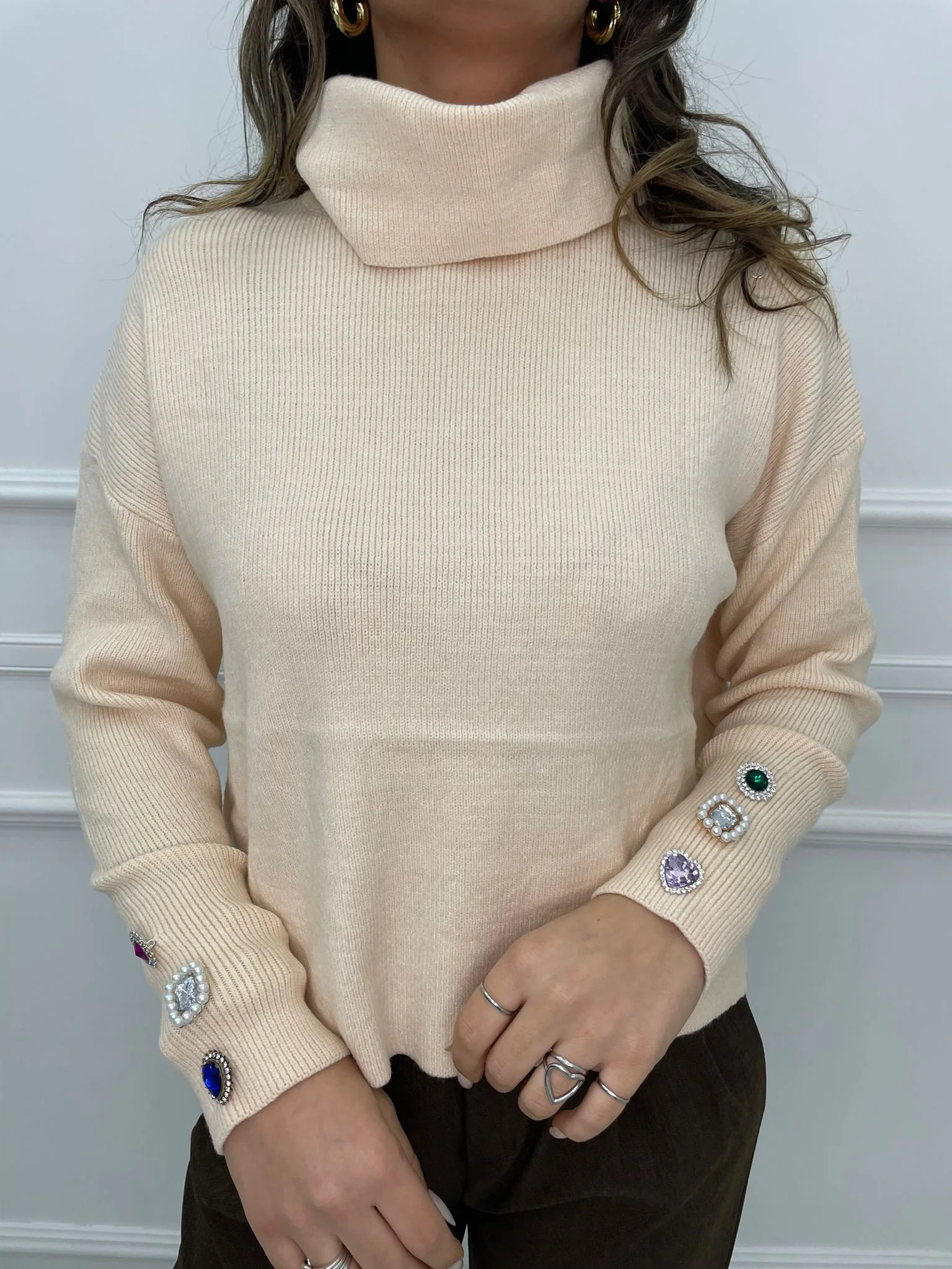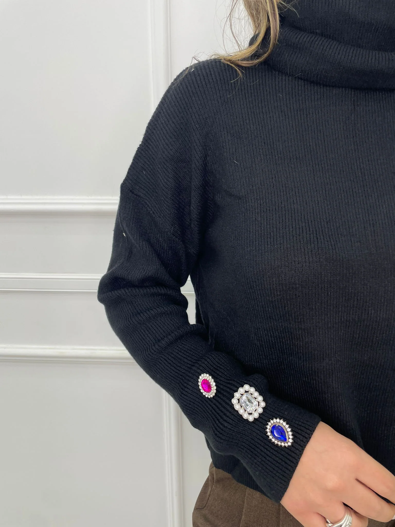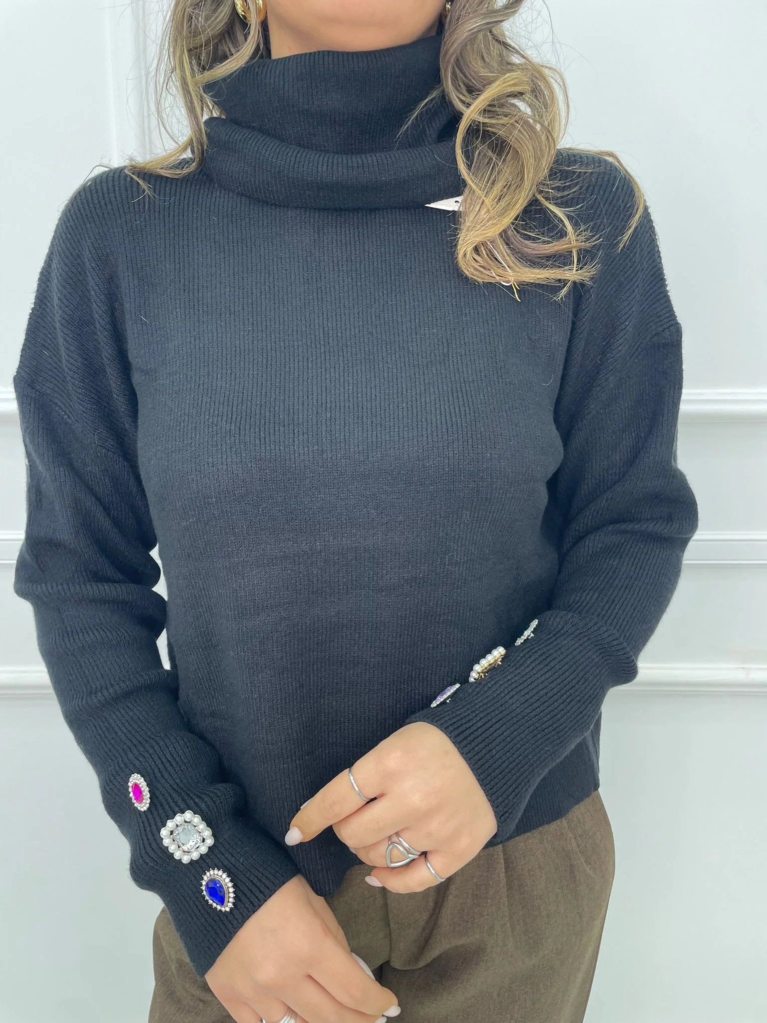 – Maglione tinta unita – Collo alto – Applicazioni gioiello ai polsi – Elasticizzato – Veste tranquillamente fino ad una taglia “L” – Tessuto: acrilico, poliamide, poliestere
