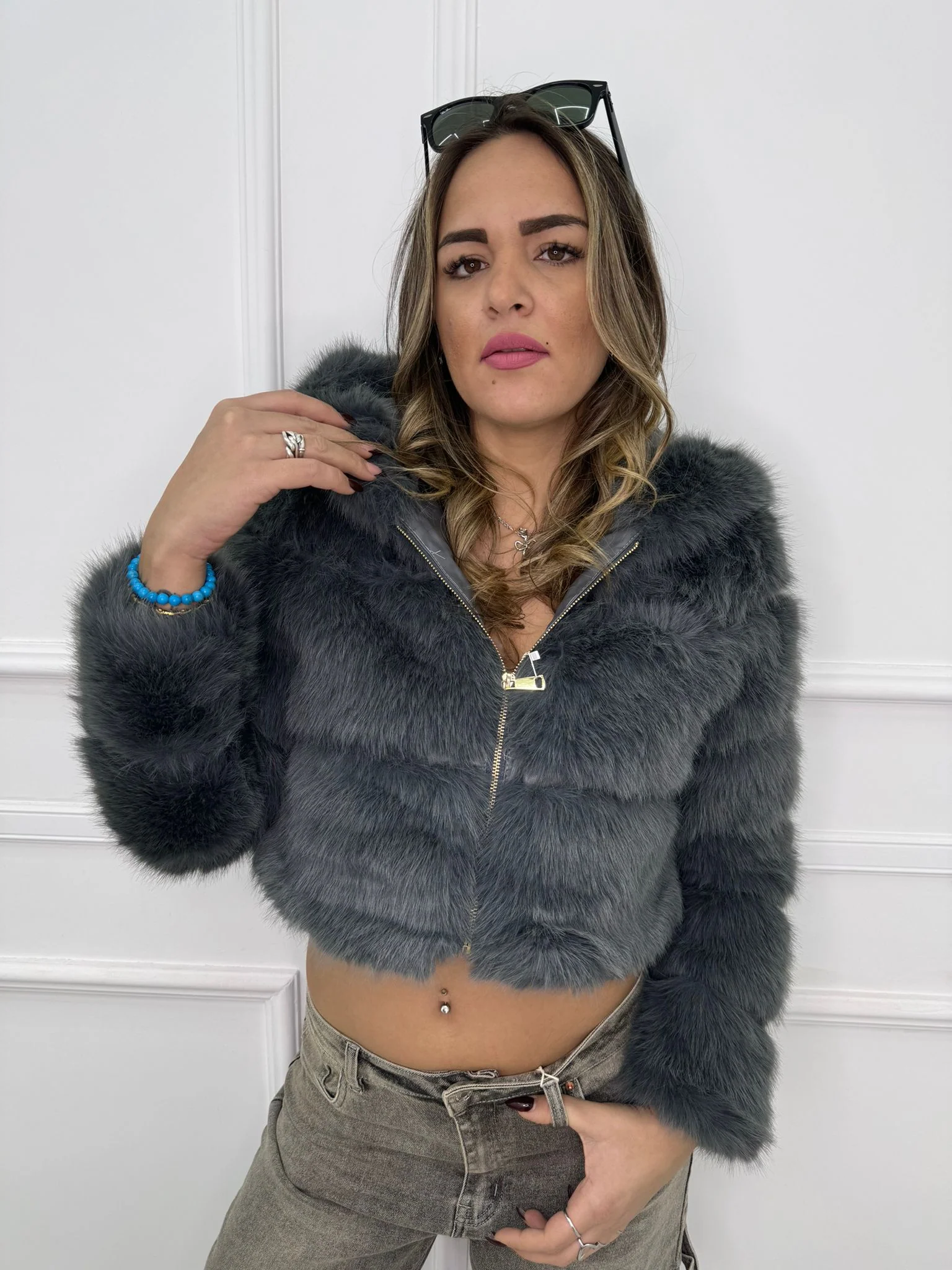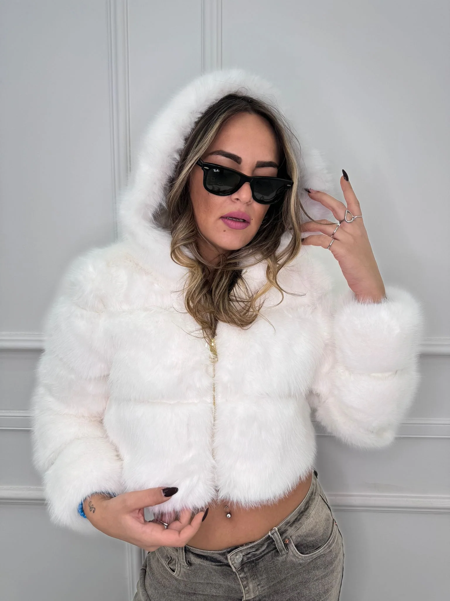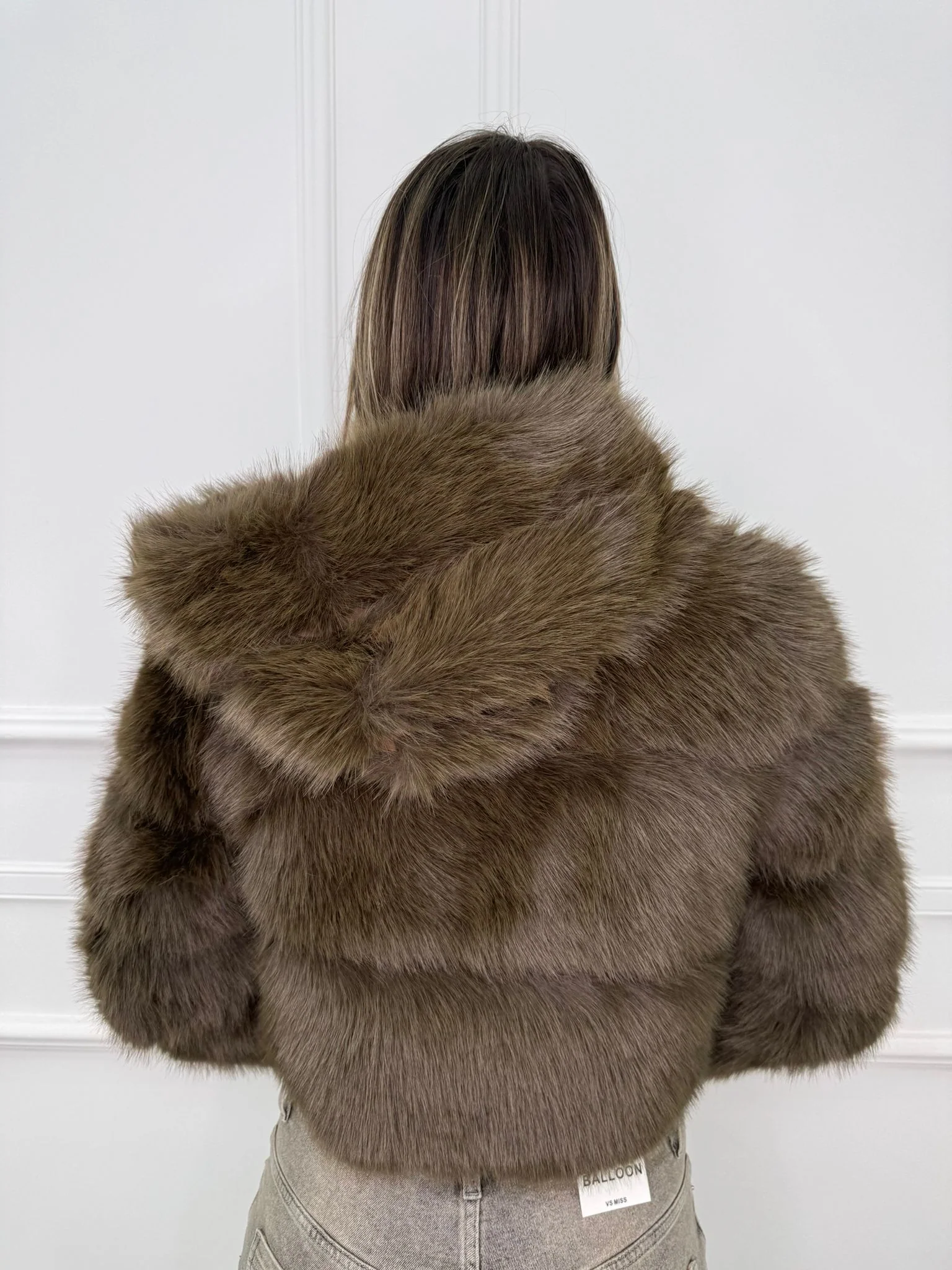 Pelliccia eco tinta unita Modello crop Con cappuccio Foderata Vestibilitร regolare La modella รจ una taglia 44, alta 1,79m e indossa la taglia “M/L”