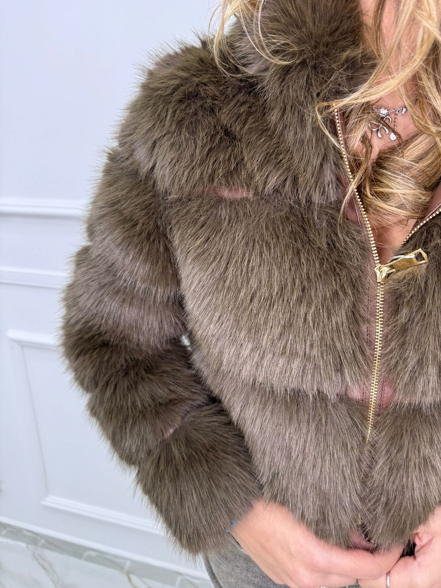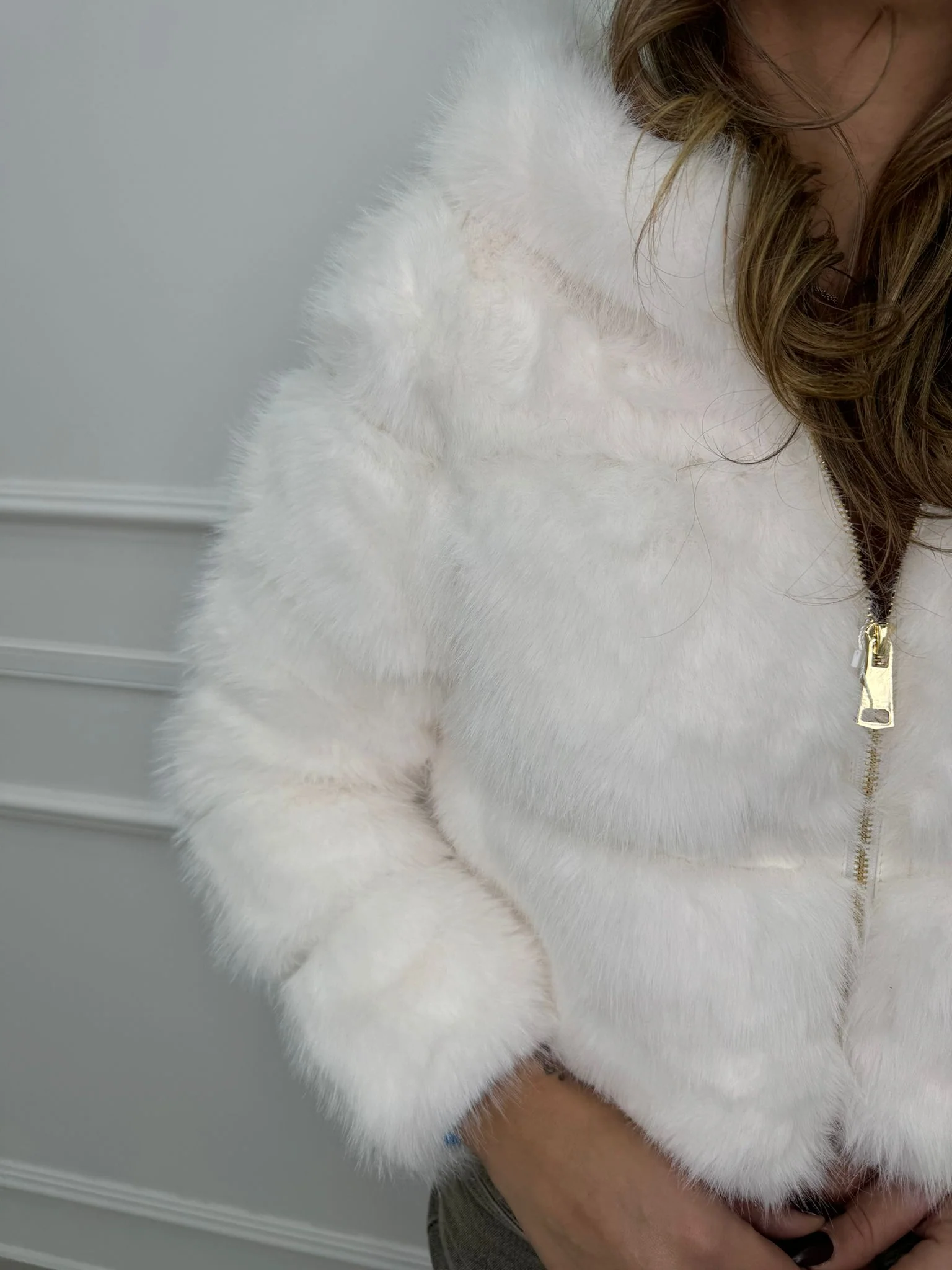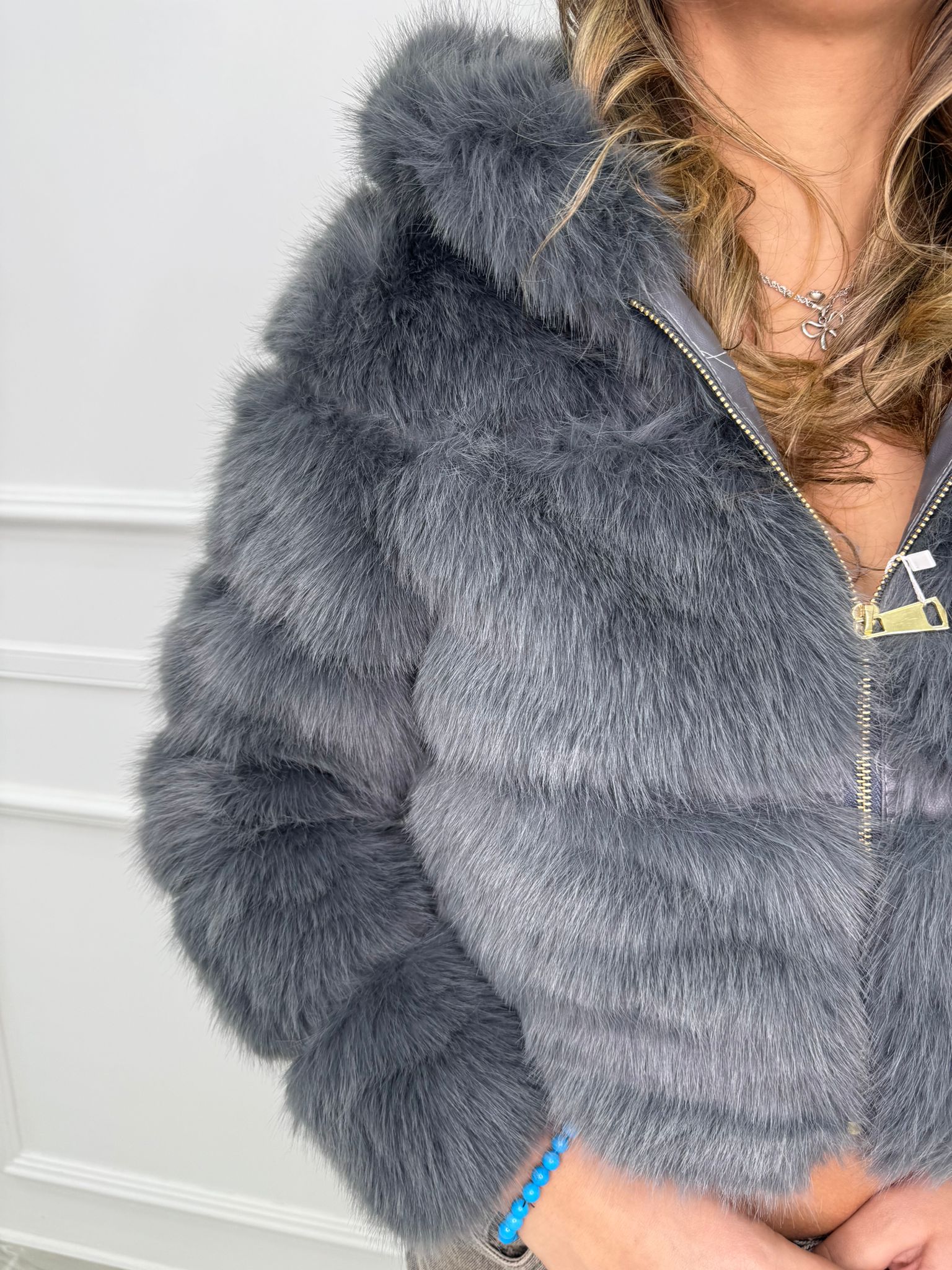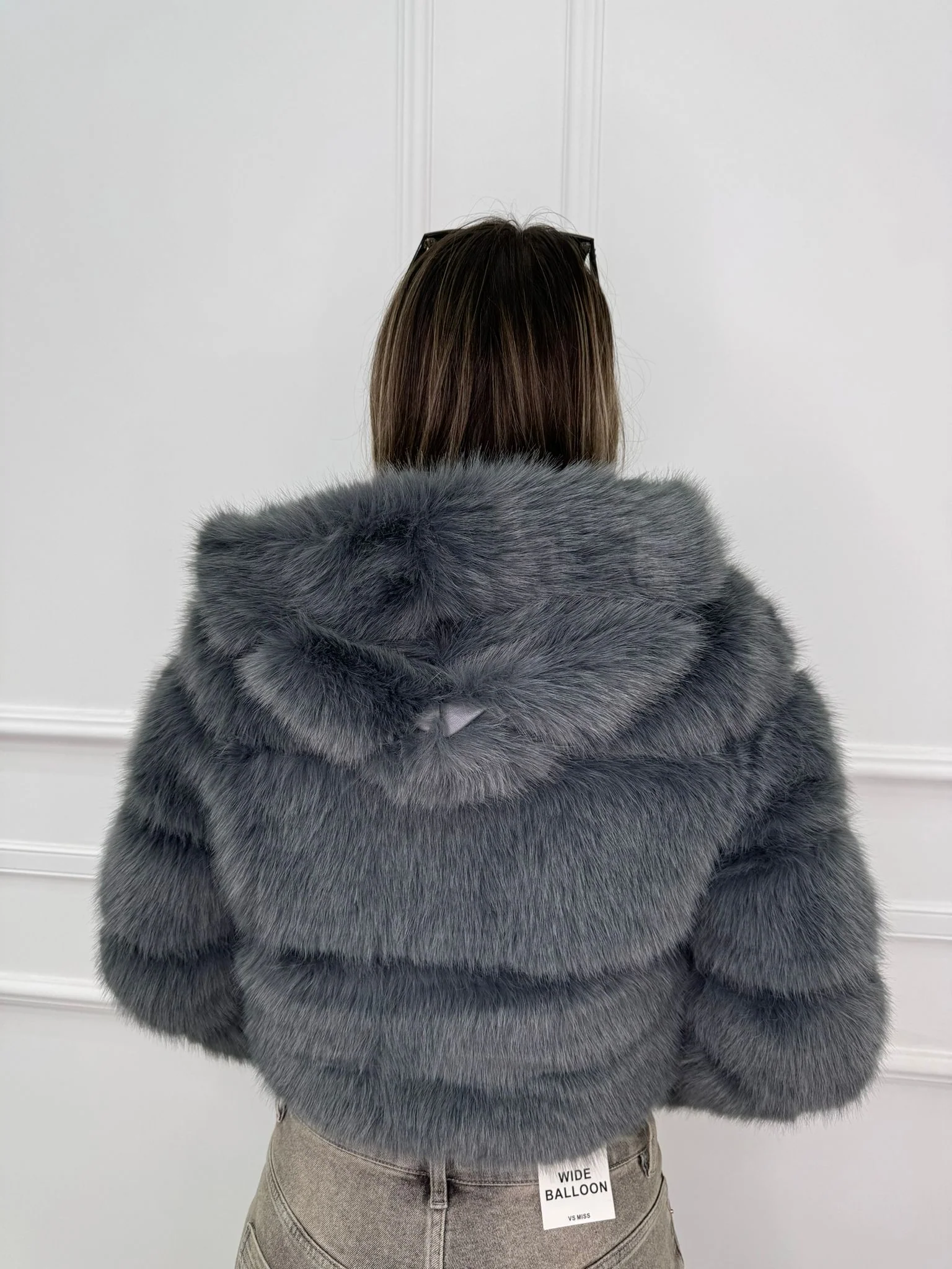 Pelliccia eco tinta unita Modello crop Con cappuccio Foderata Vestibilitร regolare La modella รจ una taglia 44, alta 1,79m e indossa la taglia “M/L”