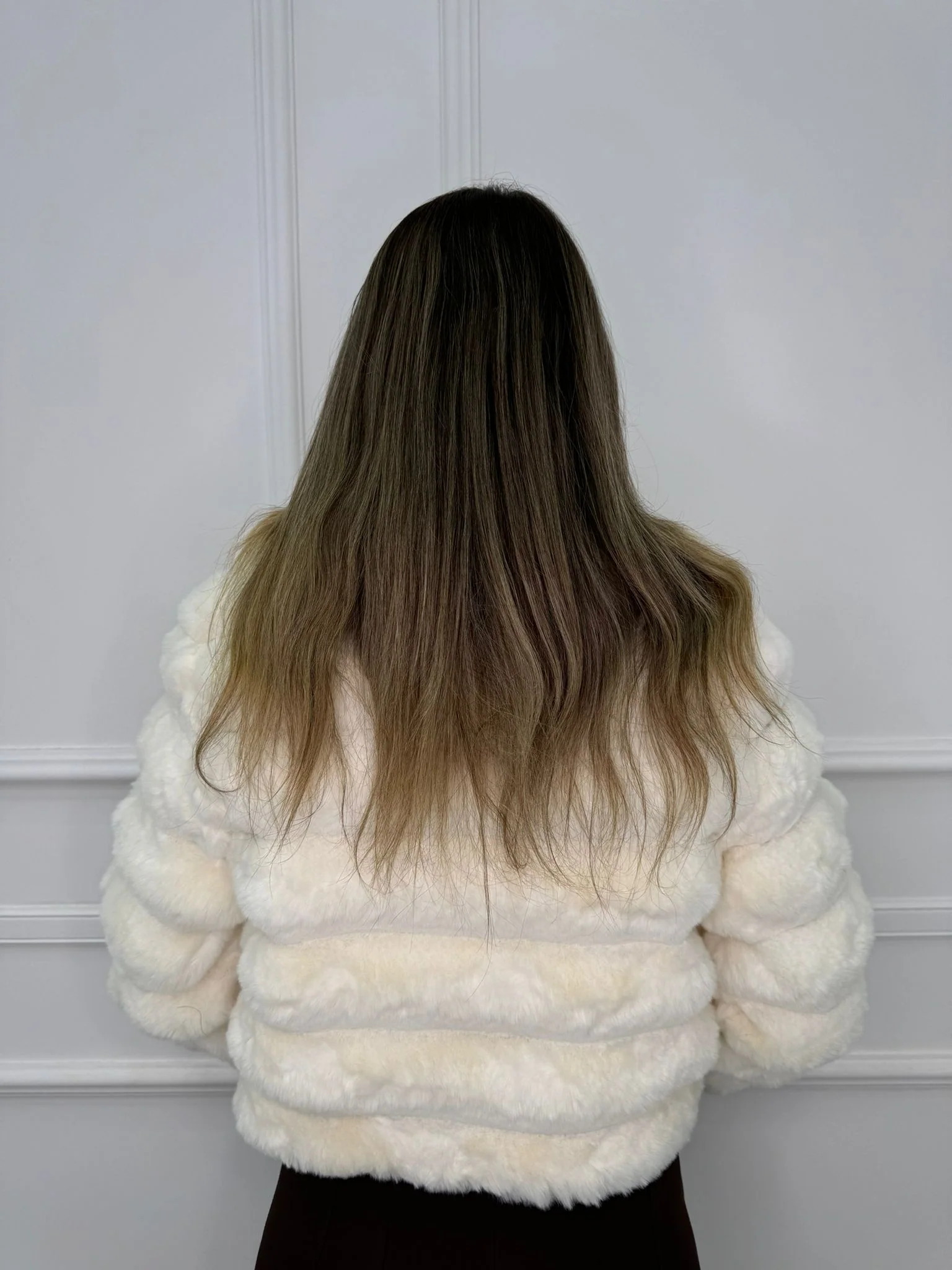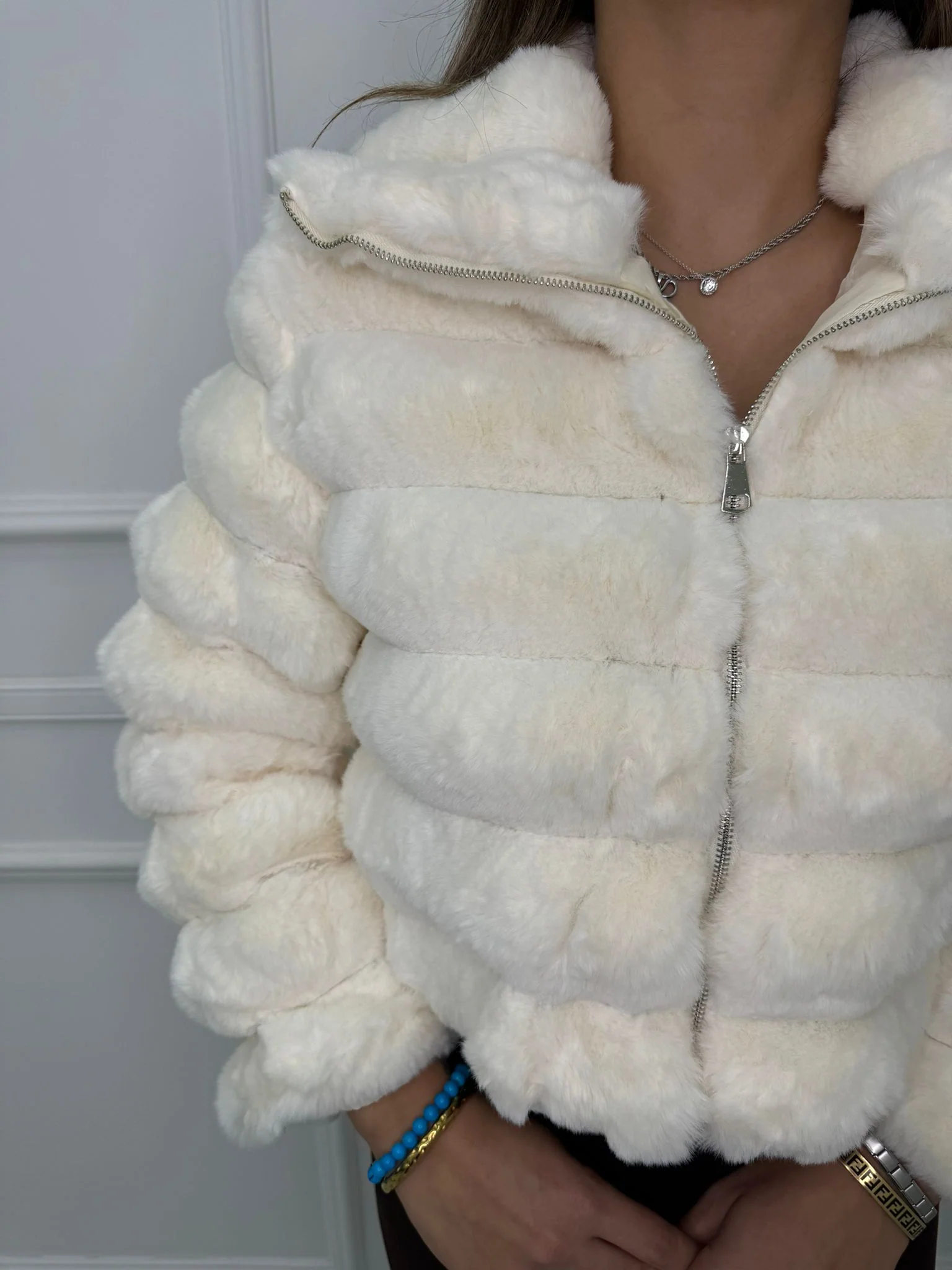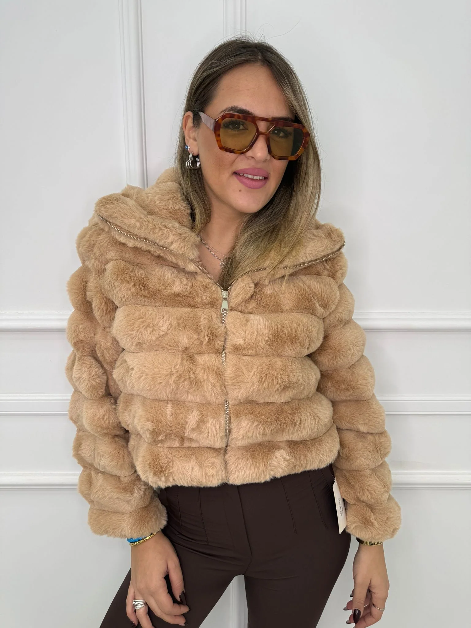 Pelliccia eco tinta unita Con zip avanti Vestibilitร regolare La modella รจ una taglia 44, 4^ di seno e indossa la taglia “M/L”