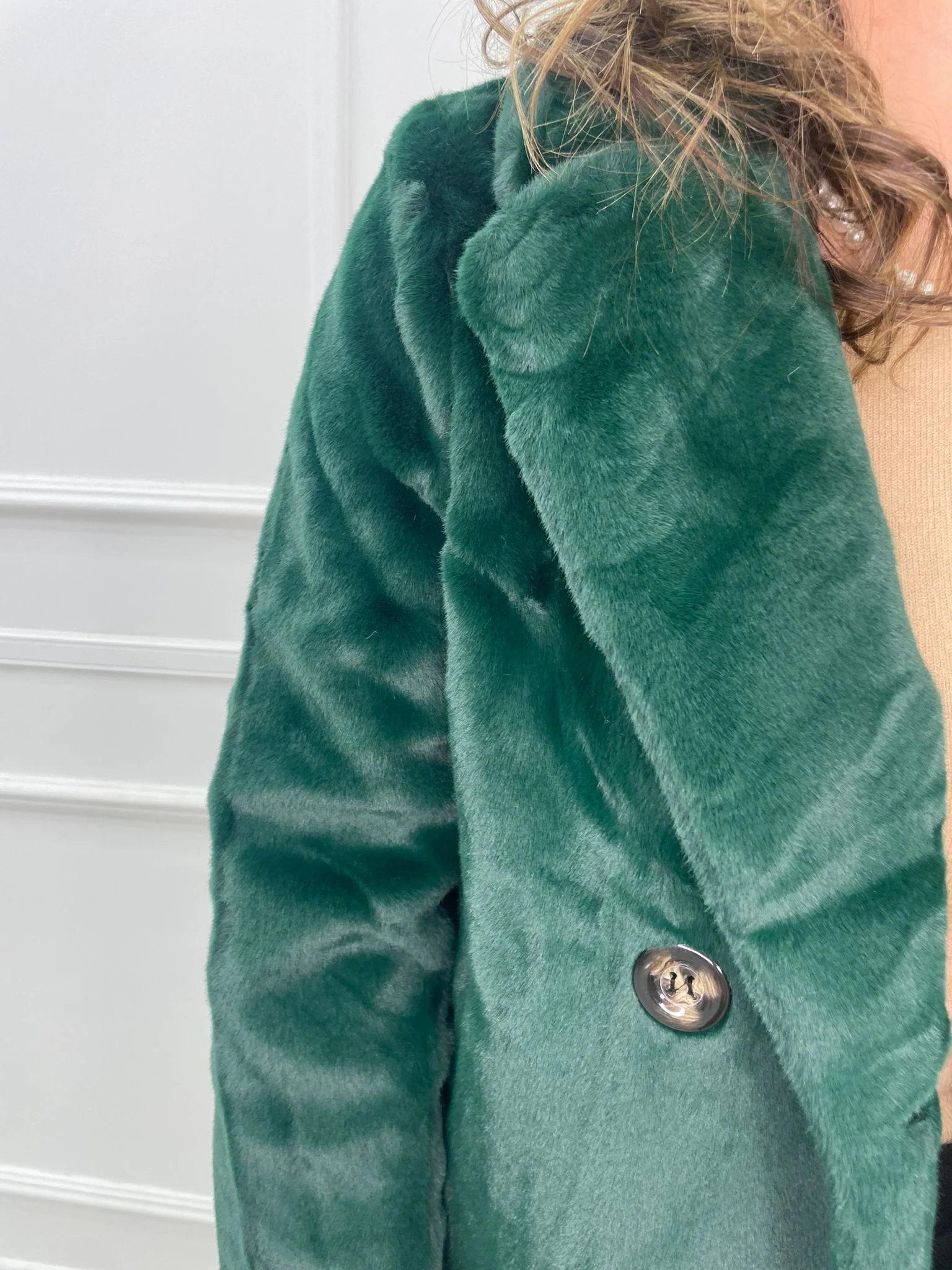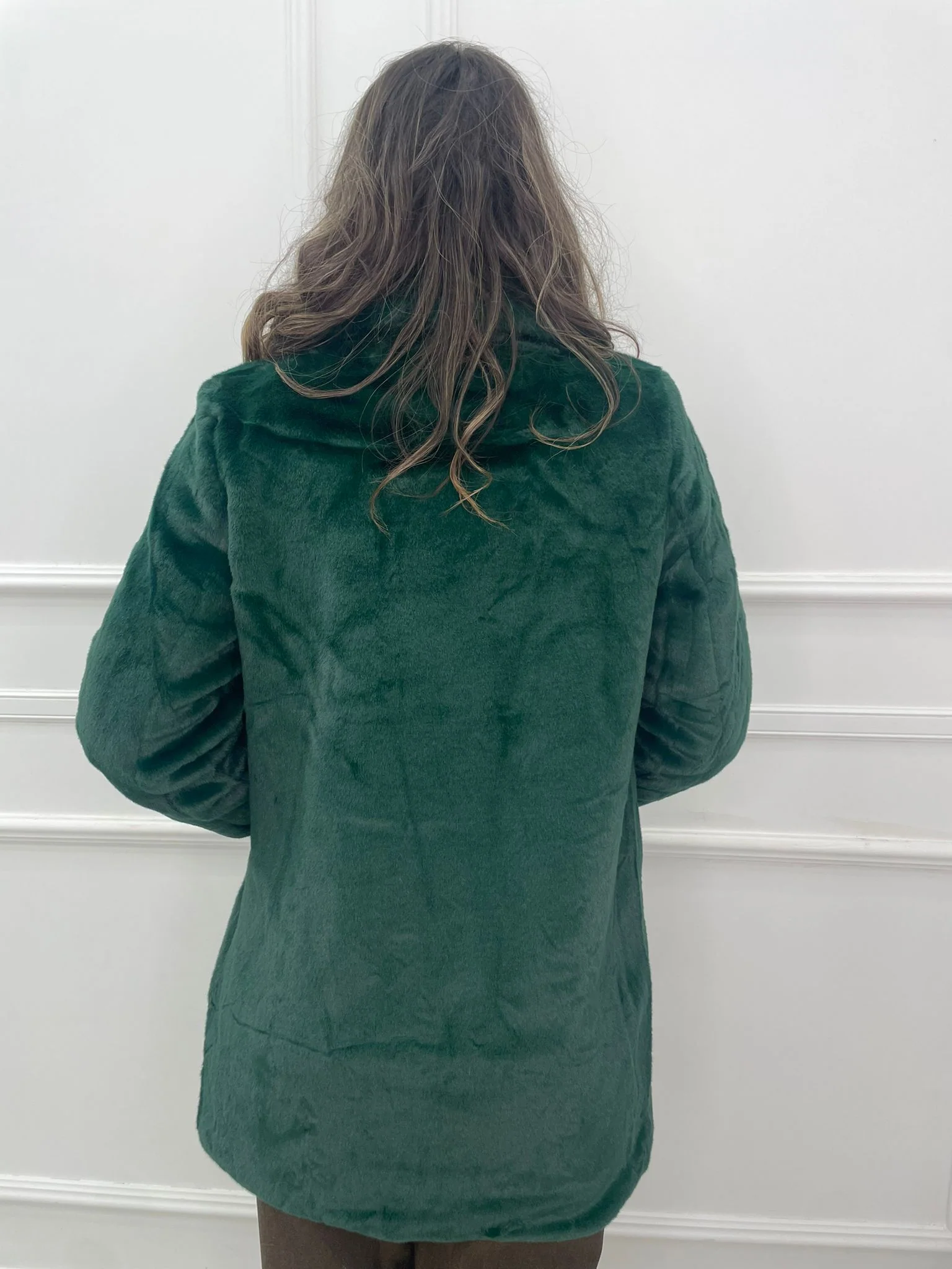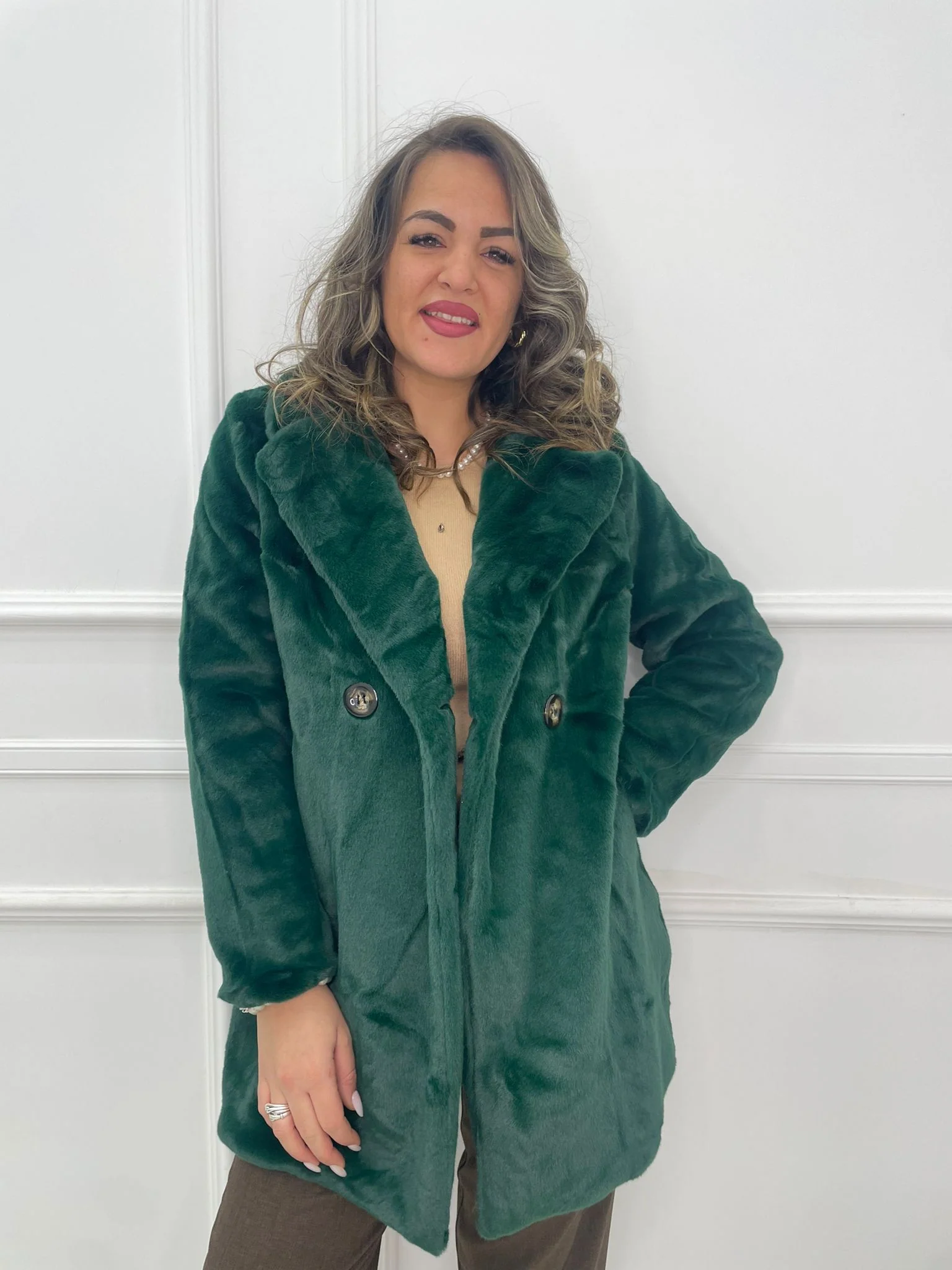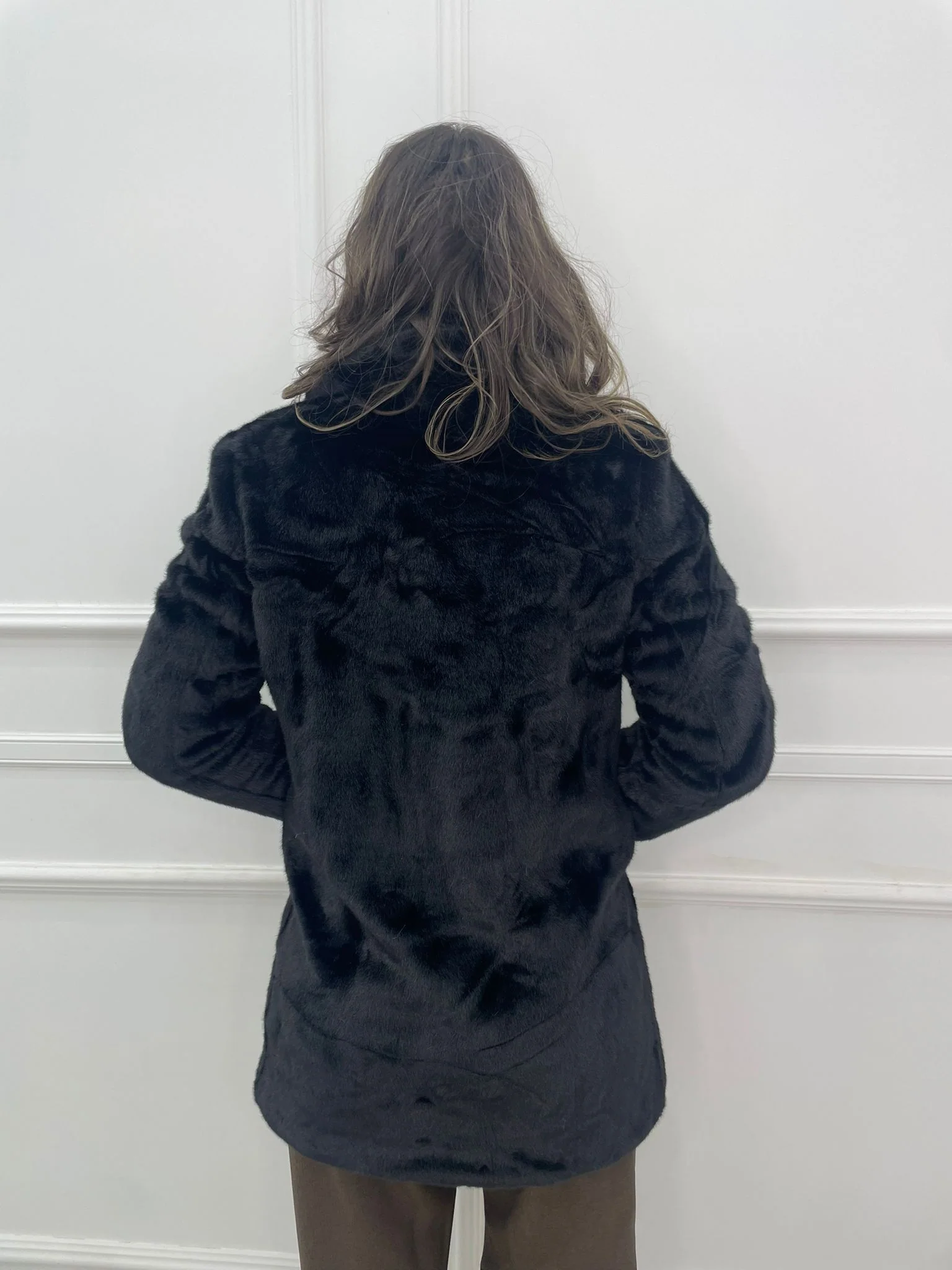 – Pelliccia eco tinta unita – Modello lungo – 2 bottoni – Tasche laaterali – Foderata – La modella รจ una taglia 44, alta 1,79m e indossa la taglia “L”