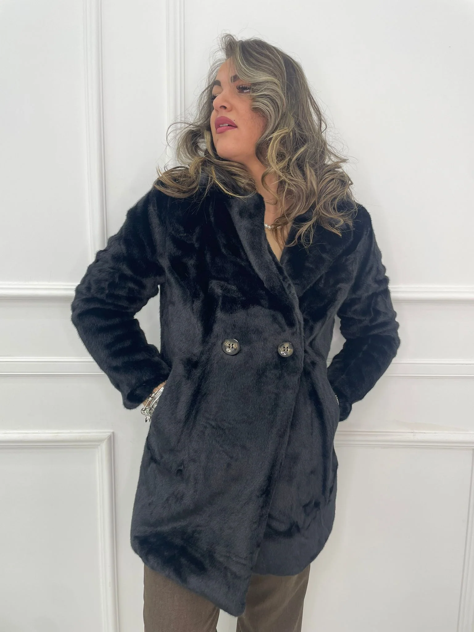 Pelliccia eco lunga finto doppio petto