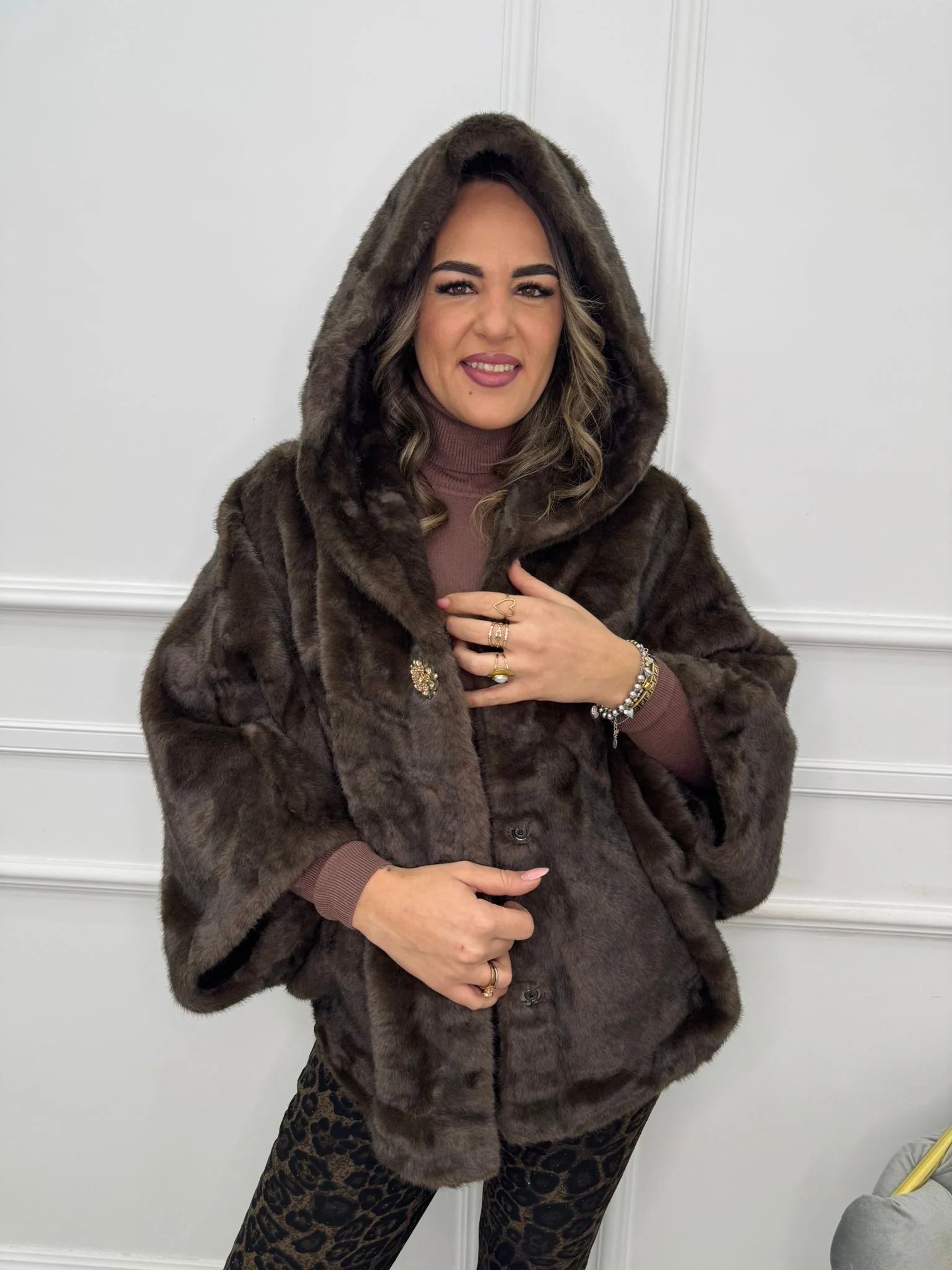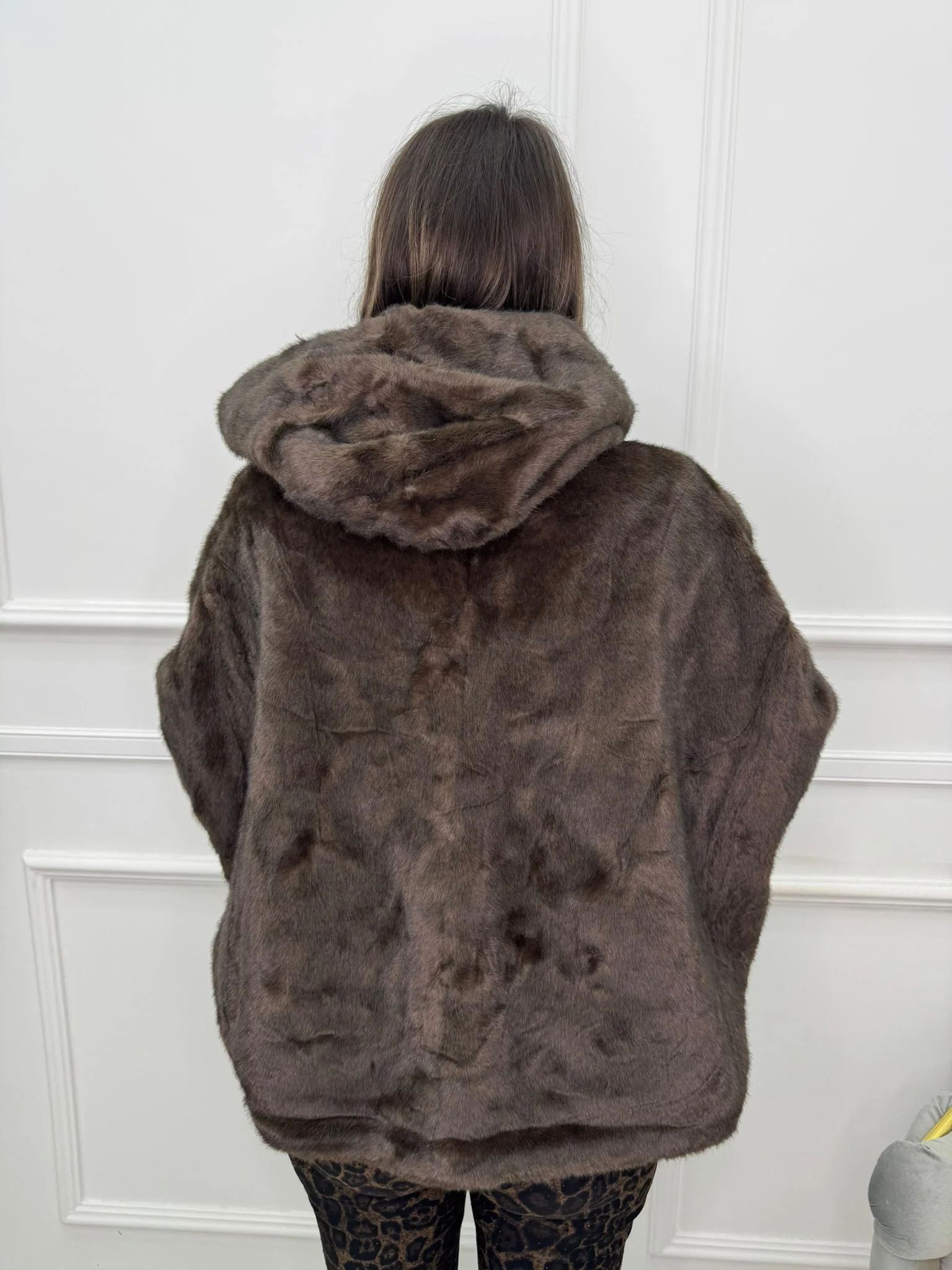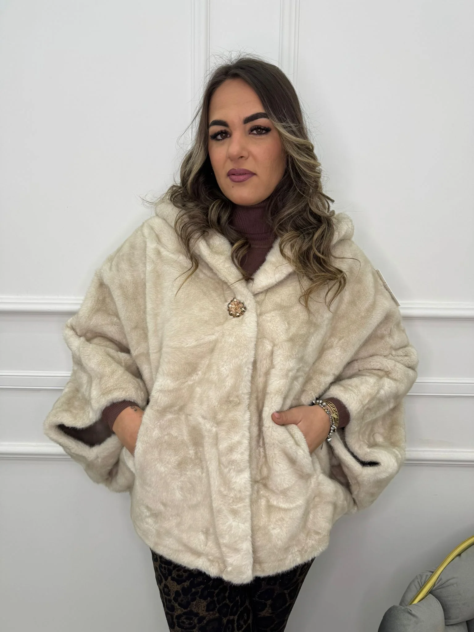 Pelliccia eco tinta unita Modello mantella con cappuccio Bottone gioiello Elasticizzata Veste tranquillamente fino ad una taglia “L” La modella รจ una taglia 44, alta 1,79m