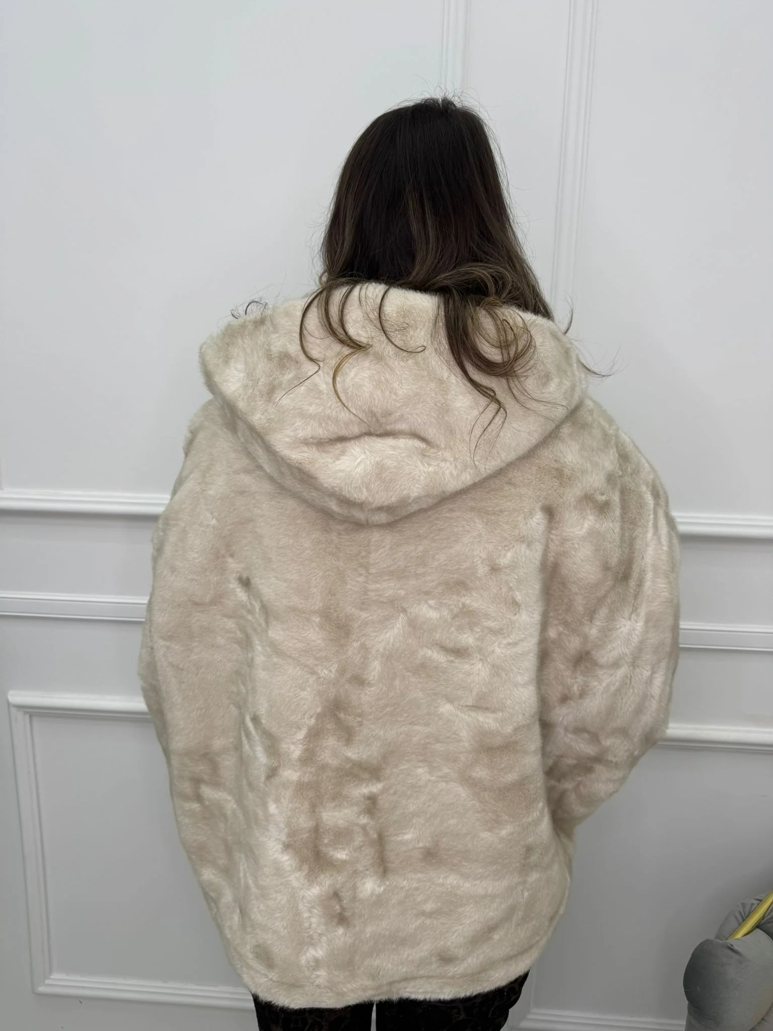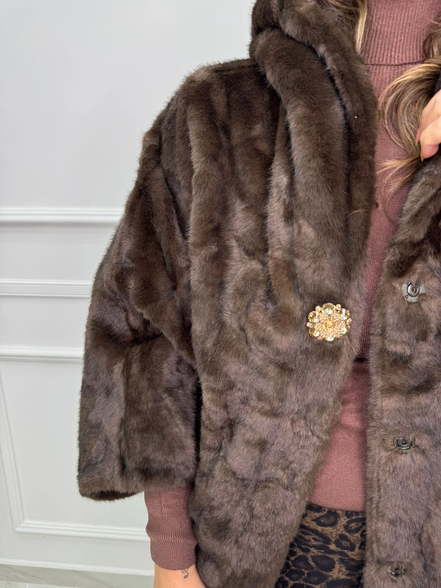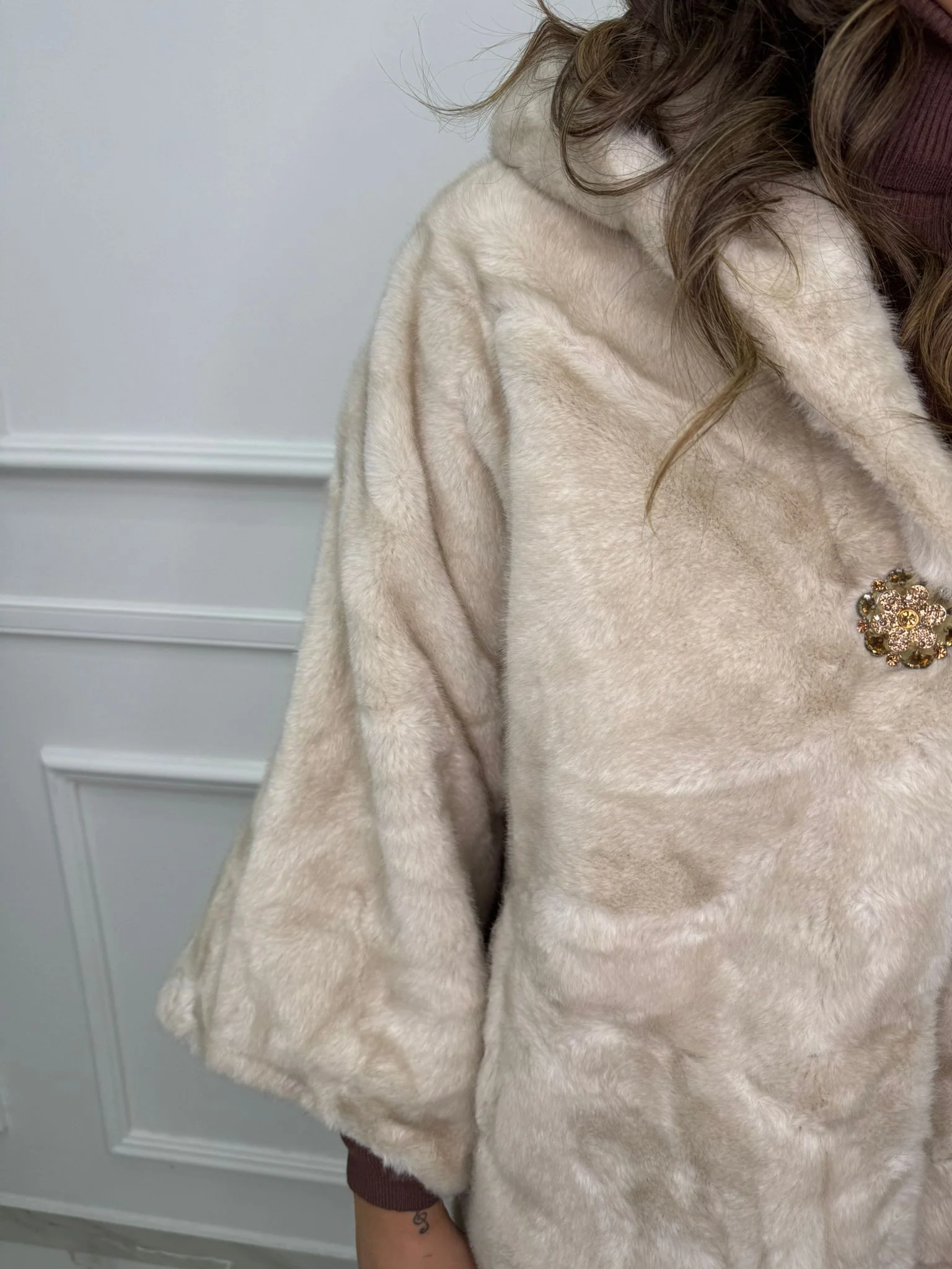 Pelliccia eco tinta unita Modello mantella con cappuccio Bottone gioiello Elasticizzata Veste tranquillamente fino ad una taglia “L” La modella รจ una taglia 44, alta 1,79m