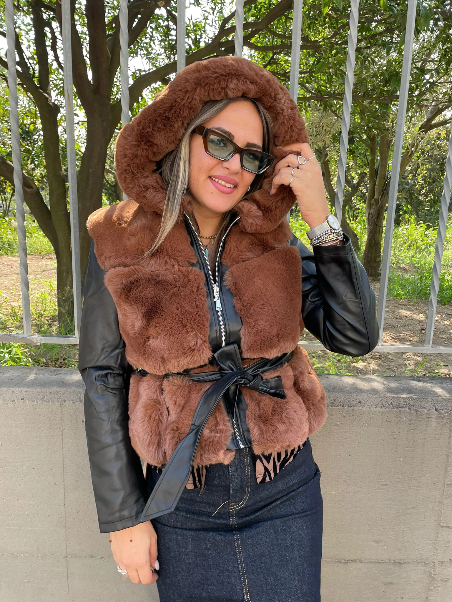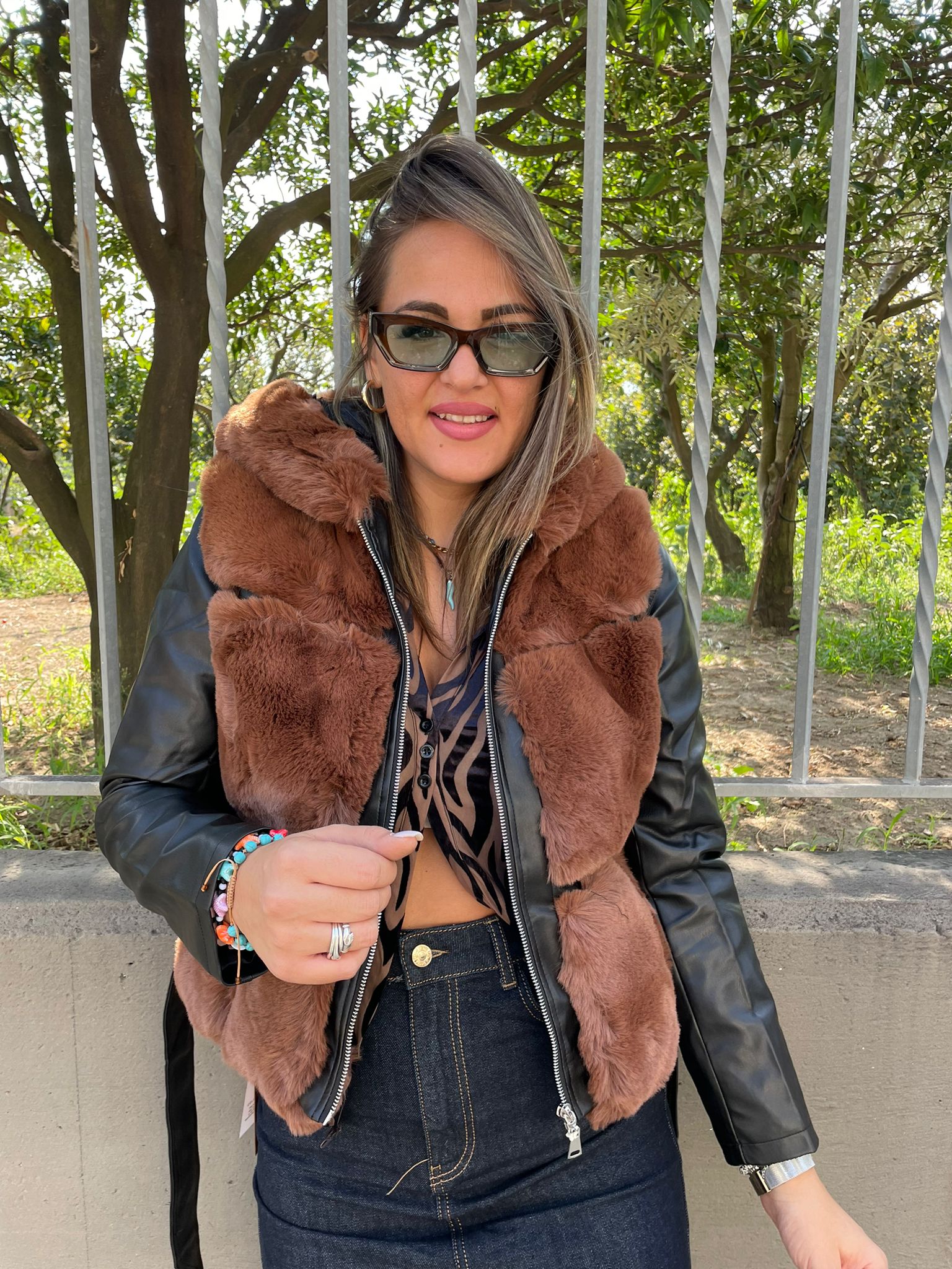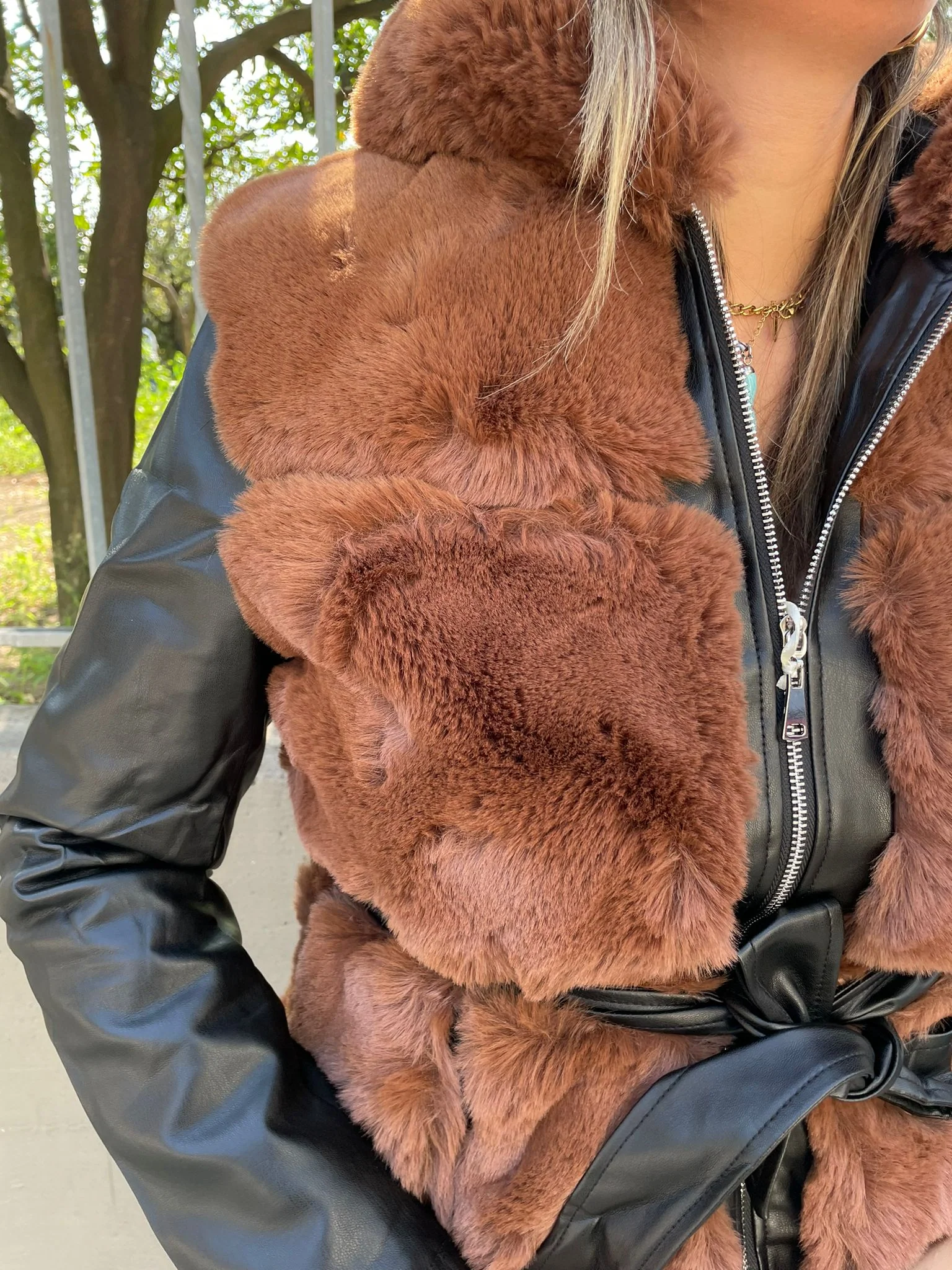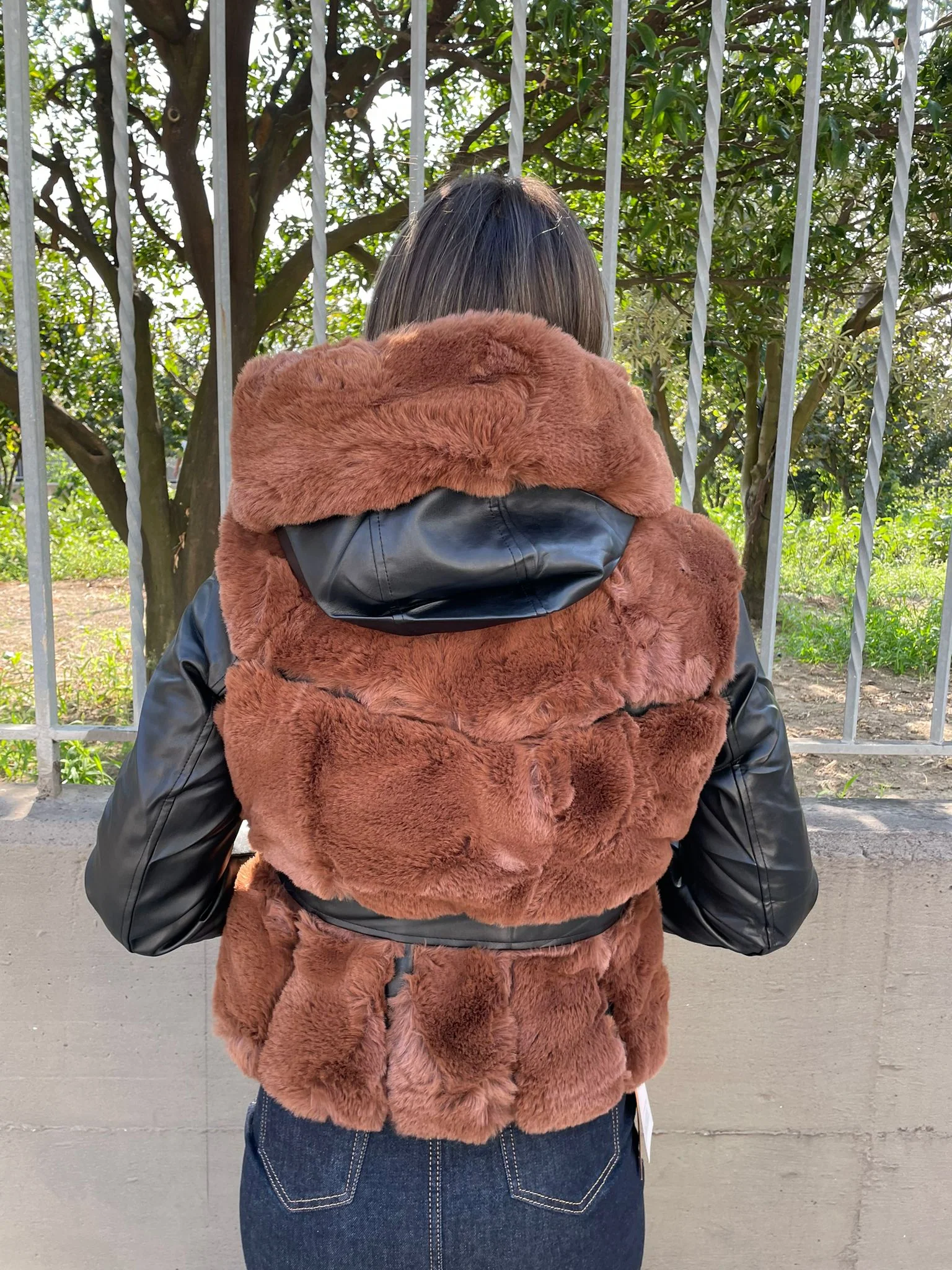 Pelliccia marrone con maniche eco pelle