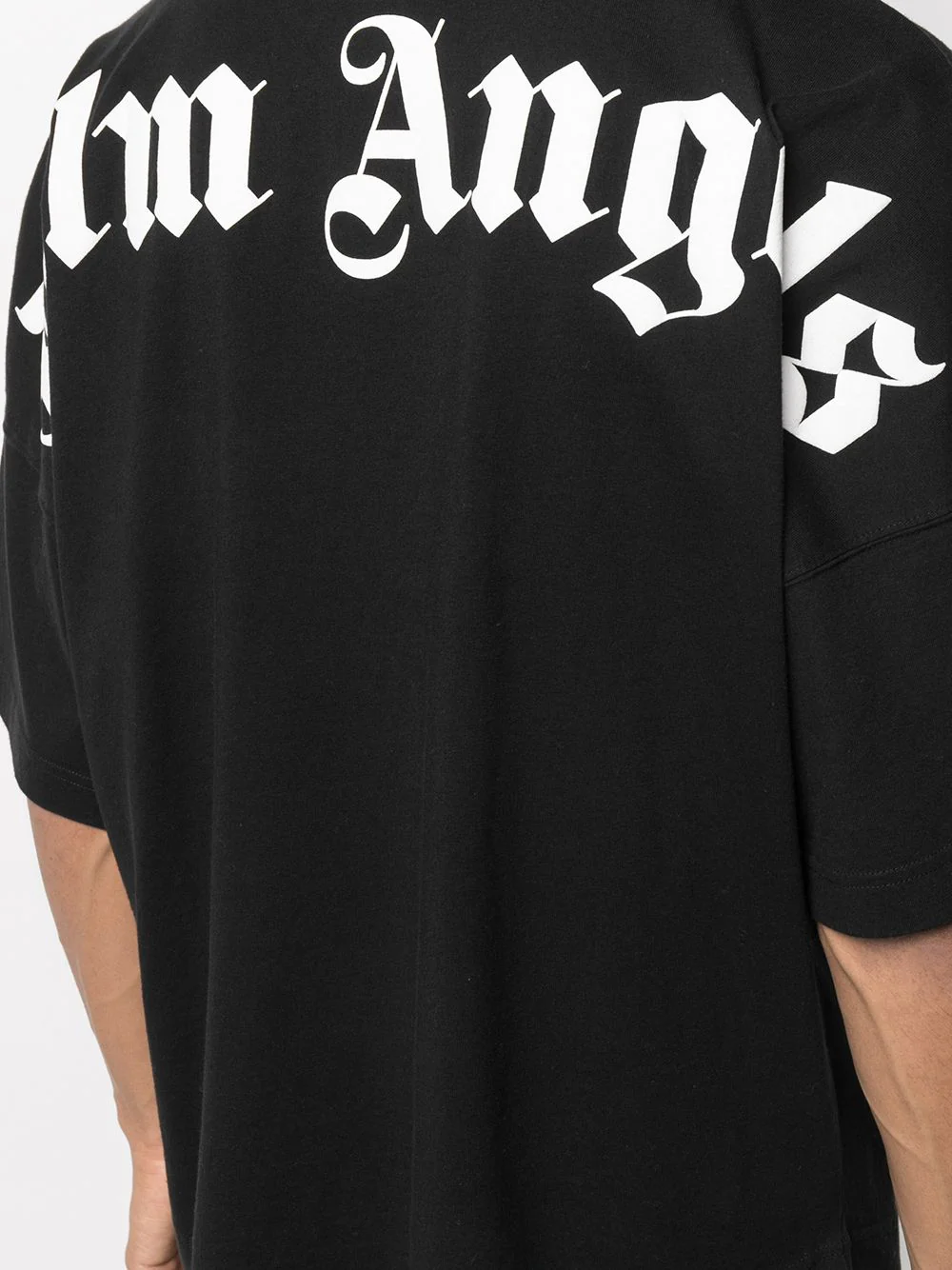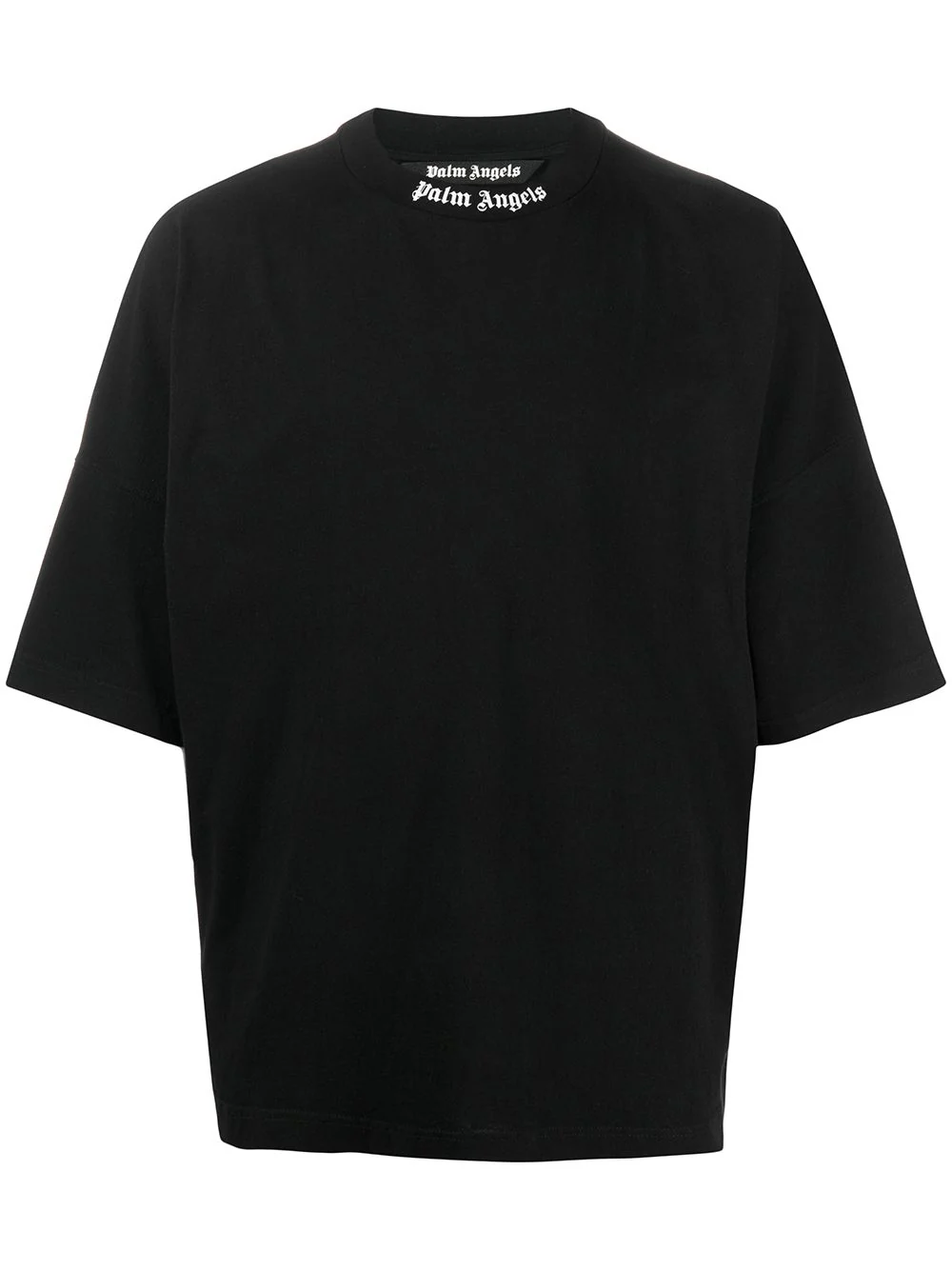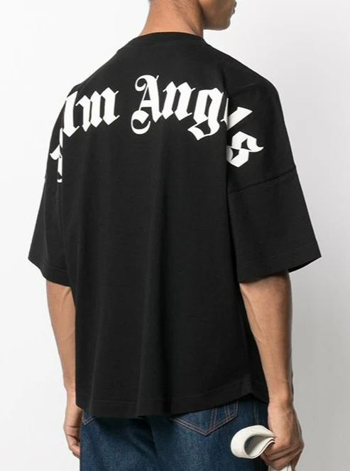 T-SHIRT A MANICHE CORTE IN COTONE NERO CON LOGO “PALM ANGELS” BIANCO STAMPATO SULLO SCOLLO E SUL RETRO. GIROCOLLO. VESTIBILITร OVERSIZE.