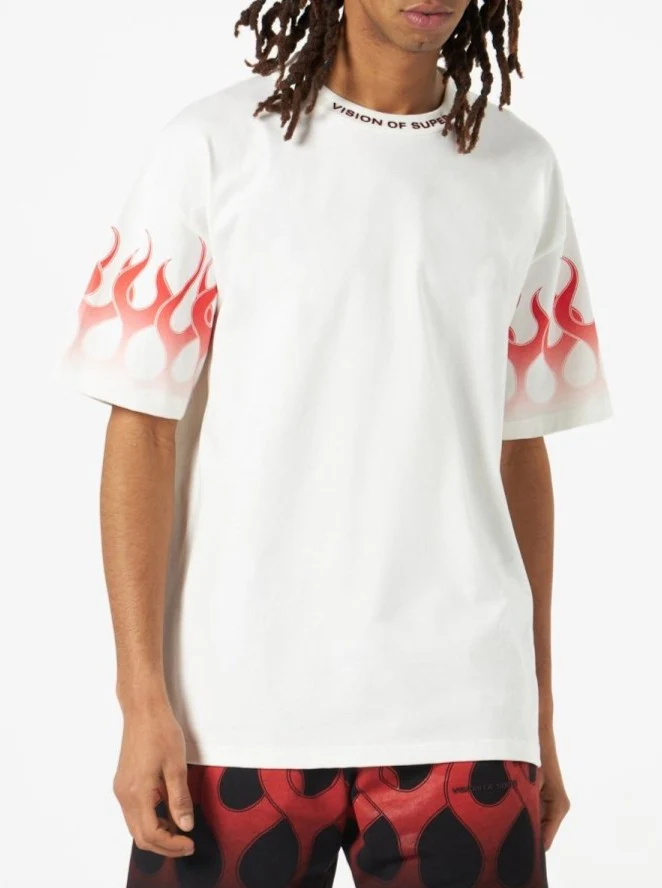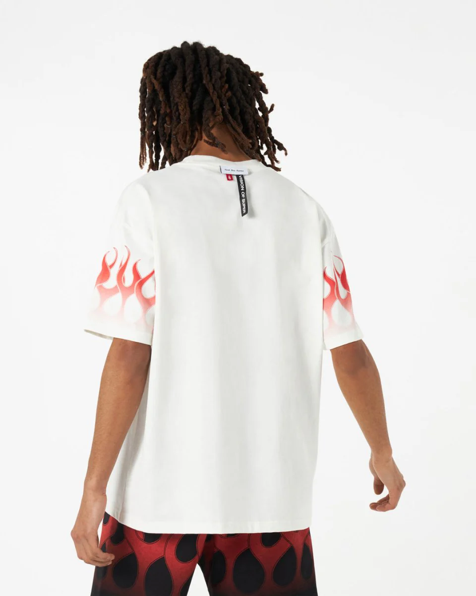 T-shirt bianca Vision of Super con fiamme rosse serigrafate. T-shirt oversize con una nuova versione delle iconiche fiamme sulle maniche. Il colore della stampa รจ sfumato. Logo mattone sul colletto.