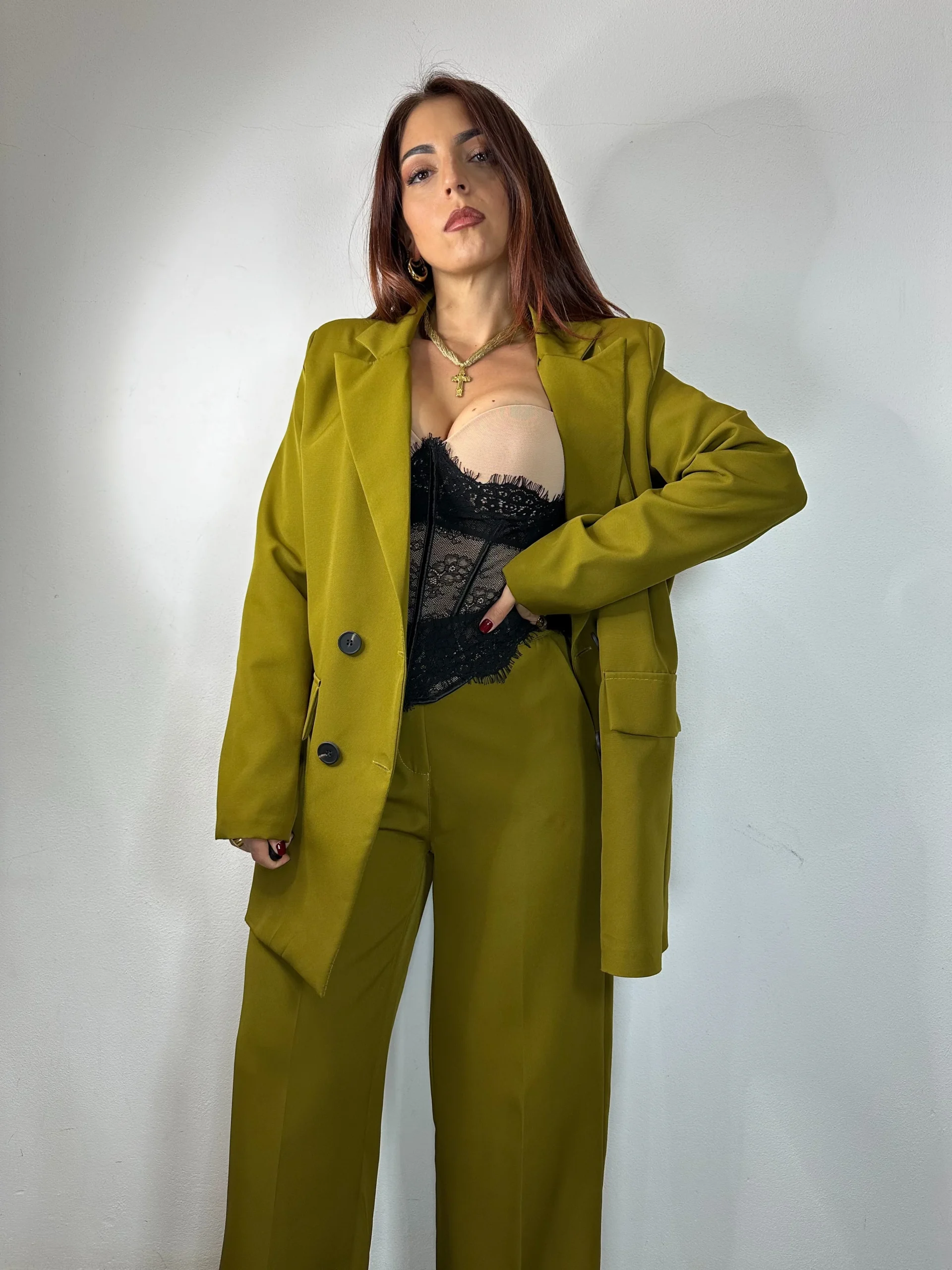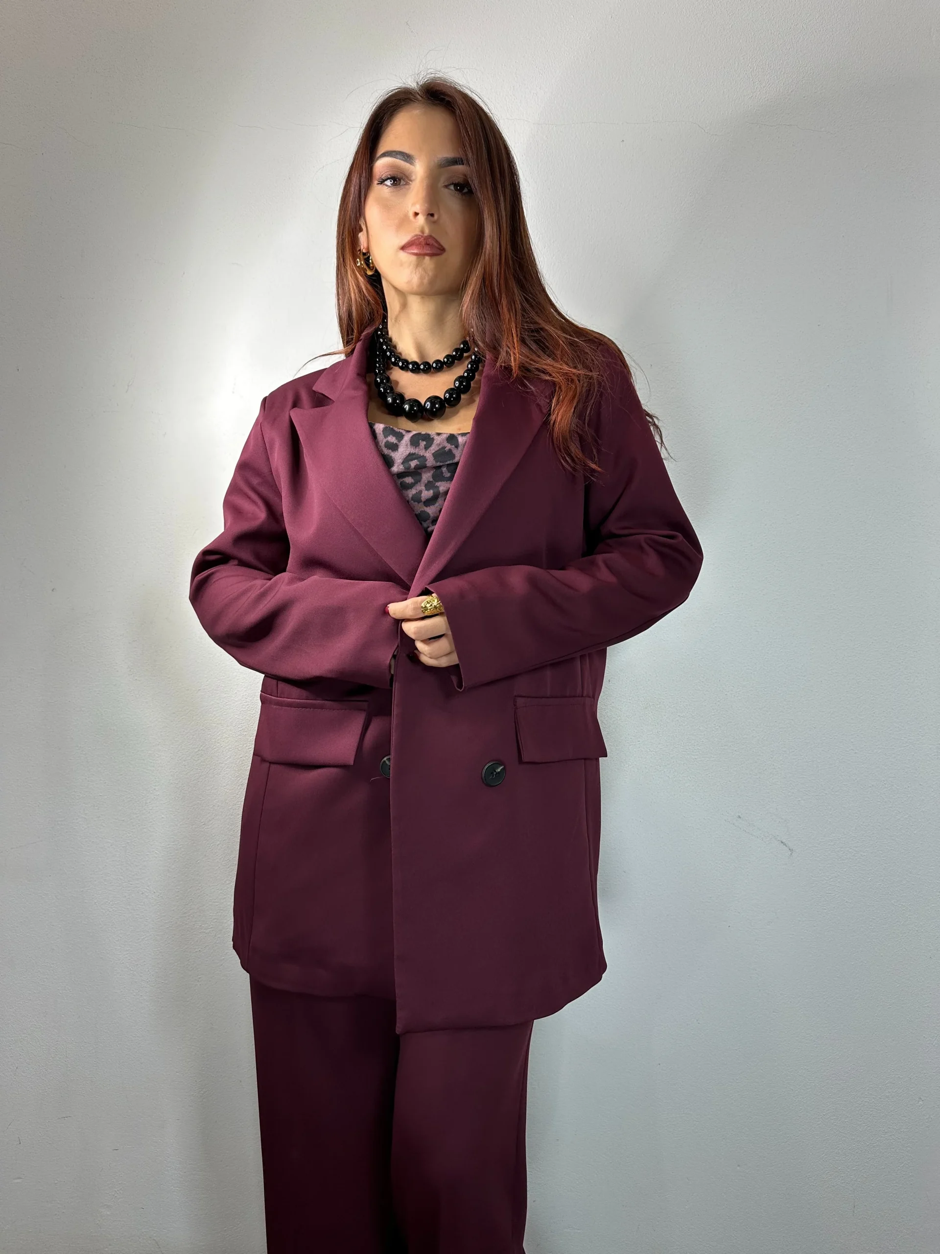 Tailleur composto da giacca a maniche lunghe doppiopetto con finte tasche sulla parte anteriore e 4 bottoni in nero. Pantalone ad alta vita a palazzo con cerniera, bottone ,passanti ,elastico sul retro e tasche. Spalline imbottite. Modello Over. Taglia Unica Veste da una S a una XL