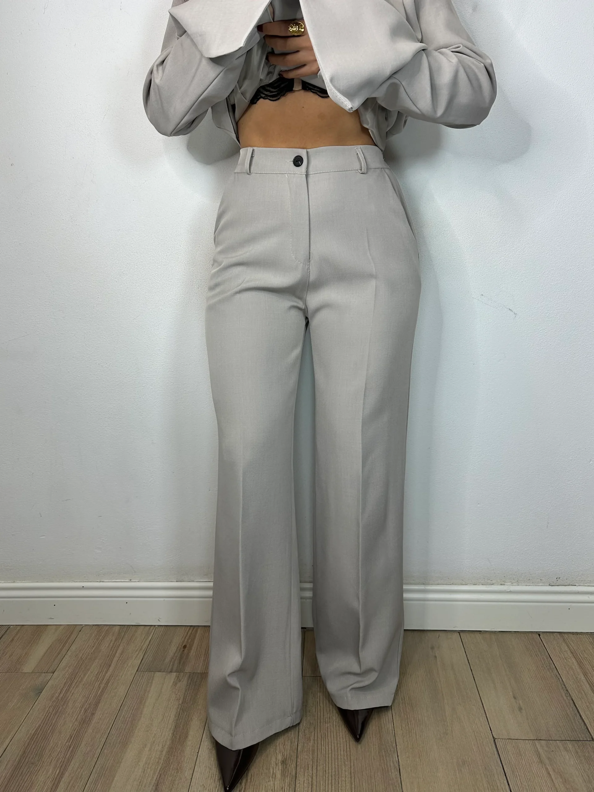 Pantalone ad alta vita a palazzo con cerniera, bottone ,passanti ,elastico sul retro e tasche.