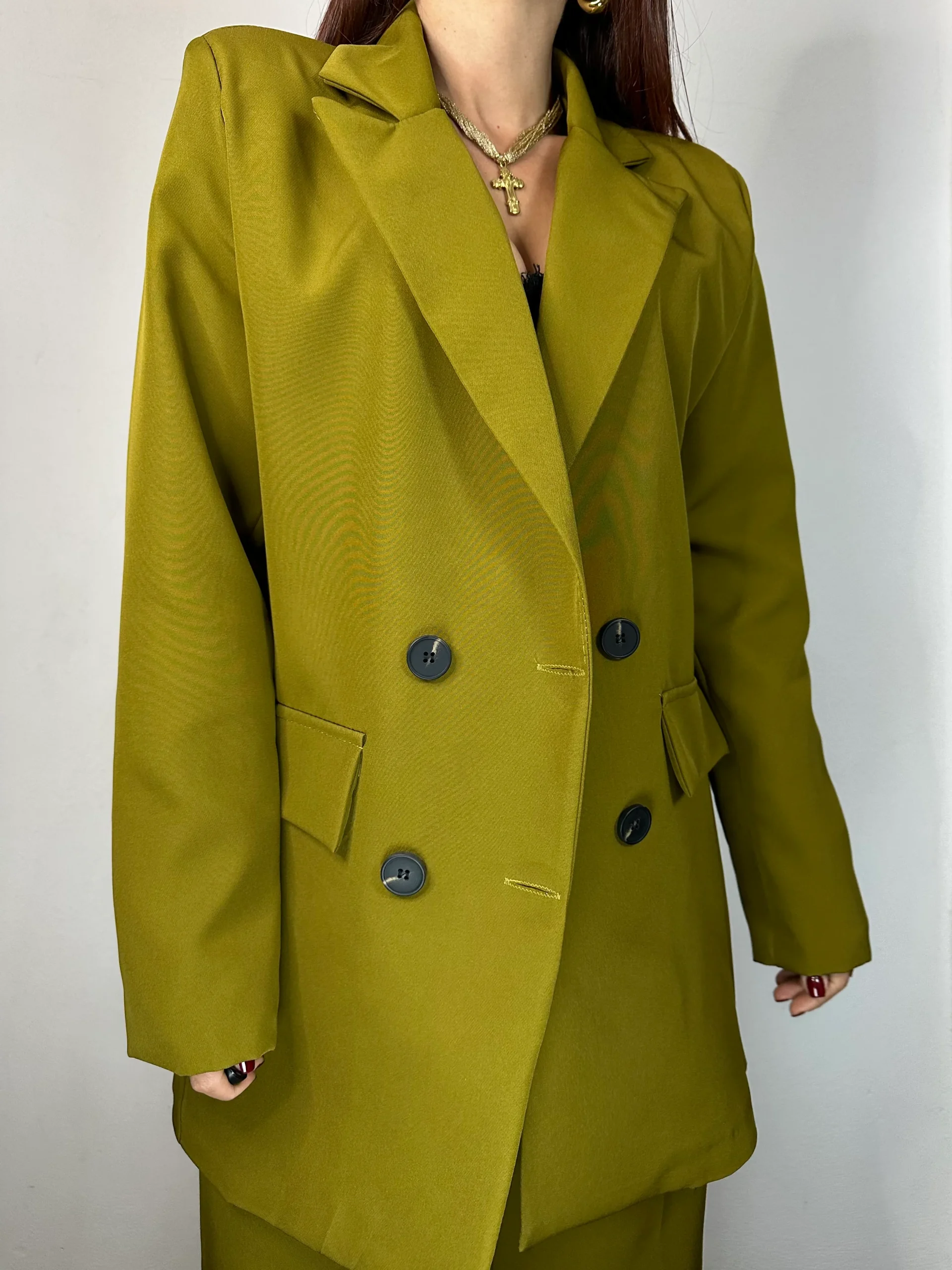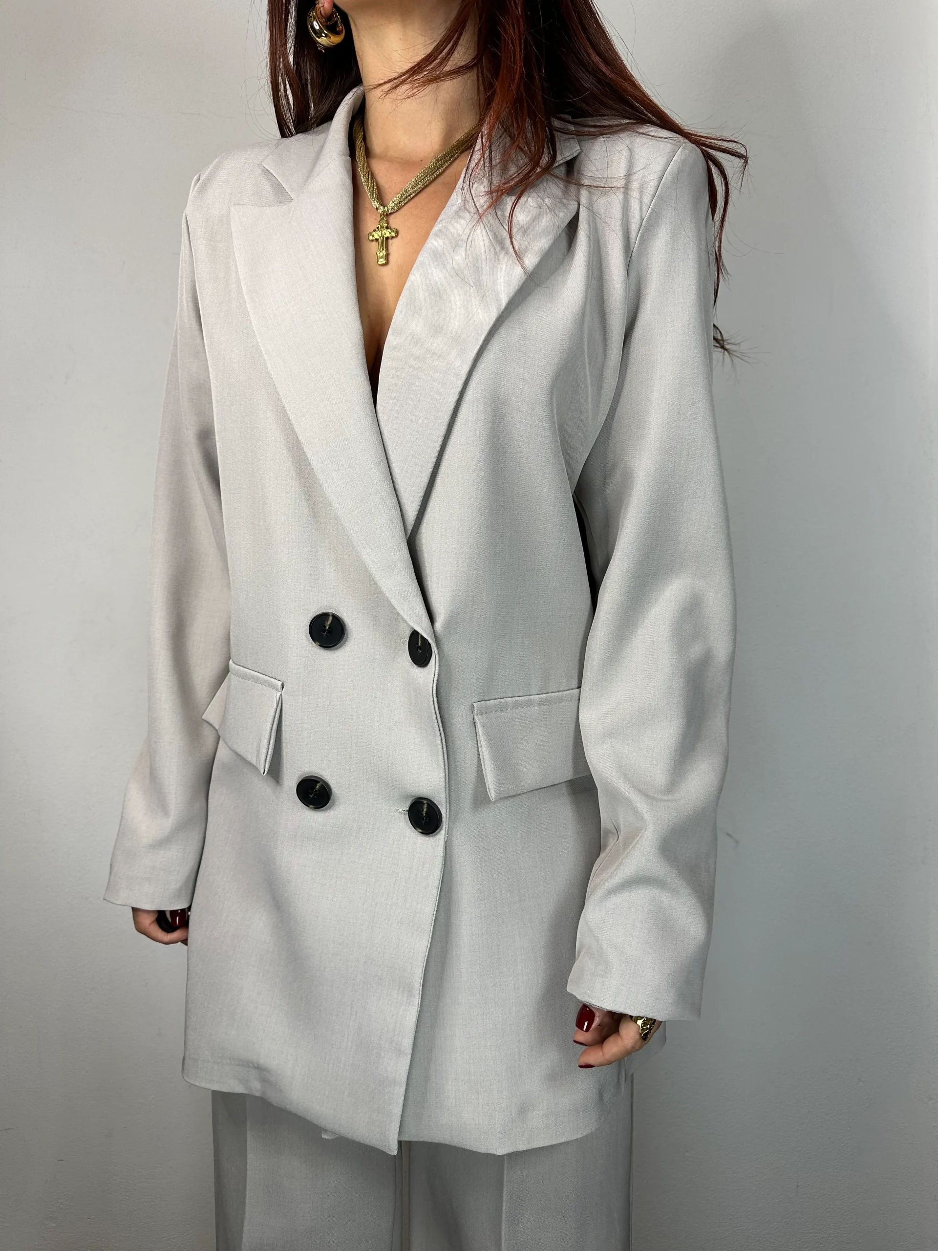 Tailleur composto da giacca a maniche lunghe doppiopetto con finte tasche sulla parte anteriore e 4 bottoni in nero.