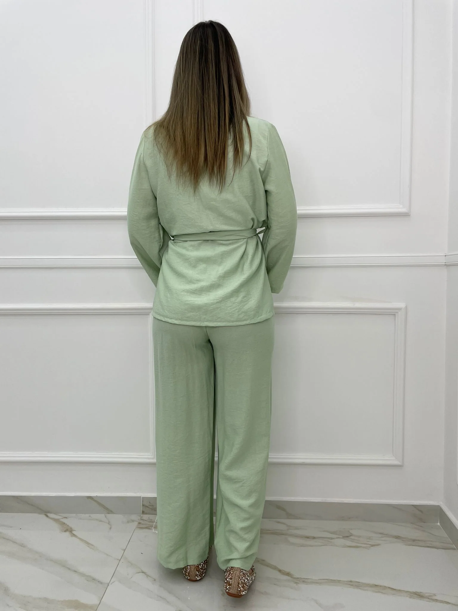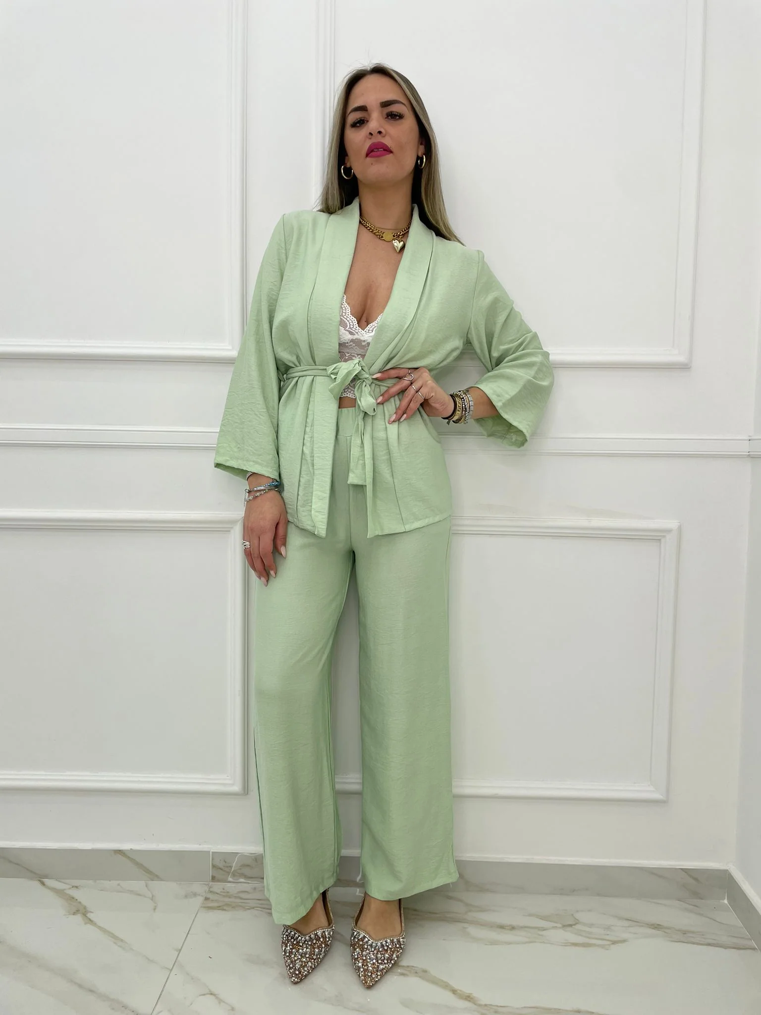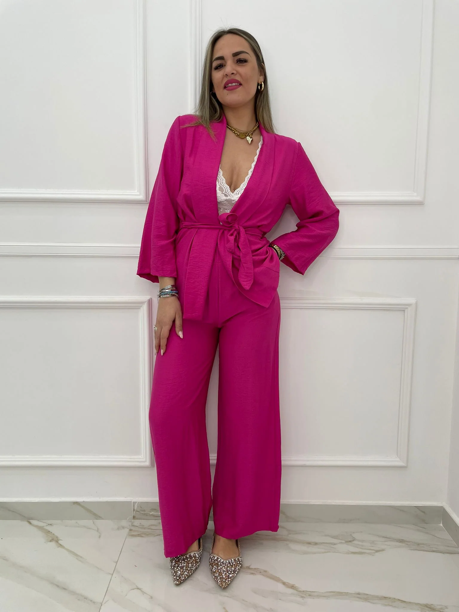Tailleur tinta unita Giacca sciallata con cintura regolabile Pantalone palazzo con elastico in vita Elasticizzato Veste tranquillamente fino ad una taglia “L” La modella รจ una taglia 44, alta 1,79m Tessuto: poliestere, elastan
