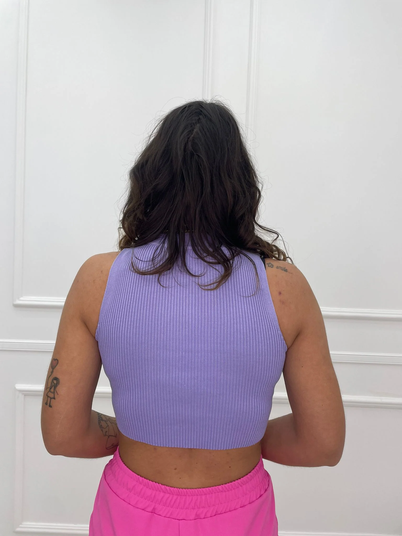 – Top a costine – Tinta unita – Lacci swarovski avanti – Elasticizzato – Veste tranquillamente fino ad una taglia “L” – Tessuto: viscosa, elastan
