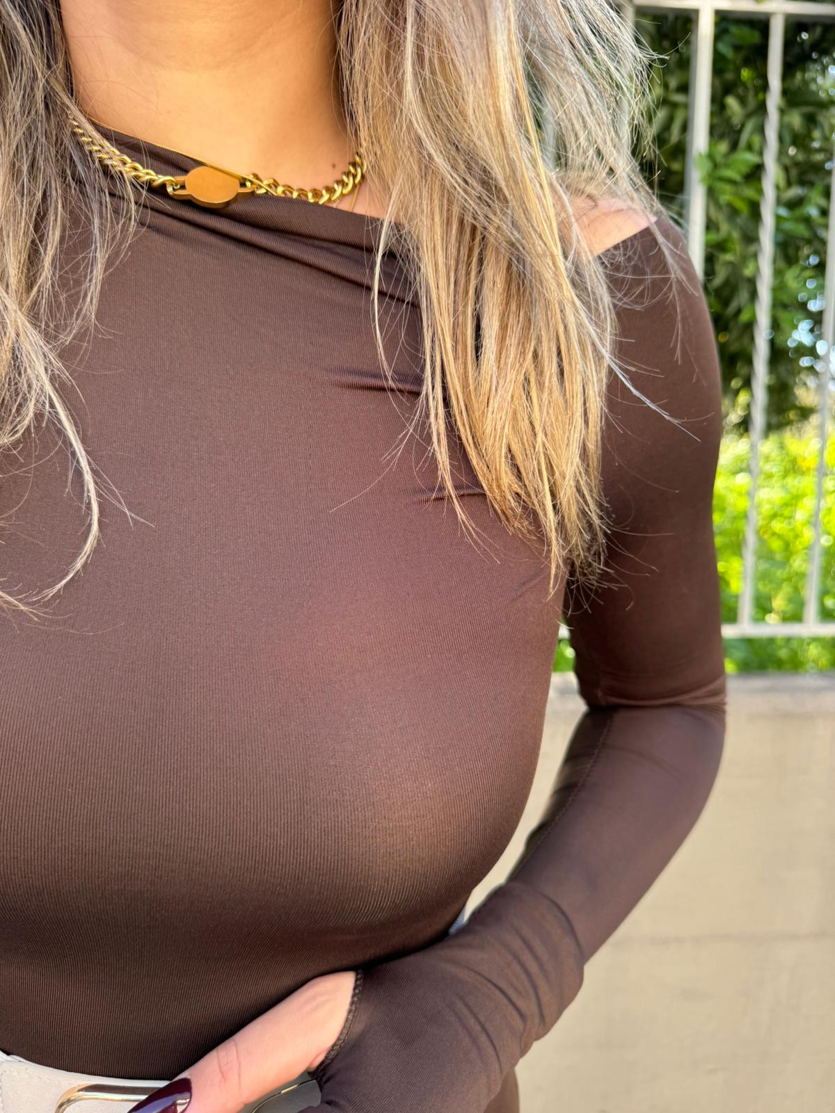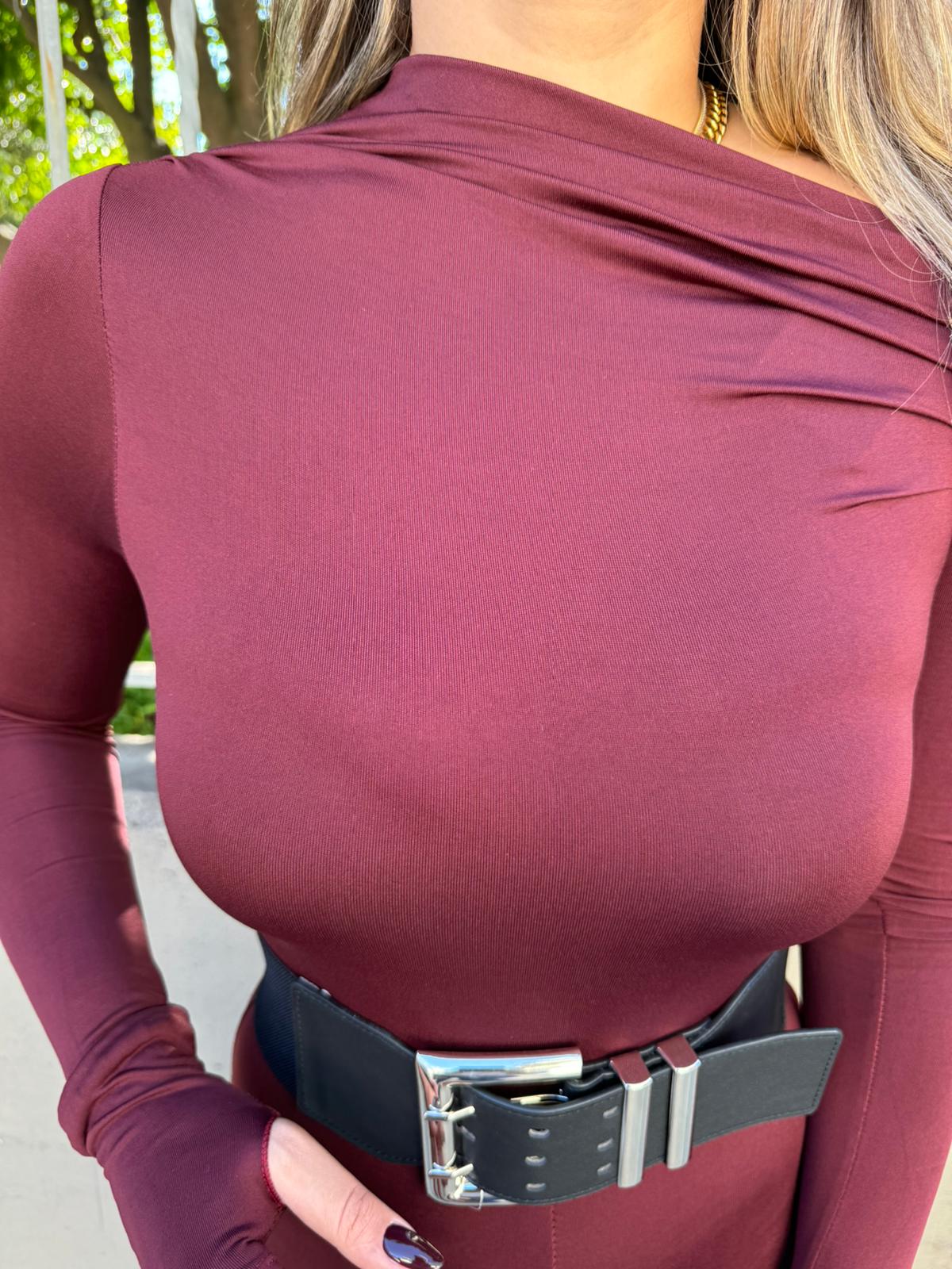 Tuta lunga in lycra Tinta unita Drappeggio sulla spalla Elasticizzata Veste fino ad una taglia “L” La modella รจ una taglia 44, alta 1,79m Tessuto: poliestere, elastan